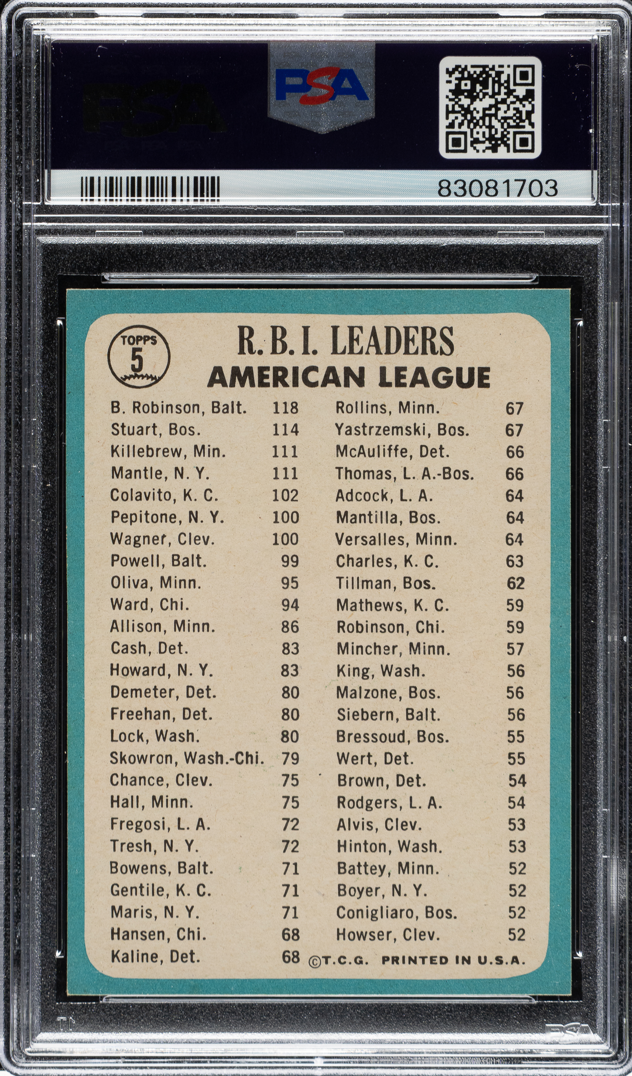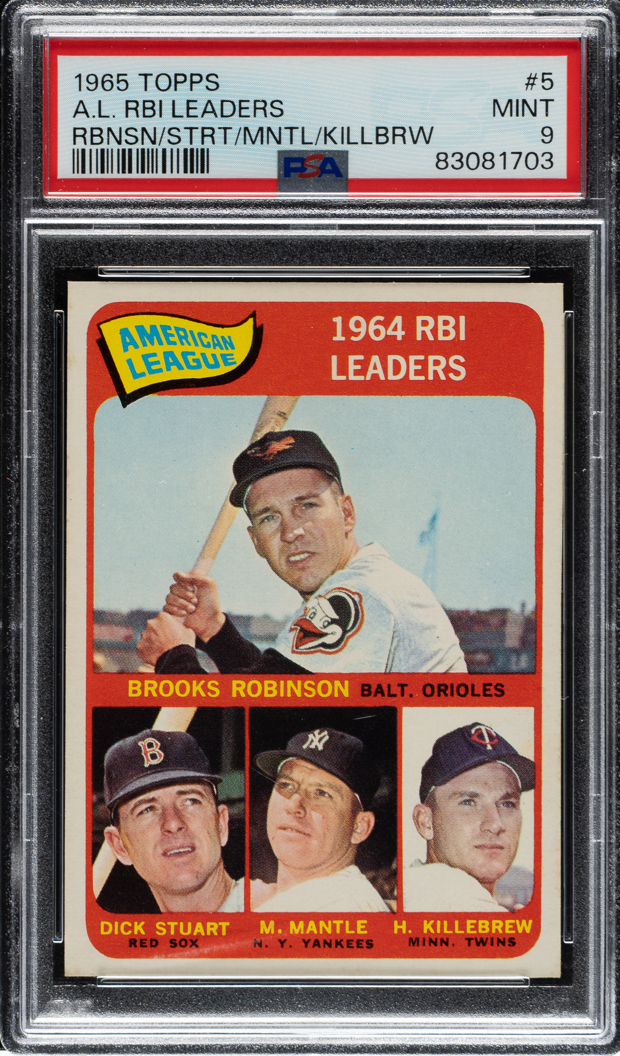 Graded MINT 9 by PSA. Minnesota Twins, Baltimore Orioles and New York Yankees Hall of Famers Harmon Killebrew, Brooks Robinson, and Mickey Mantle.