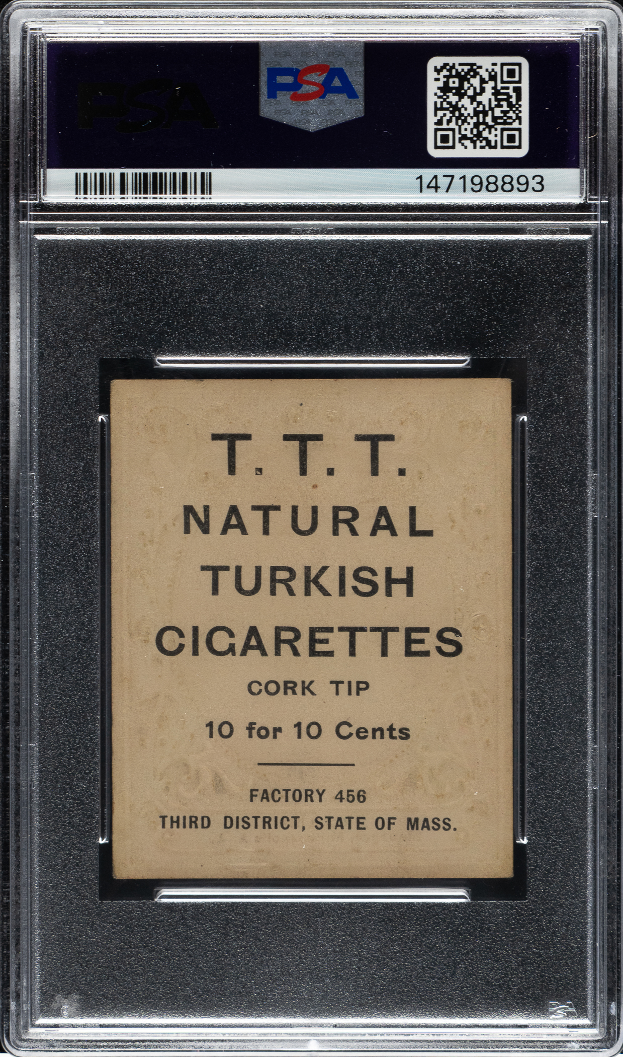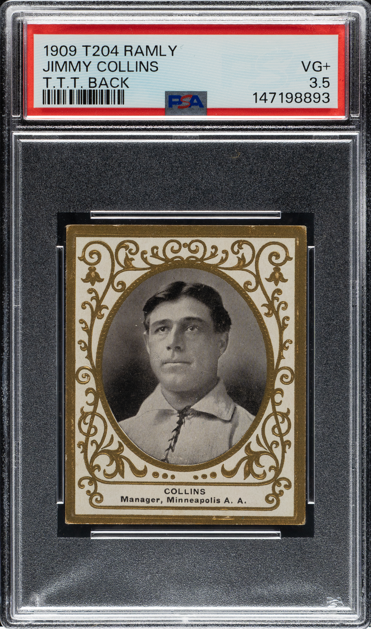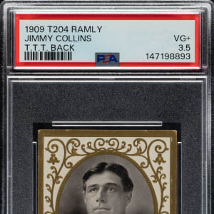 Graded VG+ 3.5 by PSA (submitted by REA). Outstanding mid-grade T204 Ramly "T.T.T. Cigarettes" advertising card of Hall of Famer Jimmy Collins (identified as manager of the Minneapolis Millers from the American Association). All T.T.T. backs are extremely rare, especially those featuring a Hall of Famer. The important T.T.T. back is lightly toned with bold black text. This card is part of an exciting, fresh-to-the-hobby find of T204 Ramly cards that were saved by the family of the original owner who lived in the New England area, all consigned to REA's Spring 2026 and future auctions.