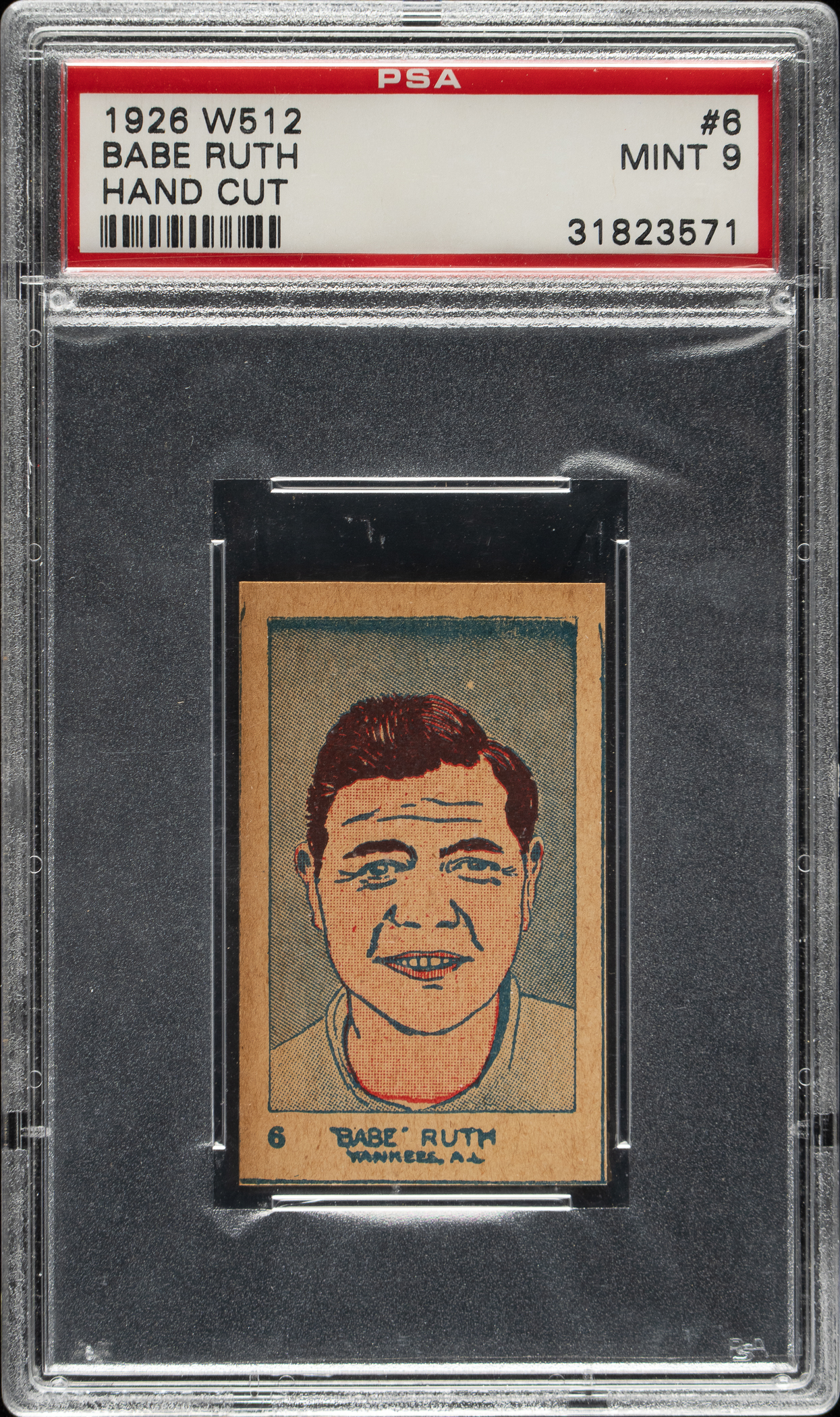 Graded MINT 9 by PSA. One of only two examples graded at this level by PSA with none higher! Stunning ultra-high-grade example of #6 Babe Ruth from the 1926 W512 strip-card series. Originally issued in strips, these cards (and almost all strip-cards) are often found with irregular borders as they were cut by hand from the strips, as intended. Only ideally cut examples (like this one) are awarded numerical grades by grading companies. The offered card is exceptional in every way, with bright colors, a crisp image, and four sharp corners. The blank back is clean. This is a superb example of one of Babe Ruth's most classic 1920s strip-cards and one that would be a significant addition to any Ruth, strip-card, or prewar-card collection.