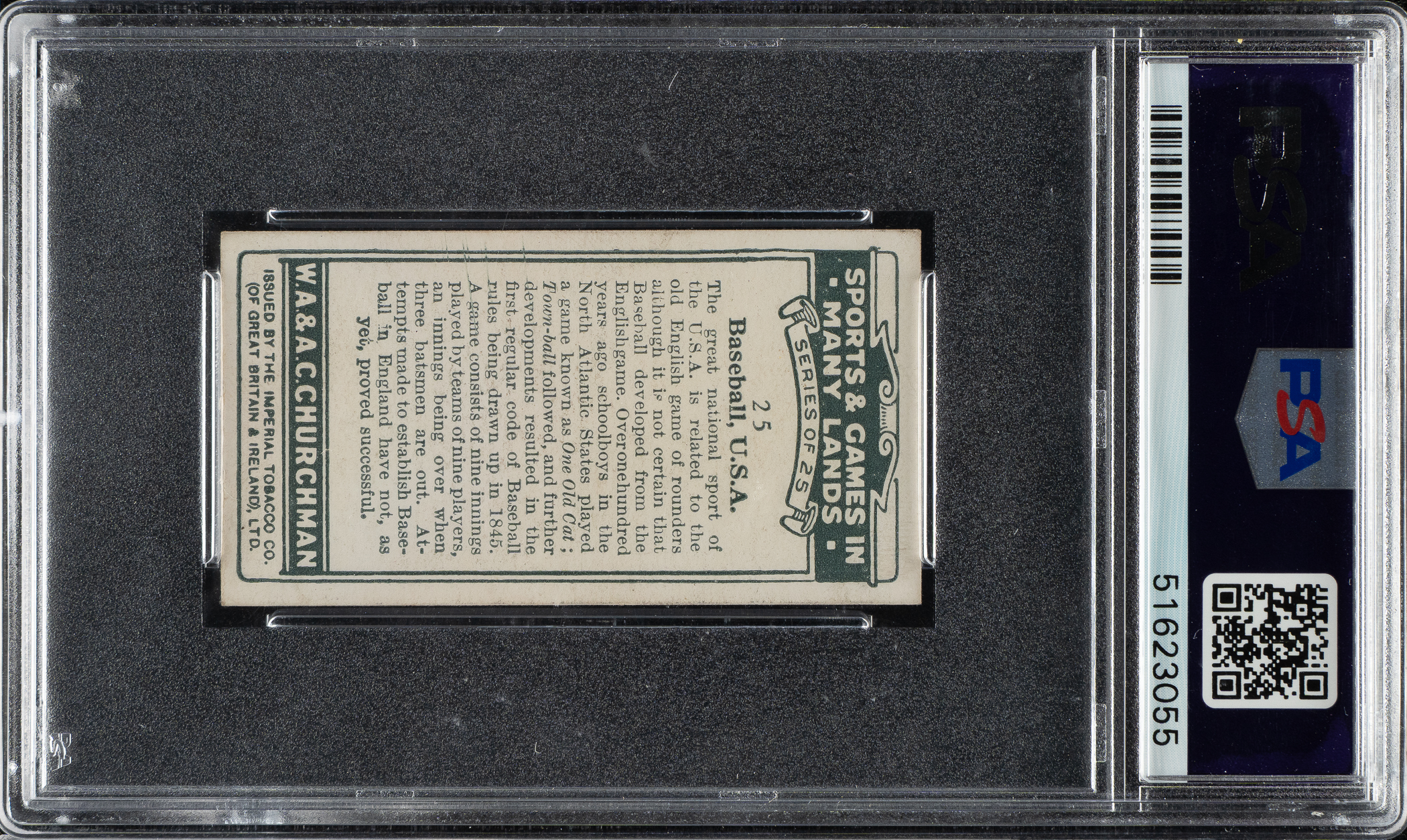 Graded NM-MT 8 by PSA. Extremely attractive high-grade example of #25 Babe Ruth from the "Sports & Games In Many Lands" set issued by Imperial Tobacco Co. with its W. A. & A. C. Churchman tobacco brand. Issued in England, this beautiful full-color tobacco issue of 25 different subjects includes representation of all types of athletes (boxing, football, tennis, track, etc.). Ruth is the only representative of American baseball. The card features a full-color scene of Ruth in a swinging follow-through pose, with a short description of the scene on the reverse. It is interesting to note this card was produced with the same image as the Shonen Club Japanese postcard. This card has vibrant colors, outstanding registration, strong corners, and excellent centering. Clean reverse. Few cards of Ruth date from the 1920s. This extremely unusual, high-grade Babe Ruth card represents a remarkable value in comparison to gum cards of him from the 1930s.