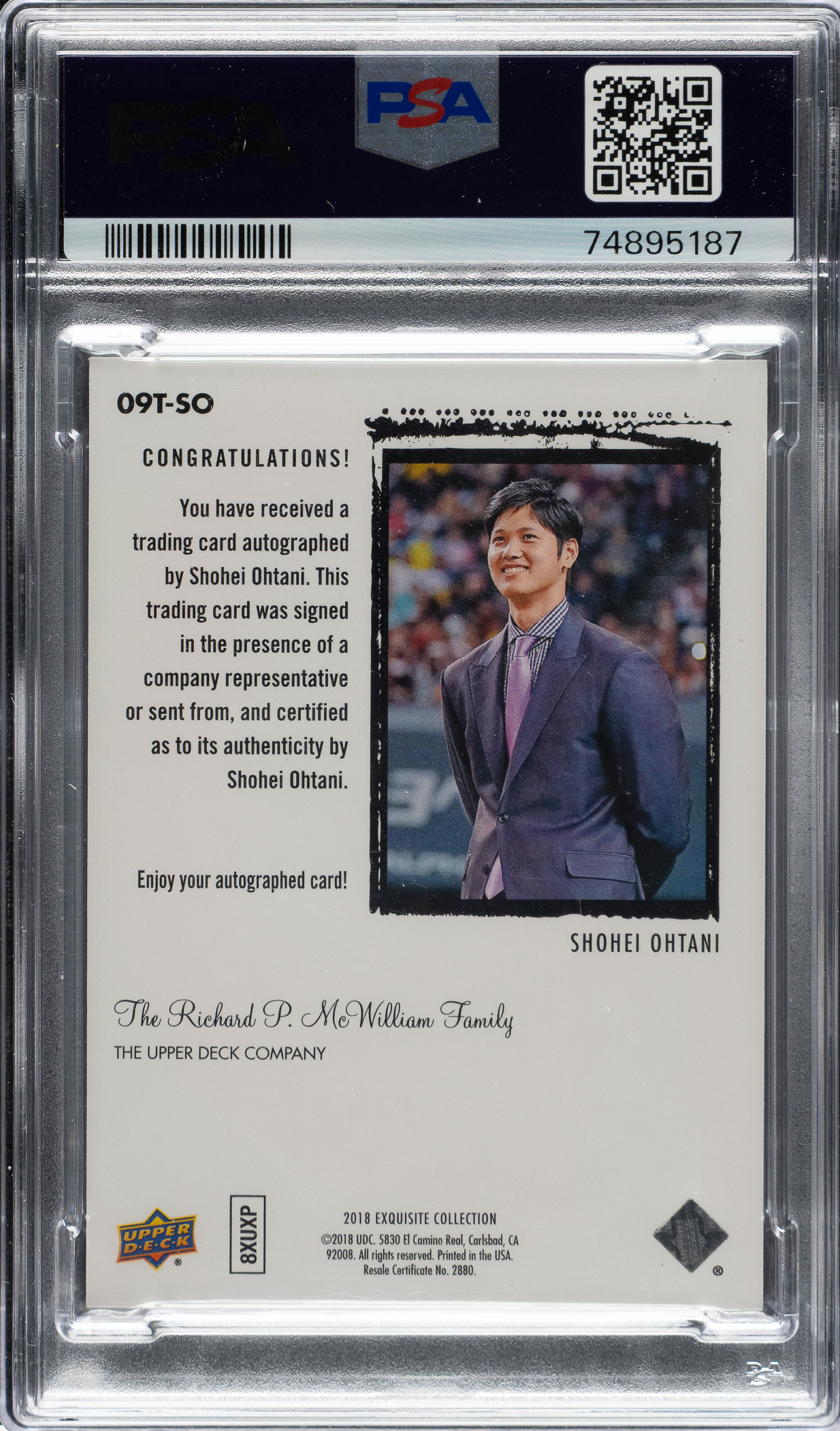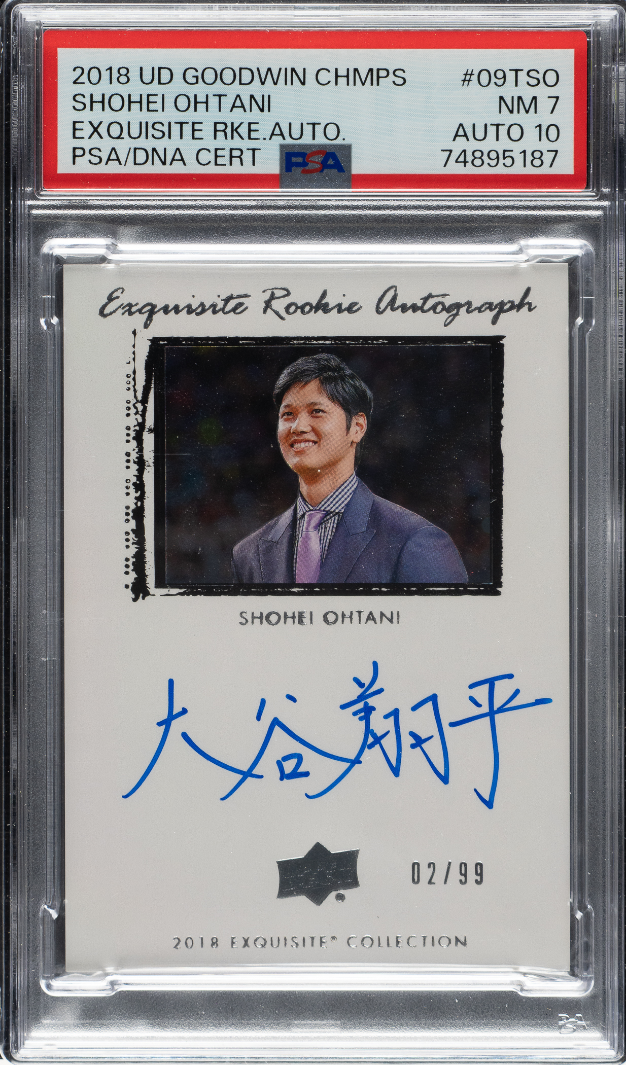 Outstanding high-grade rookie card of superstar Shohei Ohtani from the 2018 Upper Deck Goodwin Champions Exquisite Rookie series. PSA/DNA has graded the card NM 7 and the signature GEM 10. Ohtani has signed his name on the front of the card in Kanji in blue fine-point marker. Numbered 2/99 on the front. A four-time league MVP and two-time World Series champion, Ohtani is universally considered one of the greatest and most unique talents the sport has ever seen. This is a superb signed rookie card rarity featuring this prodigious superstar.