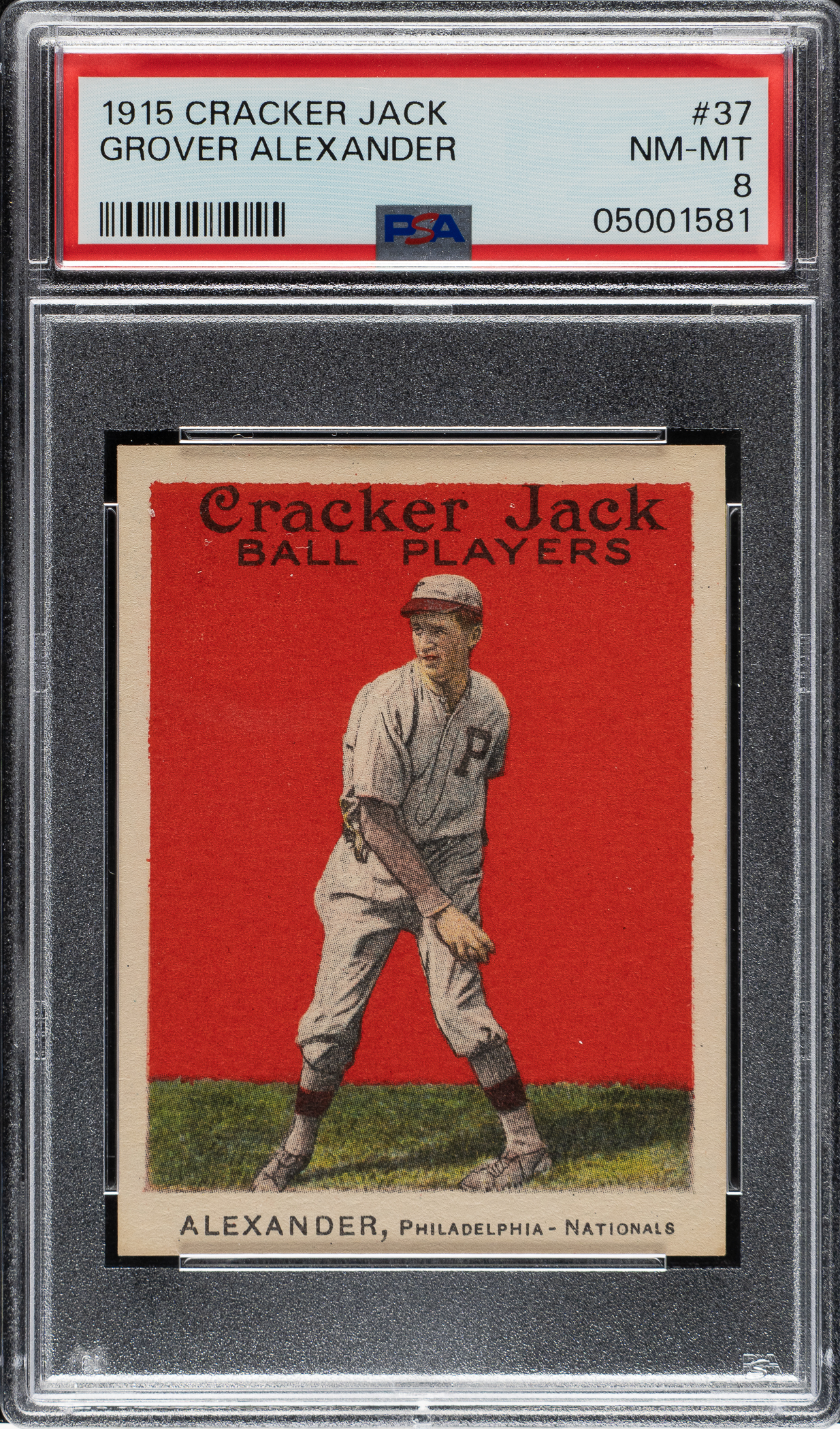 Graded NM-MT 8 by PSA. Only two examples have been graded higher by PSA to date. Stunning example of Philadelphia Phillies Hall of Famer Grover Alexander from the classic 1915 Cracker Jack series. This has always been one of Alexander’s most striking and popular cards. The offered card boasts a particularly vibrant red background, clean white borders, strong corners, and excellent centering. The reverse is also exceptionally bright and clean with crisp, bold black text. This card obviously originates from an original "factory set" obtained by mail directly from the company as it is entirely absent of any hints of the caramel staining so frequently encountered with these cards. Cracker Jacks are universally recognized as one of the most highly prized and widely collected of all prewar sets. This is a particularly extraordinary high-grade 1915 Cracker Jack example of Grover Alexander, one of baseball's greatest pitchers, from one of card collecting's most classic and popular sets.