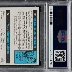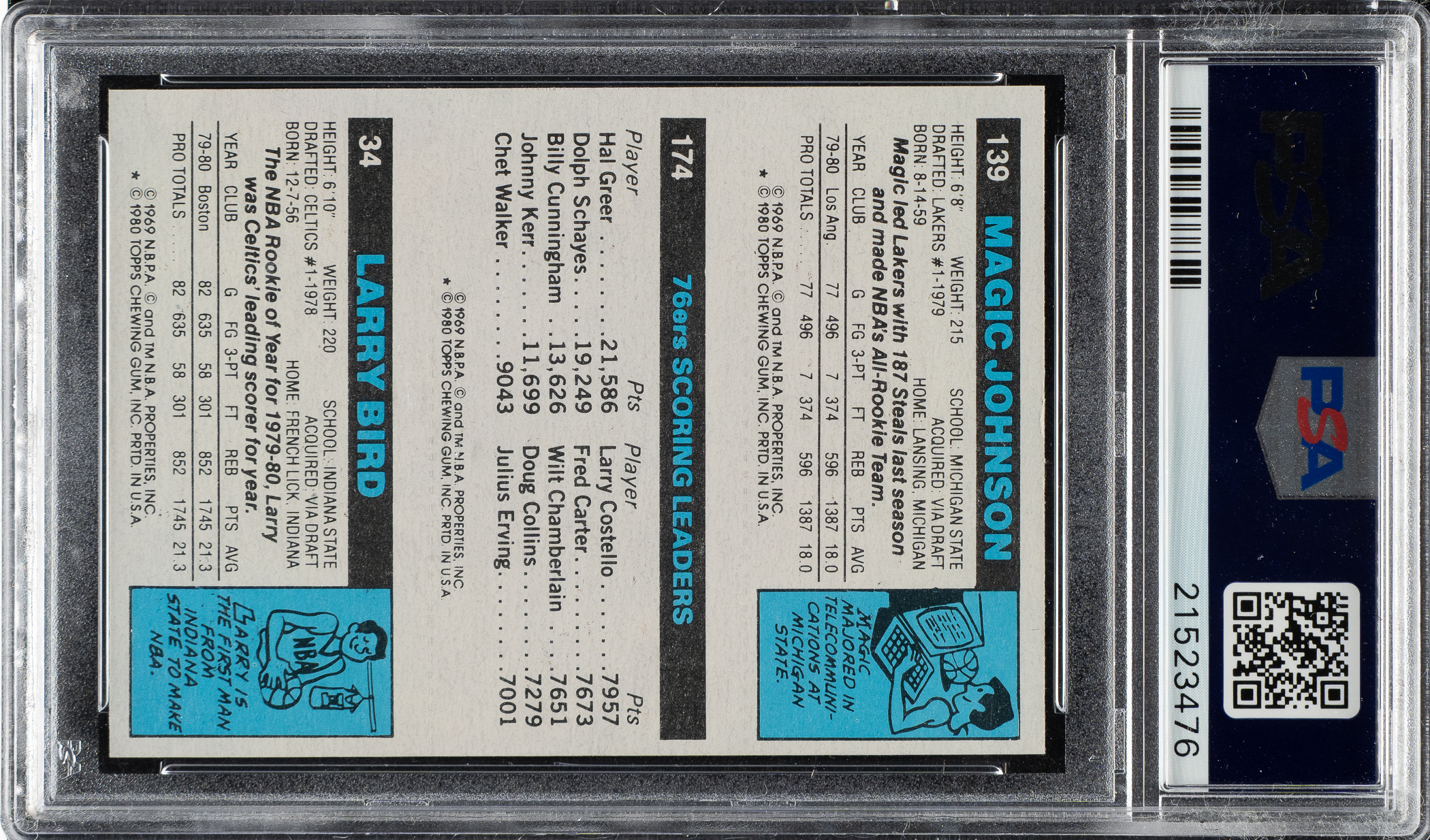 Graded MINT 9 by PSA. Tremendous ultra high-grade rookie card featuring Larry Bird and Magic Johnson from the 1980-1981 Topps basketball series. The card is bright and crisp with vibrant colors, sharp corners, outstanding registration, and impressive centering. Clean reverse. This is a fantastic ultra-high-grade example of Larry Bird and Magic Johnson's rookie card, which is the key card from the set, and arguably the most significant basketball card in the hobby.