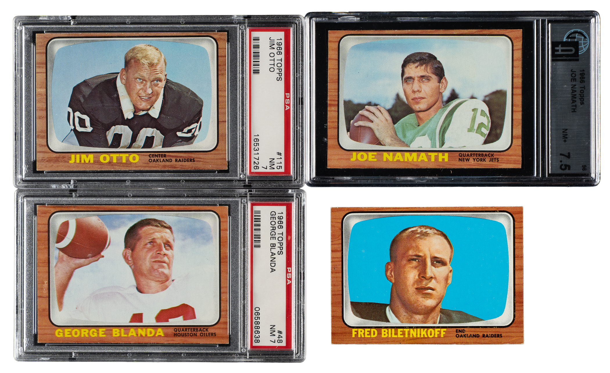 Presented is a complete set of 1966 Topps football consisting of 132 different cards. This set is highlighted by Hall of Famers Joe Namath, George Blanda, Fred Biletnikoff, and Len Dawson. The condition is 39% Ex-Mt to Nr/Mt (including a couple Nr/Mt-Mt), 56% Vg-Ex to Ex, and 5% Gd to Vg (including one lesser and a couple with color added). Seventeen cards have been professionally graded and encapsulated by PSA (one by GAI). Keys: #15 Funny Ring Checklist (Ex), 26 Kemp (Vg-Ex), 48 Blanda (NM 7), 61 Checklist (Ex), 67 Dawson (Ex), 96 Namath (GAI NM+ 7.5), 104 Biletnikoff (Ex-Mt), 115 Otto (NM 7), 119 Alworth (color added, otherwise Vg), and 132 Checklist (Gd+). Fourteen additional PSA-graded cards (all NM 7): #7, 35, 36, 41, 65, 83, 89, 93, 94, 98, 99, 110, 118, and 124. Very attractive mid- to high-grade complete 1960s Topps football set, including many Hall of Famers and stars of the era. Total: 132 cards. The size/weight of this item requires that there will be an additional shipping charge for this lot.