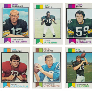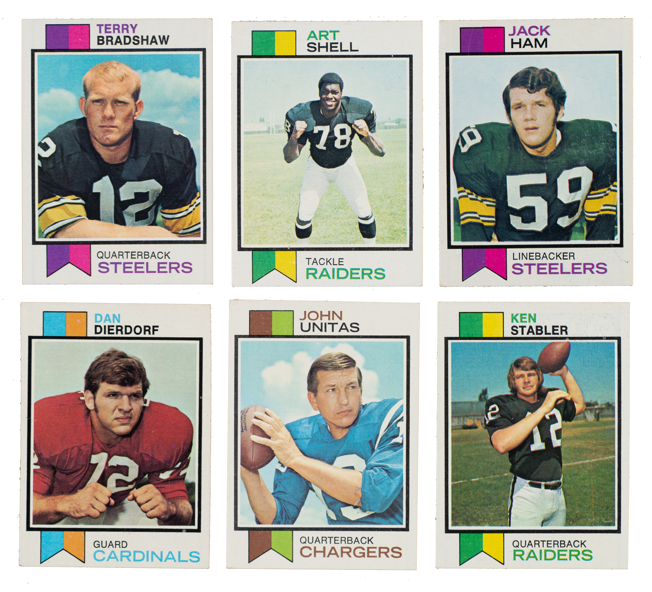 Very attractive mid- to high-grade complete set of 1973 Topps football cards. The 1973 Topps set features rookie cards of Hall of Famers Franco Harris, Jack Ham, Art Shell, and Ken Stabler as well as numerous other stars and Hall of Famers, including Johnny Unitas, Roger Staubach, and Joe Namath. Condition is 21% Nr/Mt to Nr/Mt-Mt, 70% Ex to Ex-Mt (including some due solely to centering), and 9% Vg to Vg-Ex. Keys: #15 Bradshaw (Vg+), 77 Shell RC (Ex), 89 Harris RC (Ex), 115 Ham RC (Ex+), 322 Dierdorf RC (Ex), 343 Youngblood RC (Vg-Ex+), 400 Namath (Vg-Ex), 455 Unitas (Ex), 475 Staubach (Ex-Mt), and 487 Stabler RC (Ex+). This is a very sharp-looking complete set of this classic 1970s Topps football issue. Total: 528 cards.