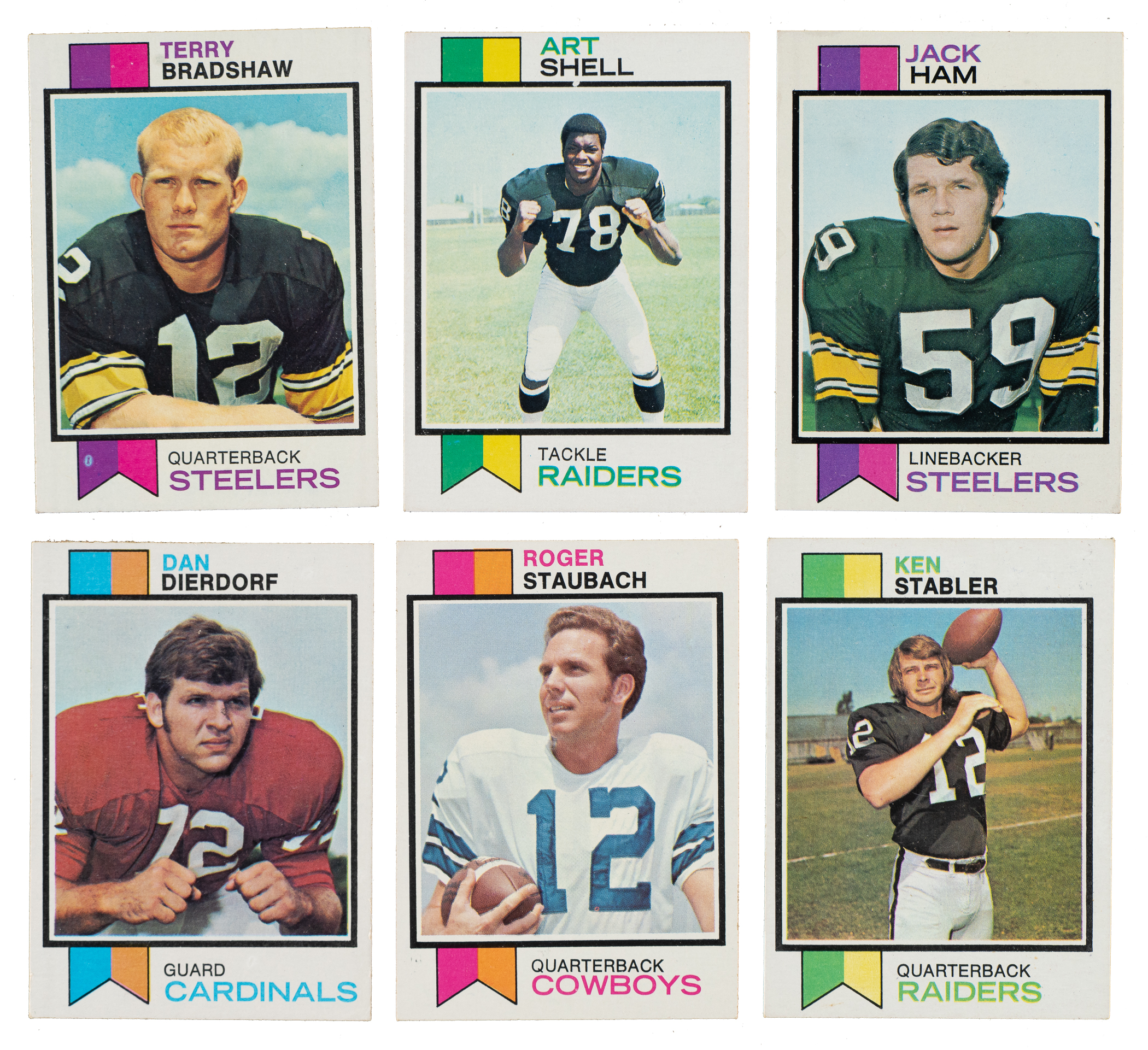 Very attractive mid- to high-grade complete set of 1973 Topps football cards. The 1973 Topps set features rookie cards of Hall of Famers Franco Harris, Jack Ham, Art Shell, and Ken Stabler as well as numerous other stars and Hall of Famers, including Johnny Unitas, Roger Staubach, and Joe Namath. Condition is 27% Nr/Mt to Nr/Mt-Mt, 68% Ex to Ex-Mt (including some due solely to centering), and 5% slightly lesser. Keys: #15 Bradshaw (Ex), 77 Shell RC (Ex), 89 Harris RC (Ex+), 115 Ham RC (Ex), 322 Dierdorf RC (Vg-Ex), 343 Youngblood RC (Ex), 400 Namath (Ex-Mt), 455 Unitas (Vg-Ex+), 475 Staubach (Vg-Ex+), and 487 Stabler RC (Ex). This is a very sharp-looking complete set of this classic 1970s Topps football issue. Total: 528 cards.