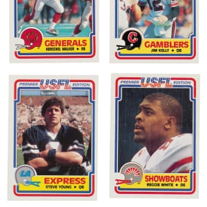 Presented is an outstanding high-grade near-complete set of 1984 Topps USFL football cards consisting of 114 different cards (out of 132 in the set). Missing the following eighteen cards for completion: #12, 14, 17, 18, 38, 42, 57, 59, 62, 71, 73, 80, 92, 96, 102, 109, 115, and 128. This near set is highlighted by the rookie cards of Hall of Famers Steve Young, Herschel Walker, Jim Kelly, and Reggie White. Condition is 15% Nr/Mt to Nr/Mt-Mt, 73% Ex to Ex-Mt, and 12% Vg to Vg-Ex. Keys: #36 Kelly RC (Nr/Mt+ due to centering), 52 Young RC (Nr/Mt due to centering), 58 White RC (Ex+ due to print defects), and 74 Walker RC (Nr/Mt-Mt). Included is an original box in Good condition. A very attractive near-complete set of this classic 1980s football series. Total: 115 items (near set of 114 cards plus box).