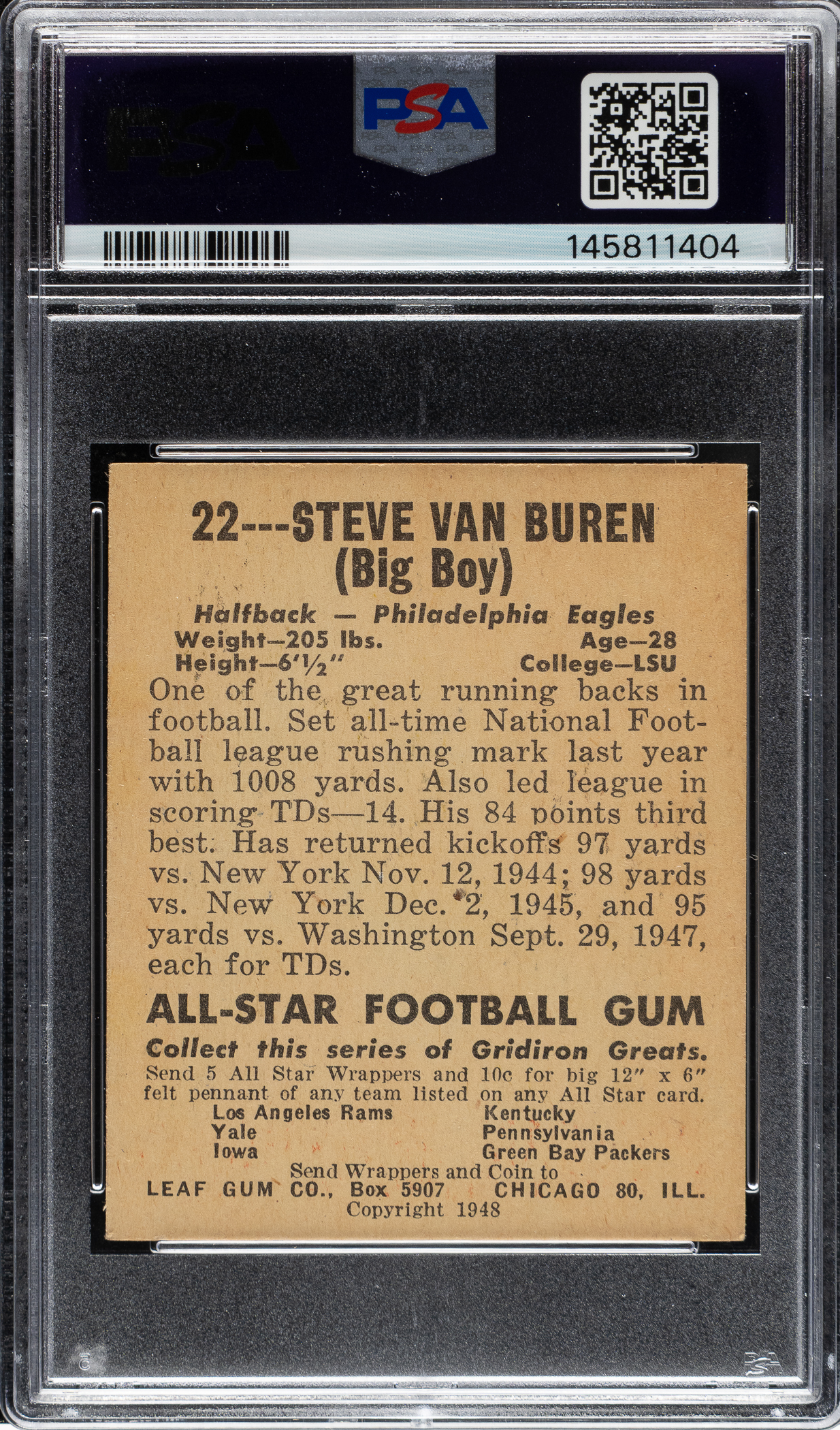Graded NM 7 by PSA. Superb high-grade example of Philadelphia Eagles Hall of Famer Steve Van Buren’s rookie card ("Green Jersey, Green Sock" variation) from the 1948 Leaf football set. Crisp and clean, with outstanding image quality, bold colors, and strong corners with light touches of wear. Clean reverse. This is a superb high-grade example of Steve Van Buren’s rookie card, worthy of any world-class 1948 Leaf football set or Hall of Fame rookie-card collection.
