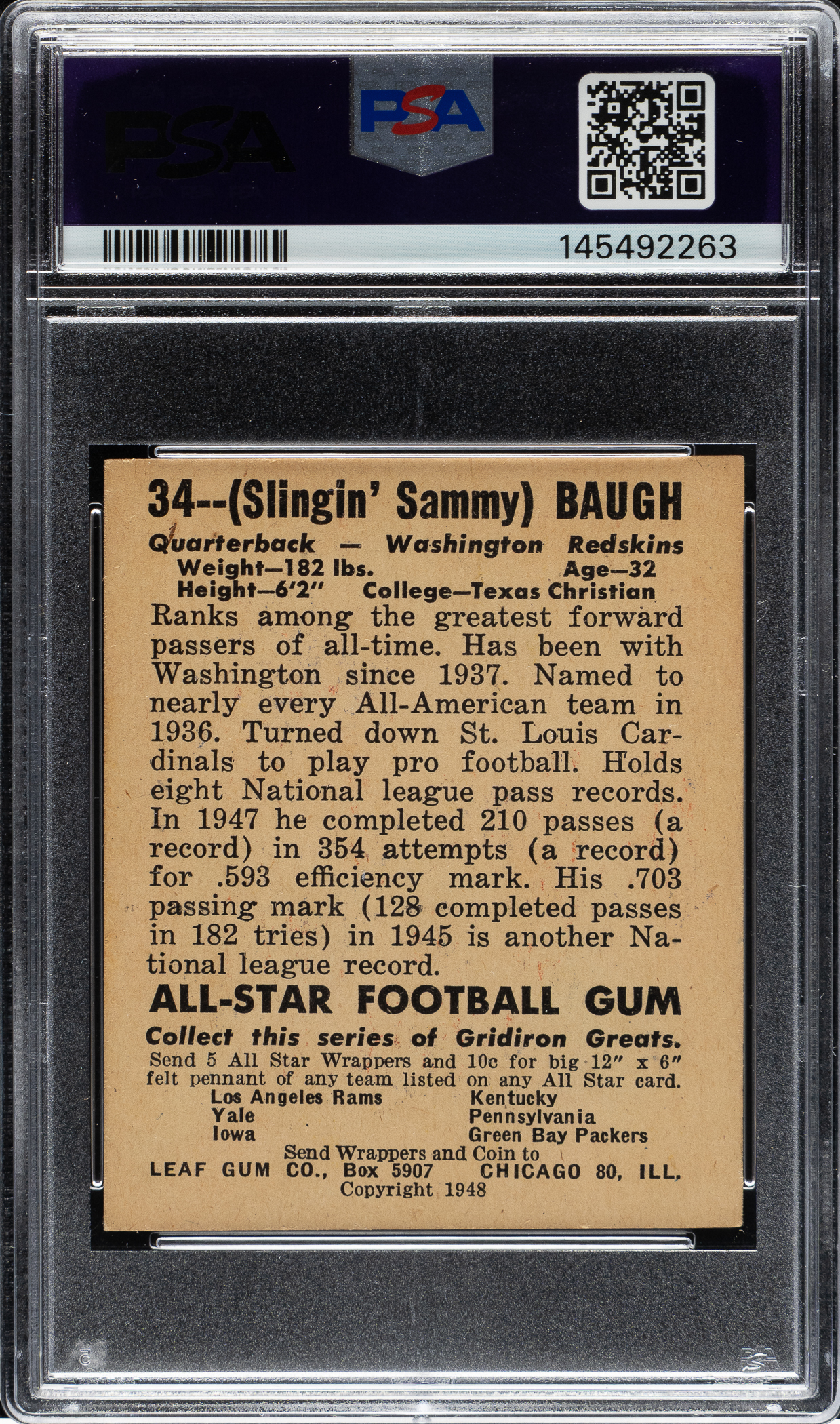 Graded EX-MT 6 by PSA. Washington Redskins Hall of Famer Sammy Baugh.