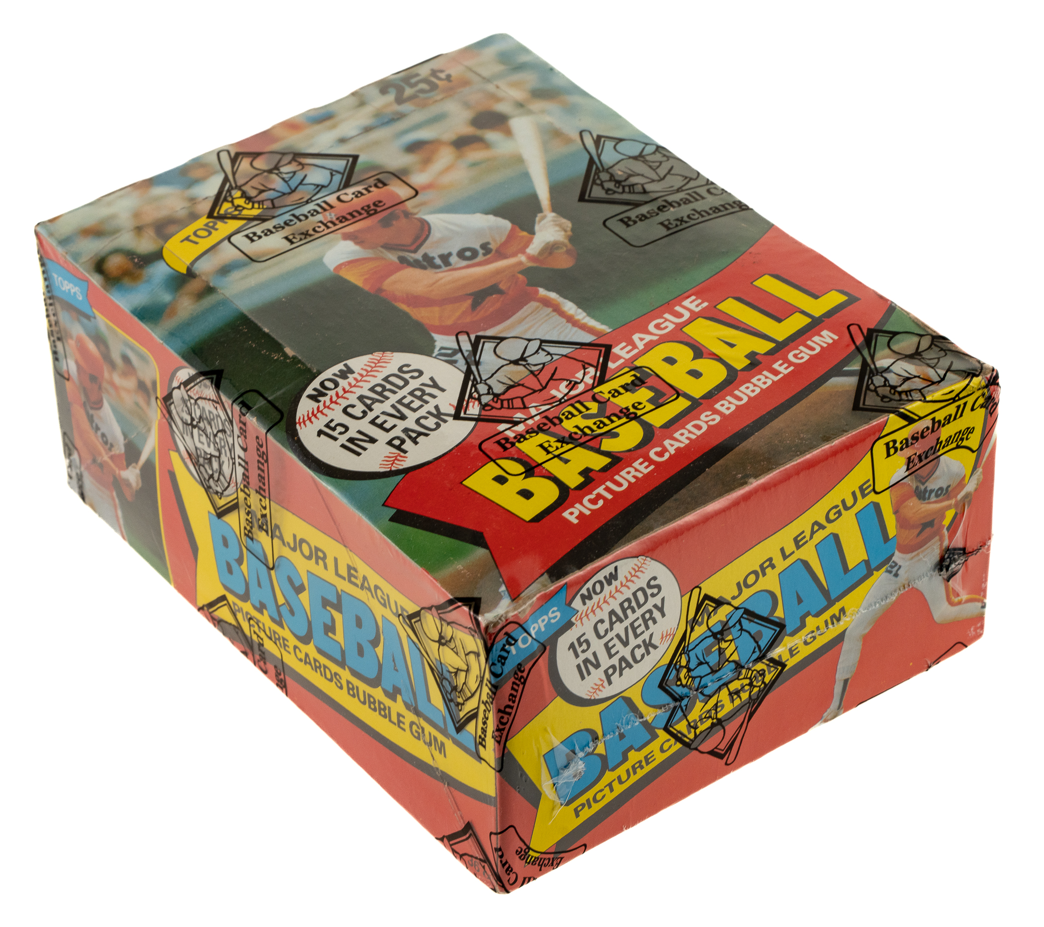 Complete, original unopened wax box of 1980 Topps baseball. The box houses 36 wax packs with each pack containing 15 cards for a total of 540 cards. The 1980 Topps set includes the rookie card of Rickey Henderson, and many other Hall of Famers including Nolan Ryan, George Brett, and Ozzie Smith. The display box has minimal shelf wear, with a small crease visible along the underside. This box comes shrink-wrapped by Baseball Card Exchange (owned by Steve Hart, the foremost expert on unopened material.