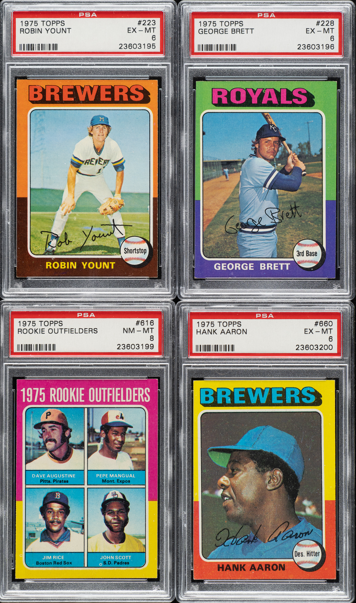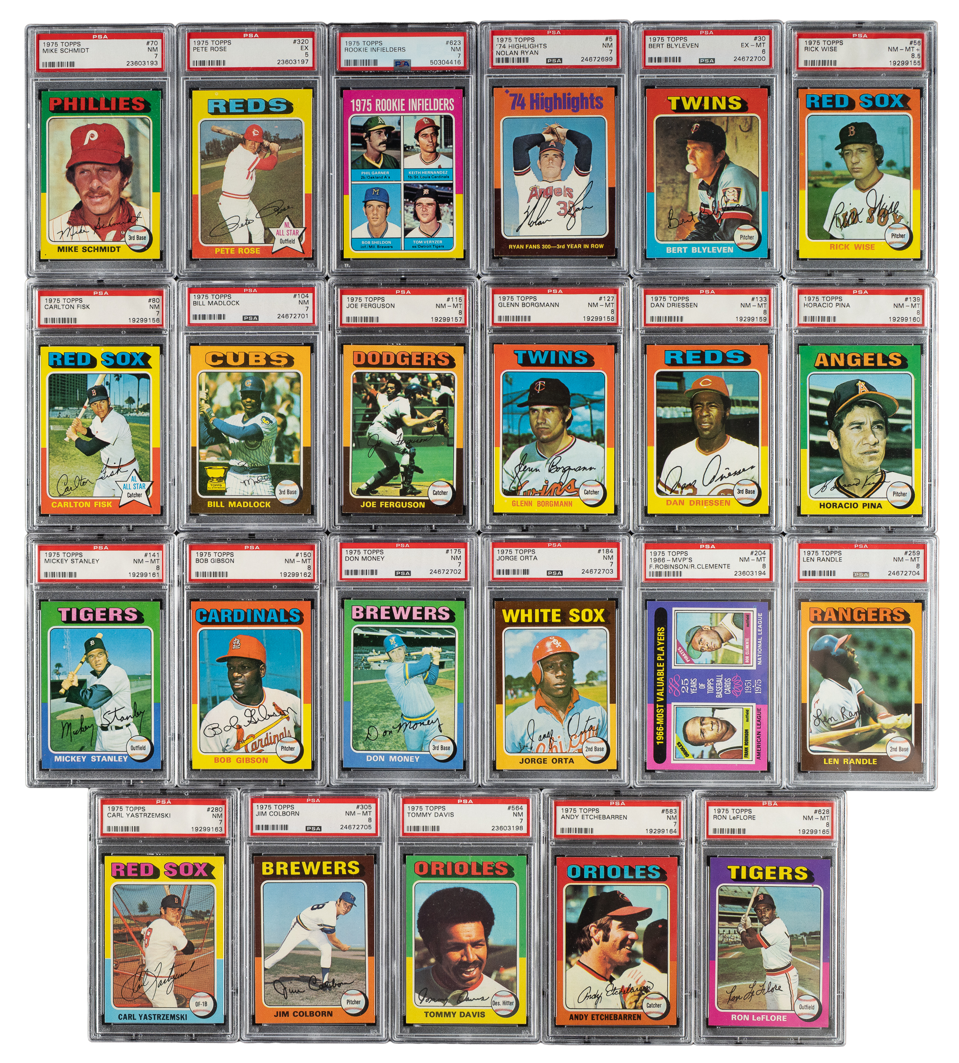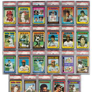 The rookie cards of Hall of Famers George Brett, Robin Yount, Gary Carter, and Jim Rice highlight the 1975 Topps issue, one of the most popular and unusual sets of the 1970s. The colored flush-to-the-border design of the 1975 Topps set makes this issue particularly challenging to collect in extremely high grade. Condition is 50% Nr/Mt to Nr/Mt-Mt, 44% Ex to Ex-Mt (including some due solely to centering), and 6% Vg to Vg-Ex (including a couple with a slight miscut). Twenty-seven cards have been professionally graded and encapsulated by PSA. PSA Grading Composite: NM-MT+ 8.5 (1 card): #56. NM-MT 8 (11 cards): #115, 127, 133, 139, 141, 150 Gibson, 204 F. Robinson/Clemente MVPs, 259, 305, 616 Rice RC, and 628. NM 7 (10 cards): #5 Ryan HL, 70 Schmidt, 80 Fisk, 104, 175, 184, 280 Yastrzemski, 564, 583, and 623 Hernandez RC. EX-MT 6 (4 cards): #30 Blyleven, 223 Yount RC, 228 Brett RC, and 660 Aaron. EX 5 (1 card): #320 Rose. Unencapsulated Keys: #1 Aaron HL (Ex), 61 Winfield (Vg+), 260 Bench (Ex-Mt), 500 Ryan (Ex due to centering), 620 Carter RC (Nr/Mt), and 622 Lynn RC (Ex-Mt). This is a very attractive mid- to high-grade set loaded with Hall of Famers and stars from the 1970s. Total: 660 cards. The size/weight of this item requires that there will be an additional shipping charge for this lot.