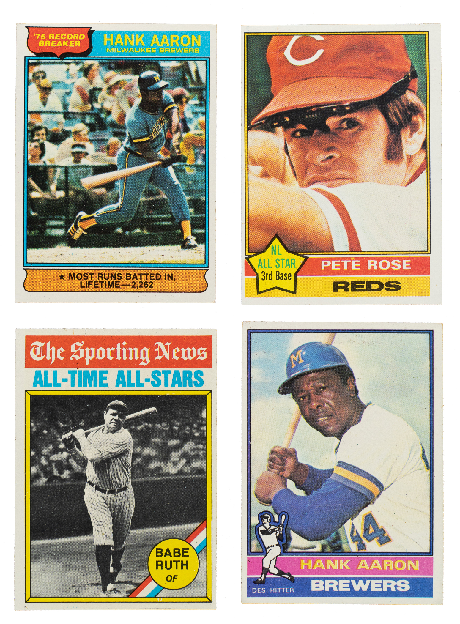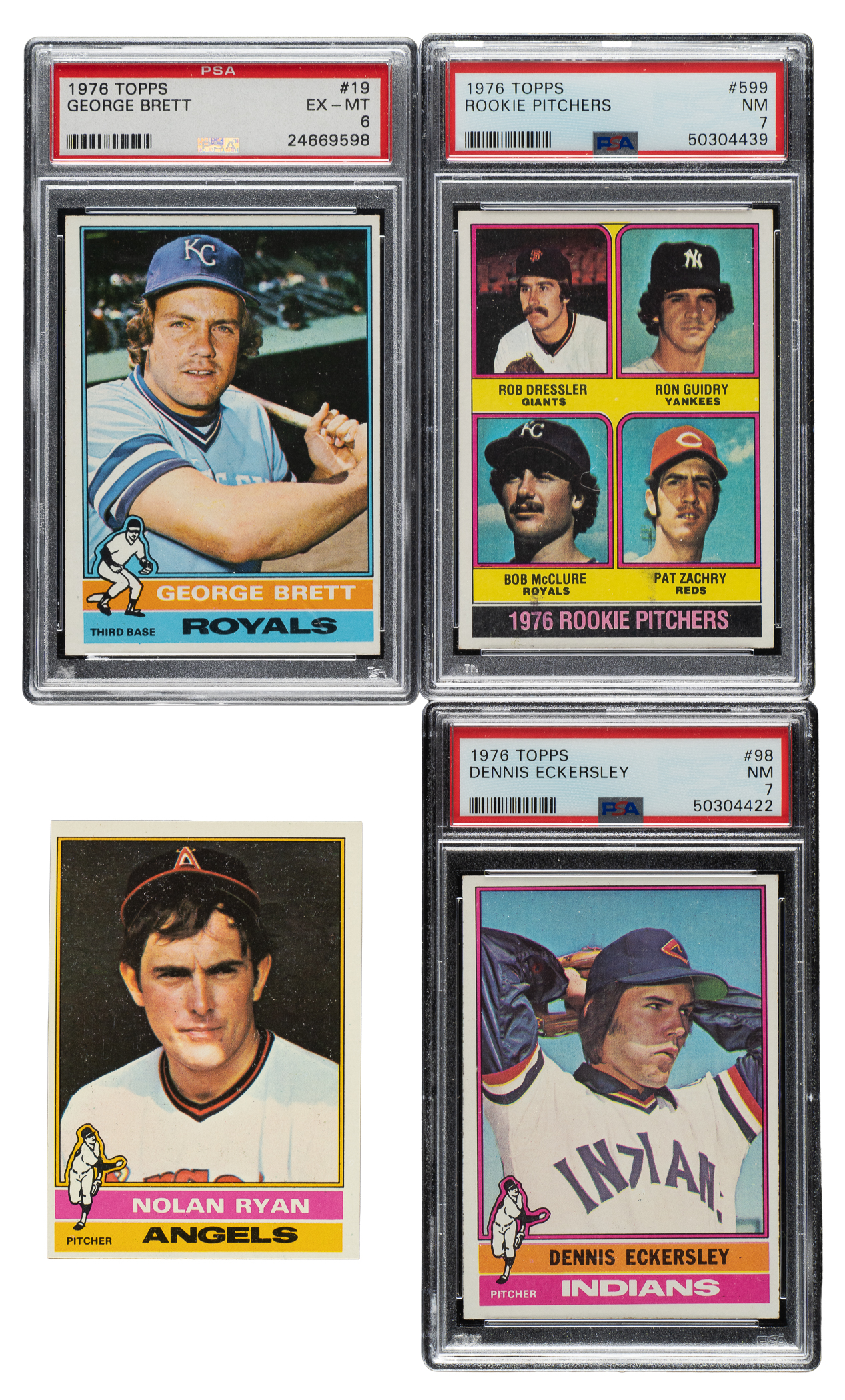 Presented is a very attractive 660-card complete set of 1976 Topps Baseball, plus complete 44-card traded series. The set is highlighted by dozens of stars and Hall of Famers, including Nolan Ryan, George Brett, Dennis Eckersley (rookie), and the final card of Hank Aaron. Condition is 23% Nr/Mt to Nr/Mt-Mt, 55% Ex to Ex-Mt, and 22% Vg to Vg-Ex. Eight cards have been professionally graded and encapsulated by PSA. Keys: #1 Aaron RB (Ex), 19 Brett (EX-MT 6), 98 Eckersley RC (NM 7), 240 Rose (Ex due to centering), 330 Ryan (Ex-Mt due to centering), 345 Ruth ATAS (Ex-Mt due to centering), 480 Schmidt (Ex+), 550 Aaron (Vg+), and 599 Guidry RC (NM 7). Five additional PSA-graded cards: NM-MT 8 (3 cards): #78, 130, and 93. NM 7 (2 cards): #382 and 645. The condition of the traded series ranges from Vg-Ex to Ex-Mt (averaging Ex), with a couple slightly higher and lower. This is a very attractive mid- to high-grade 1976 Topps complete set with numerous highlights. Total: 704 cards.