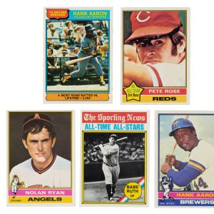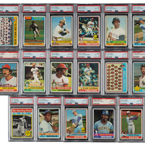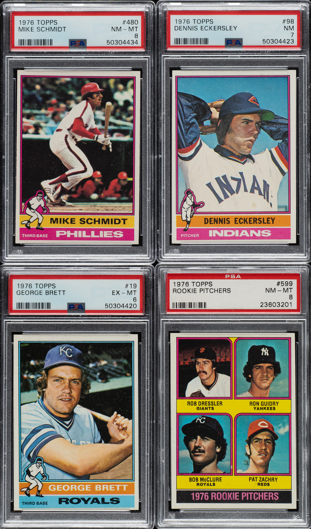 Presented is a very attractive 660-card complete set of 1976 Topps Baseball. The set is highlighted by dozens of stars and Hall of Famers, including Nolan Ryan, George Brett, Dennis Eckersley (rookie), and the final card of Hank Aaron. Condition is 53% Nr/Mt to Nr/Mt-Mt, 39% Ex to Ex-Mt, and 8% Vg to Vg-Ex. Twenty-four cards have been graded and encapsulated by PSA. Keys: #1 Aaron RB (Ex), 19 Brett (EX-MT 6), 98 Eckersley RC (NM 7), 240 Rose (Nr/Mt), 330 Ryan (Vg+), 345 Ruth ATAS (Ex), 480 Schmidt (NM-MT 8), 550 Aaron (Ex-Mt), and 599 Guidry RC (NM-MT 8). Twenty additional PSA-graded cards: MINT 9 (1 card): #531. NM-MT 8 (18 cards): #3, 8, 50, 133, 142, 185, 215, 230, 277, 343, 440, 441, 479, 544, 616, 617, 650, and 655. NM 7 (1 card): #340. Condition of the Traded set is 50% Nr/Mt to Nr/Mt-Mt and 50% Ex to Ex-Mt (including a few slightly lesser). This is an outstanding, mostly high-grade 1976 Topps complete set (plus traded) with numerous highlights. Total: 704 cards. The size/weight of this item requires that there will be an additional shipping charge for this lot.