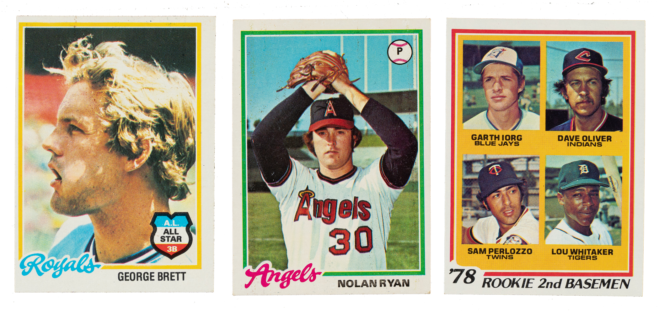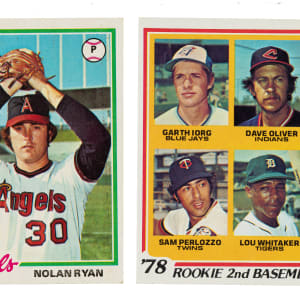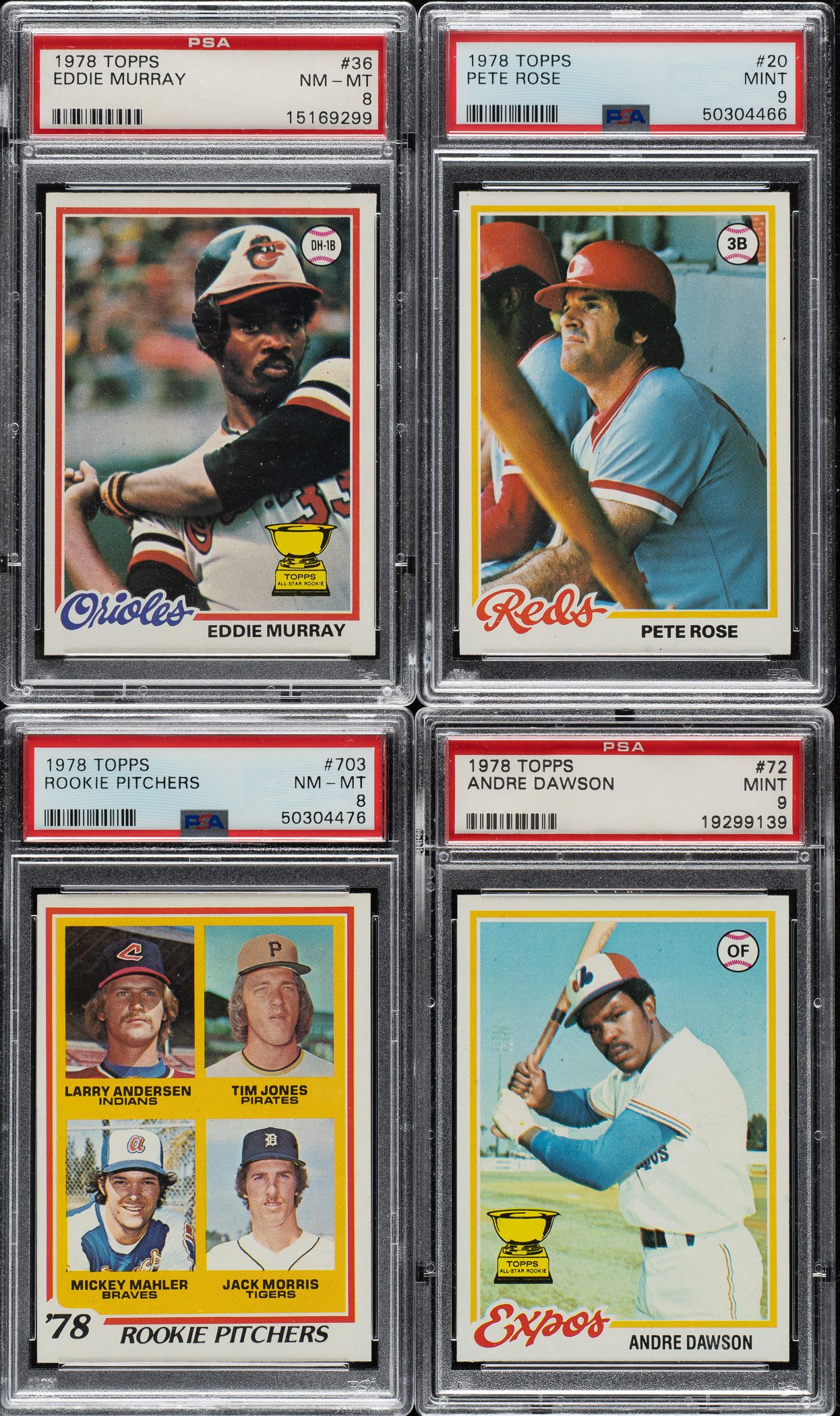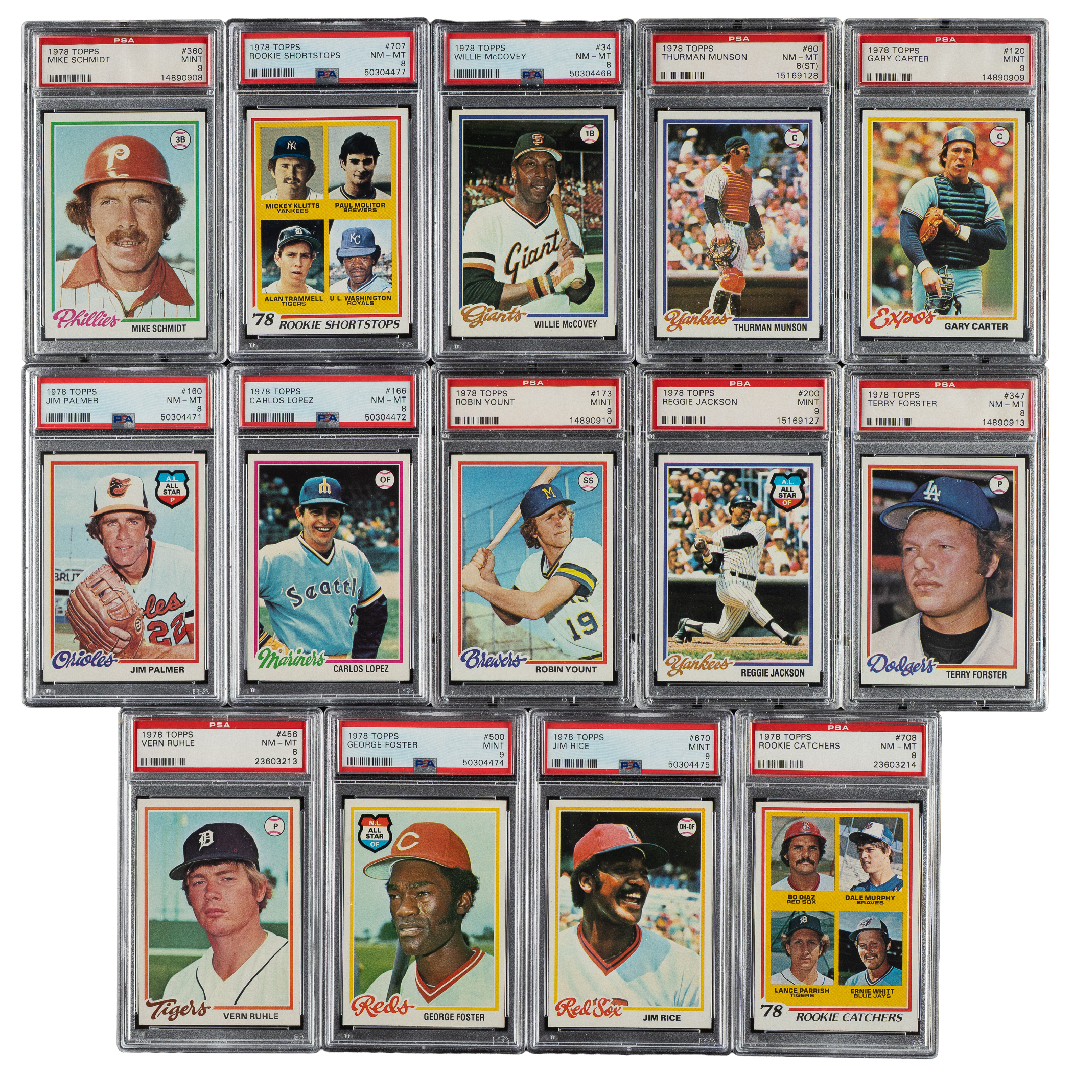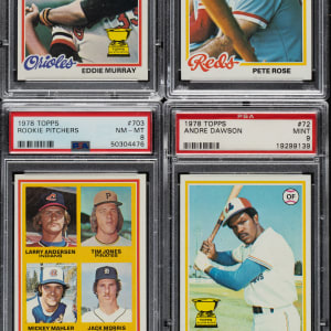 The rookie cards of Eddie Murray, Jack Morris, Alan Trammell, and Paul Molitor highlight the 1978 Topps issue. Presented is an outstanding complete set of 726 different cards. Condition is 39% Nr/Mt to Nr/Mt-Mt (including some Mint), 41% Ex to Ex-Mt, and 20% Vg to Vg-Ex. Eighteen cards have been professionally graded and encapsulated by PSA. PSA Grading Composite: MINT 9 (8 cards): #20 Rose, 72 Dawson, 120 Carter, 173 Yount, 200 Jackson, 360 Schmidt, 500, and 670 Rice. NM-MT 8 (10 cards): #34 McCovey, 36 Murray RC, 60 Munson (ST), 160 Palmer, 166, 347, 456, 703 Morris RC, 707 Molitor/Trammell RC, and 708 . Unencapsulated Keys: #100 Brett (Ex due to centering), 400 Ryan (Ex+), and 704 Whitaker RC (Nr/Mt). This is a very attractive mid- to high-grade complete set. Total: 726 cards. The size/weight of this item requires that there will be an additional shipping charge for this lot.