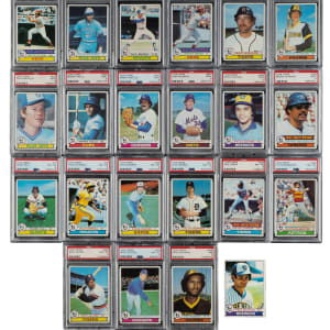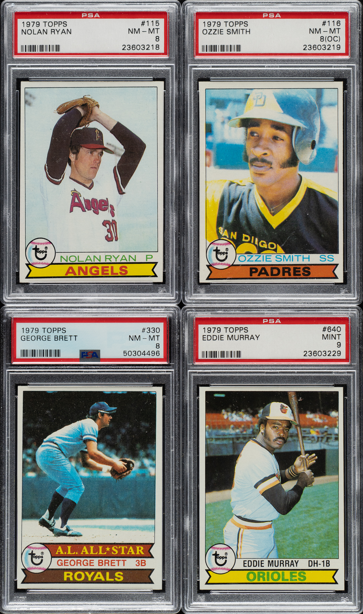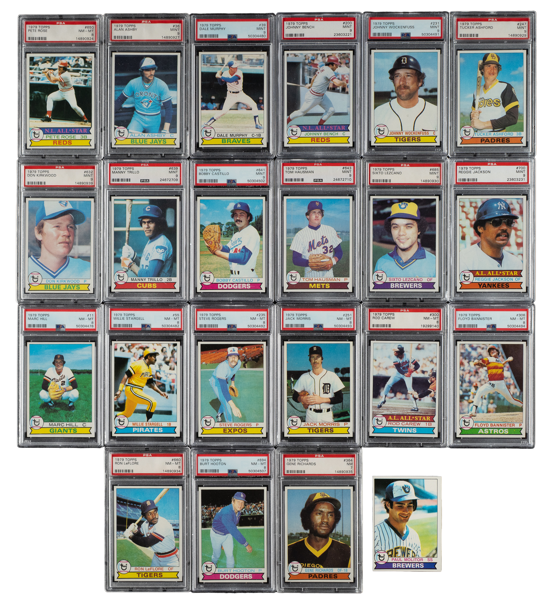 The rookie card of Ozzie Smith highlights the 1979 Topps issue, one of the very popular sets of the 1970s. Condition is 44% Nr/Mt to Nr/Mt-Mt (including some Mint), 35% Ex to Ex-Mt (including some due solely to centering, and 21% Vg to Vg-Ex (mostly due to light surface wrinkles). Twenty-five cards have been graded and encapsulated by PSA. PSA Grading Composite: MINT 9 (12 cards): #36, 39 Murphy, 200 Bench, 231, 247, 632, 639, 640 Murray, 641, 643, 685, and 700 Jackson. NM-MT 8 (12 cards): #11, 55 Stargell, 115 Ryan, 116 Smith RC (OC), 235, 251 Morris, 300 Carew, 306, 330 Brett, 650 Rose, 660, and 694. NM 7 (1 card): #364. This is a very attractive mid- to high-grade complete set of this classic 1970s Topps issue. Total: 726 cards. The size/weight of this item requires that there will be an additional shipping charge for this lot.