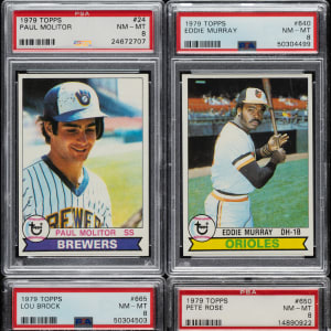 The rookie card of Ozzie Smith highlights the 1979 Topps issue, one of the very popular sets of the 1970s. Eighteen cards have been graded and encapsulated by PSA. Condition is 32% Nr/Mt to Nr/Mt-Mt, 50% Ex to Ex-Mt (including some due solely to centering), and 18% Vg to Vg-Ex (including a couple Gd). Keys: #24 Molitor (NM-MT 8), 55 Stargell (NM-MT 8), 115 Ryan (Vg), 116 Smith RC (VG-EX 4), 200 Bench (NM-MT 8), 330 Brett (EX 5), 610 Schmidt (NM-MT 8), 640 Murray (NM-MT 8), 650 Rose (NM-MT 8), 665 Brock (NM-MT 8), 670 Hunter (NM-MT 8), and 680 Fisk (NM 7). Seven additional PSA-graded cards: MINT 9 (2 cards): #70 and 303. NM-MT 8 (5 cards): #68, 125, 298, 631, and 692. This is a very attractive mid- to high-grade complete set of this classic 1970s Topps issue. Total: 726 cards. The size/weight of this item requires that there will be an additional shipping charge for this lot.