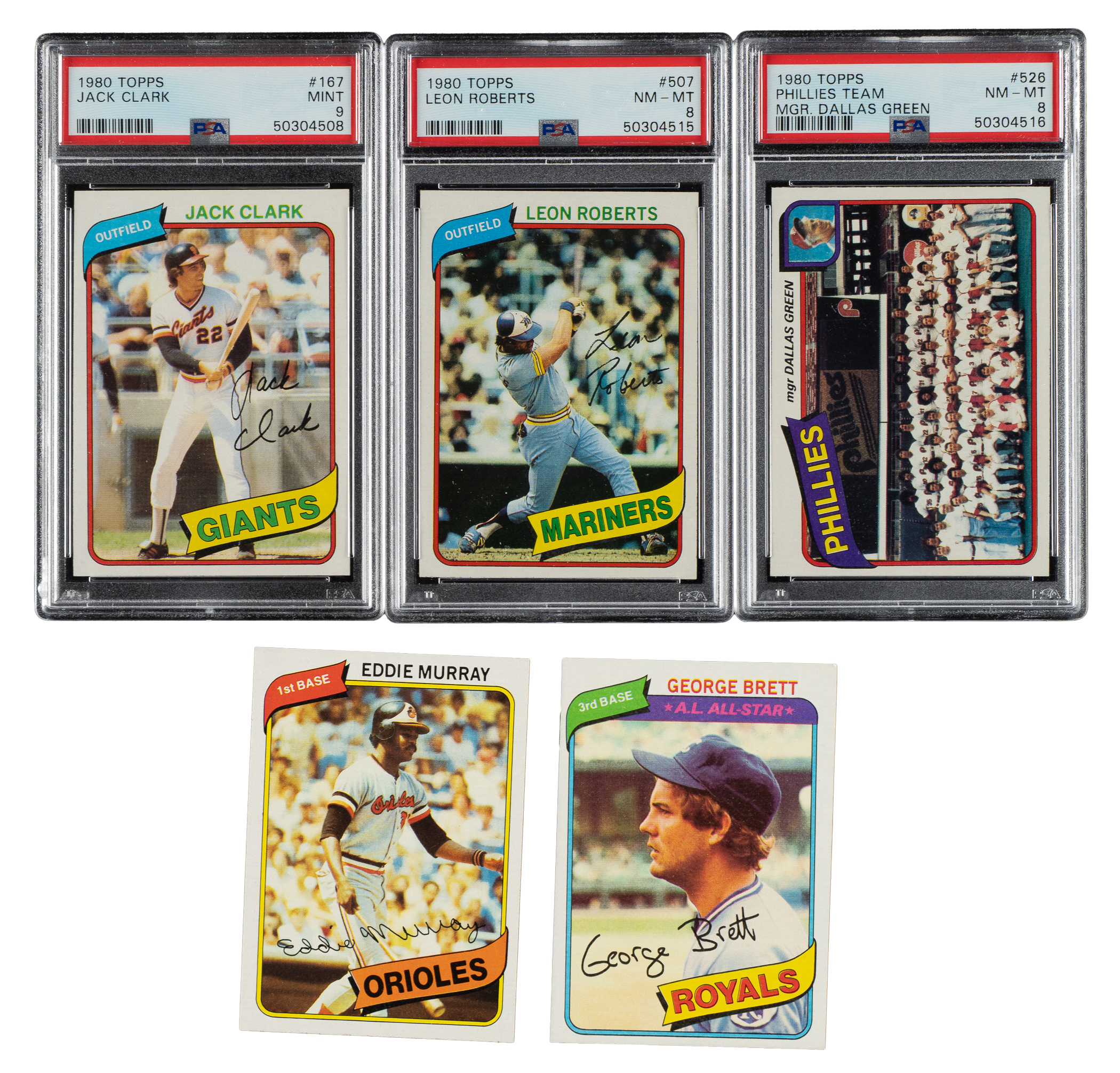 The rookie card of Rickey Henderson highlights the 1980 Topps issue, one of the very popular sets of the 1980s. Condition is 61% Nr/Mt to Nr/Mt-Mt (including a few Mint), 31% Ex to Ex-Mt (including some due solely to centering), and 8% Vg to Vg-Ex. Five cards have been graded by PSA. Keys: #160 Murray (Nr/Mt-Mt), 167 (MINT 9), 393 Smith (MINT 9), 450 Brett (Vg-Ex+), 482 Henderson RC (NM-MT 8), 507 (NM-MT 8), 526 (NM-MT 8), 540 Rose (Nr/Mt-Mt+), and 580 Ryan (Nr/Mt). This is an extremely attractive high-grade complete set of this classic 1980s Topps issue highlighted by a PSA-graded NM-MT 8 example of the Rickey Henderson rookie. Total: 726 cards.