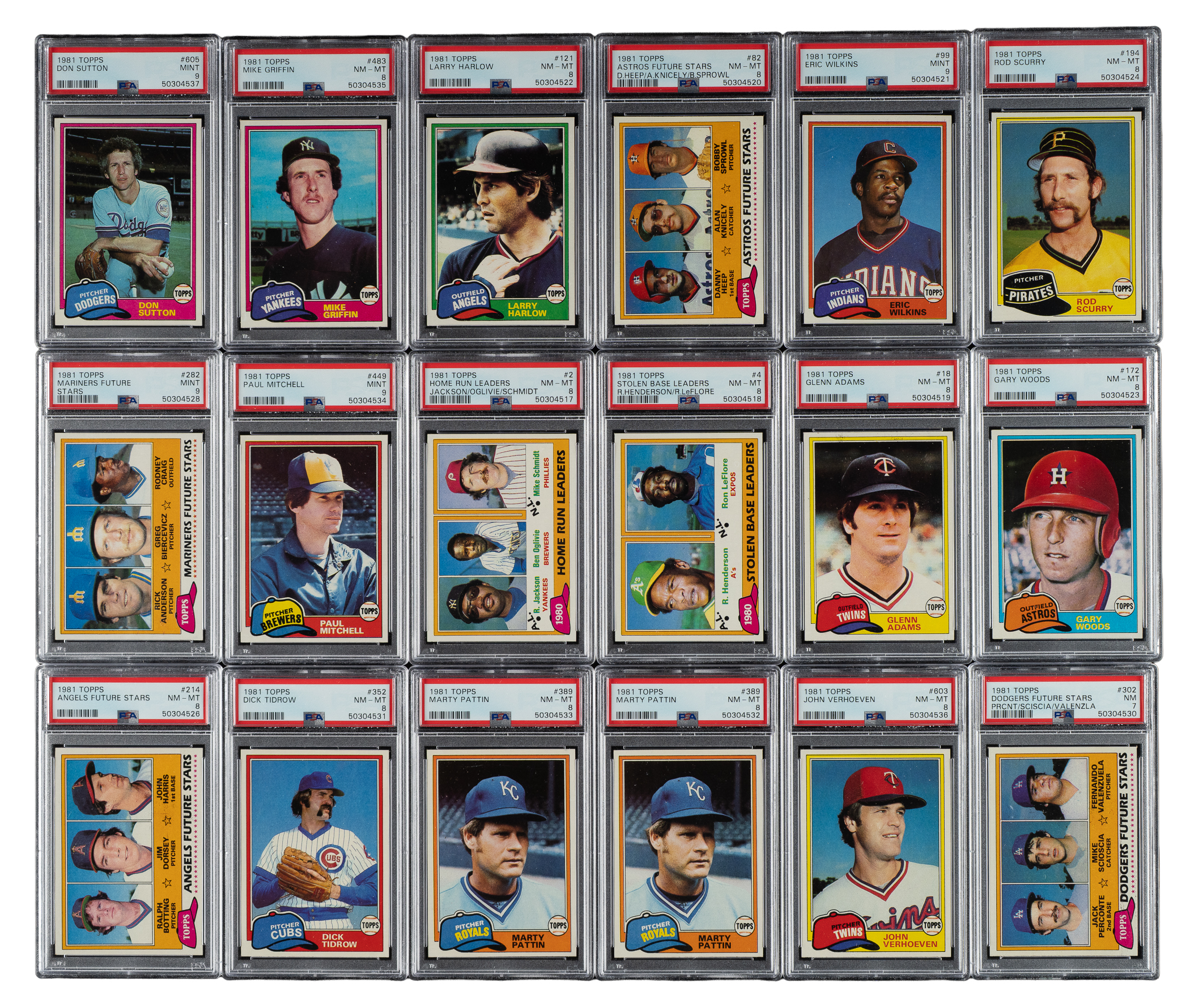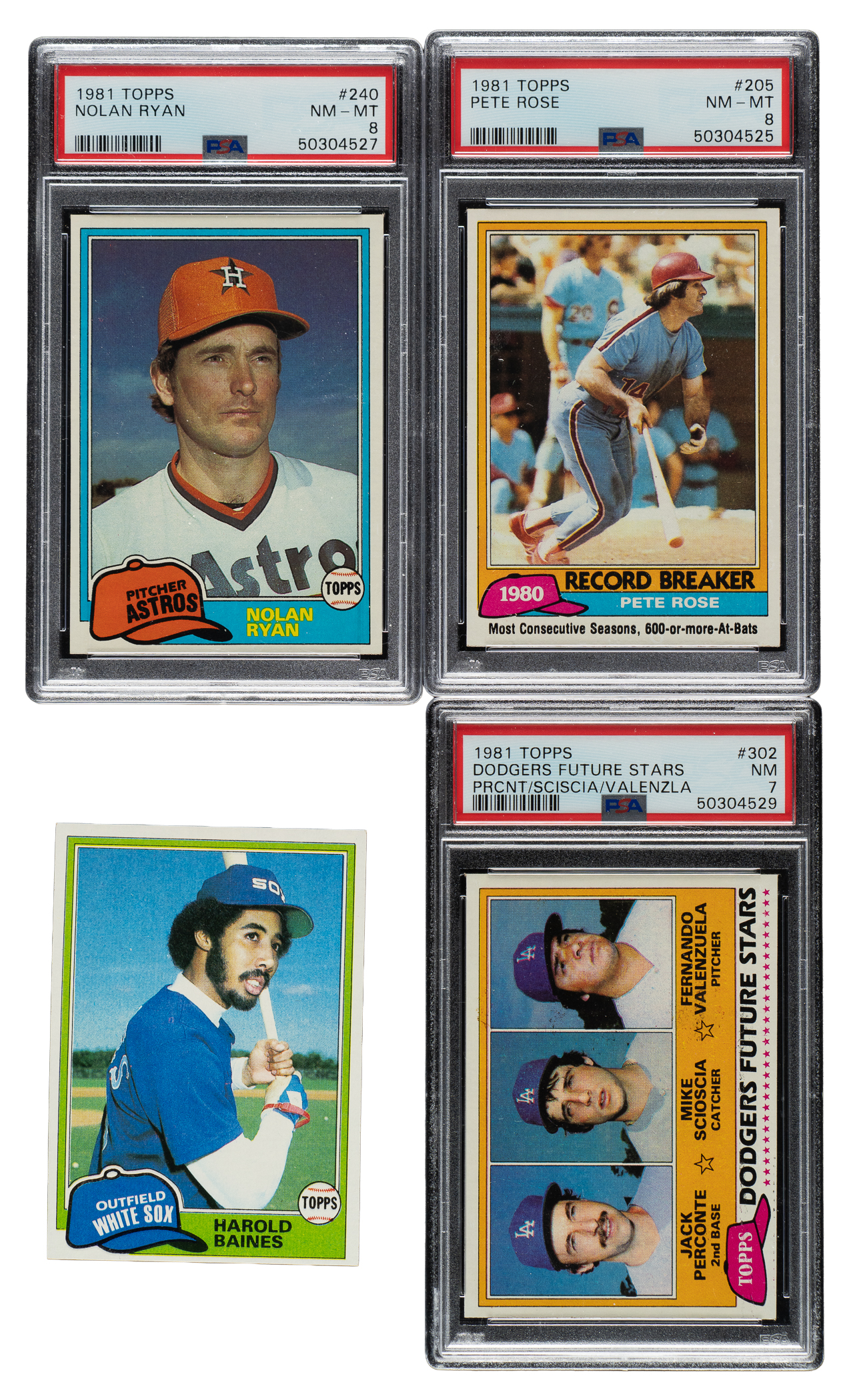 Presented are three high-grade complete sets (726-card) of 1981 Topps baseball. These stunning complete sets have bright colors, strong corners, and an overall pack-fresh quality. Condition is 72% Nr/Mt to Nr/Mt-Mt (including some Mint) and 28% Ex to Ex-Mt (mostly due to centering and including 2% lesser). This collection consists of the following: 1) 1981 Topps Complete Set (726): Keys: #240 Ryan (NM-MT 8), 261 Henderson (Ex-Mt due to centering), 302 Valenzuela RC (NM 7), 347 Baines RC (Nr/Mt), and 479 Raines RC (Nr/Mt-Mt+). Seventeen additional PSA-graded cards: MINT 9 (4 cards): #99, 282, 449, and 605 Sutton. NM-MT 8 (13 cards): #2 HR Ldrs - Jackson/Oglivie/Schmidt, 4 Stolen Base Ldrs - Henderson/LeFlore, 18, 82, 121, 172, 194, 205 Rose RB, 214, 352, 389, 483, and 603. 2) 1981 Topps Complete Set (726): Keys: #240 Ryan (Nr/Mt-Mt+), 261 Henderson (Ex+ due to centering), 302 Valenzuela RC (NM 7), 347 Baines RC (Nr/Mt), 389 (NM-MT 8), and 479 Raines RC (Nr/Mt-Mt). 3) 1981 Topps Complete Set (726) Plus Six Duplicates: Keys: #240 Ryan (Ex-Mt), 261 Henderson (Ex+ due to centering), 302 Valenzuela RC (Ex-Mt), 347 Baines RC (Ex-Mt), 479 Raines RC (Nr/Mt). Includes the following six duplicates: #4, 172, 214, 282, 352, and 389. This is a very attractive high-grade collection of 1981 Topps complete sets with many impressive highlights. Total: 2,184 cards. The size/weight of this item requires that there will be an additional shipping charge for this lot.