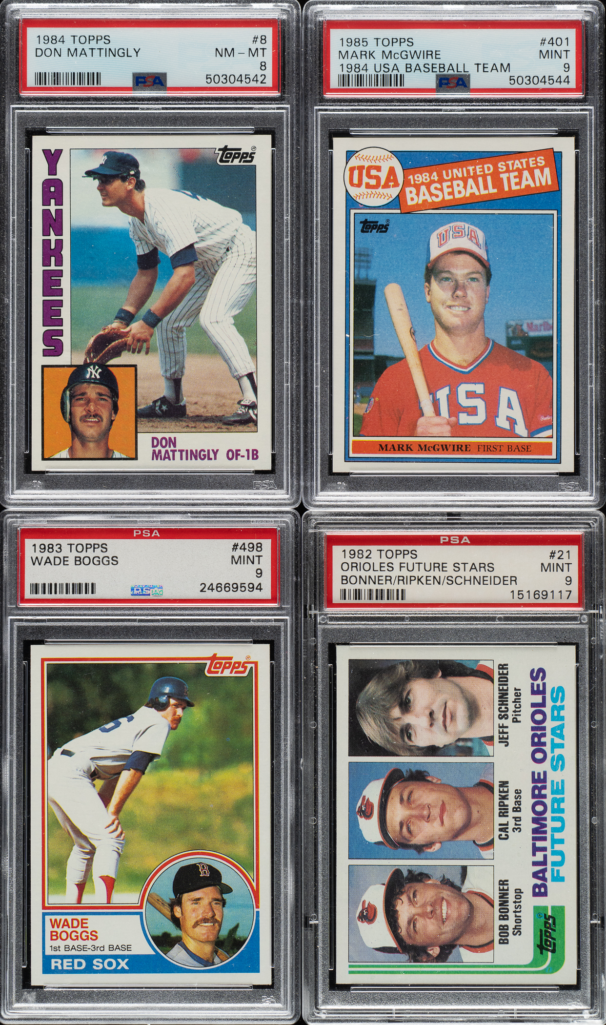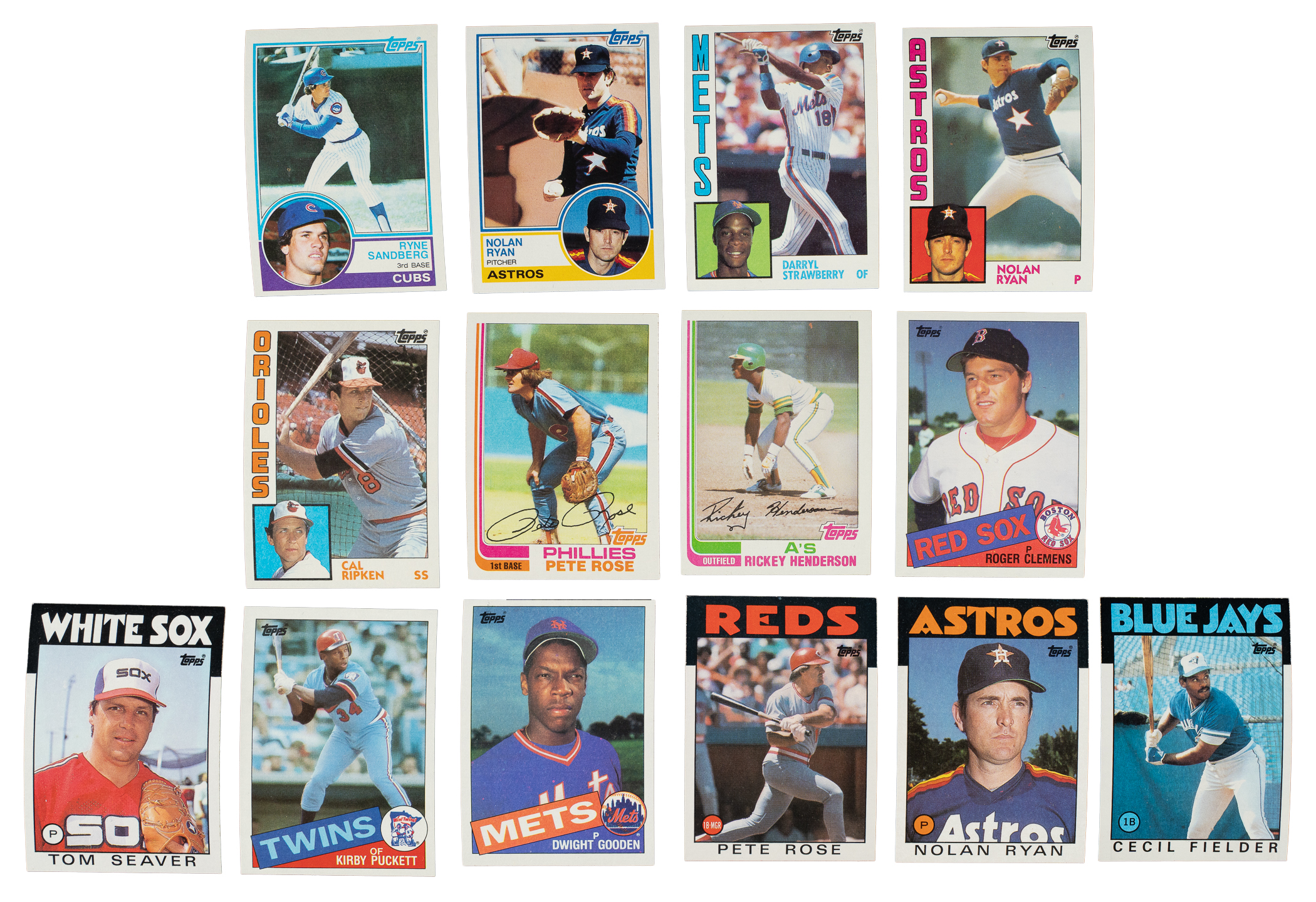 Presented are five crisp, mostly high-grade complete sets of Topps baseball from 1982 through 1986, highlighted by numerous stars and rookie cards, including those of Hall of Famers Tony Gwynn, Wade Boggs, Ryne Sandberg, Kirby Puckett, and Cal Ripken. Eleven cards have been professionally graded and encapsulated by PSA. This collection consists of the following: 1) 1982 Topps Complete Set (792): Condition is 55% Nr/Mt-Mt (including some Mint), 20% Nr/Mt, and 25% Ex to Ex-Mt (mostly due to centering and including a few slightly lesser). Keys: #21 Ripken RC (MINT 9), 90 Ryan (NM-MT 8), 390 Murray (NM-MT 8), 610 Henderson (30/70 L/R, otherwise Nr/Mt-Mt), and 780 Rose (Nr/Mt-Mt). 2) 1983 Topps Complete Set (792): Condition is 55% Nr/Mt to Nr/Mt-Mt (including a few Mint), 40% Ex to Ex-Mt (including some due solely to centering), and 5% lesser (mostly Vg-Ex). Keys: #83 Sandberg RC (Ex-Mt due to centering), 360 Ryan (Nr/Mt-Mt+), 482 Gwynn RC (NM 7), 498 Boggs RC (MINT 9), and 550 Yastrzemski (MINT 9). 3) 1984 Topps Complete Set (792): Condition is 77% Nr/Mt to Nr/Mt-Mt (including some Mint) and 23% Ex to Ex-Mt (mostly due to centering and including a few slightly lesser). Keys: #8 Mattingly RC (NM-MT 8), 182 Strawberry RC (Vg-Ex), 470 Ryan (30/70 L/R, otherwise Nr/Mt-Mt+), and 490 Ripken (Mint). 4) 1985 Topps Complete Set (792): Condition is 80% Nr/Mt to Nr/Mt-Mt (including some Mint) and 20% Ex to Ex-Mt (mostly due to centering and including a few slightly lesser). Keys: #115 Henderson (MINT 9), 181 Clemens RC (Nr/Mt-Mt due to centering), 401 McGwire RC (MINT 9), 536 Puckett RC (Nr/Mt-Mt), 600 Rose (NM-MT 8), 620 Gooden RC (30/70 T/B, otherwise Nr/Mt-Mt+), and 660 Gwynn (GEM MINT 10). 5) 1986 Topps Complete Set (792): Condition is 76% Nr/Mt to Nr/Mt-Mt (including some bordering on Mint) and 24% Ex to Ex-Mt (including a few slightly lesser). Keys: #1 Rose (Ex), 100 Ryan (Nr/Mt), and 386 C. Fielder RC (Nr/Mt-Mt). This is a very attractive collection of complete sets from an extremely popular era including countless stars, Hall of Famers, and other highlights! Total: 3,960 cards. The size/weight of this item requires that there will be an additional shipping charge for this lot.