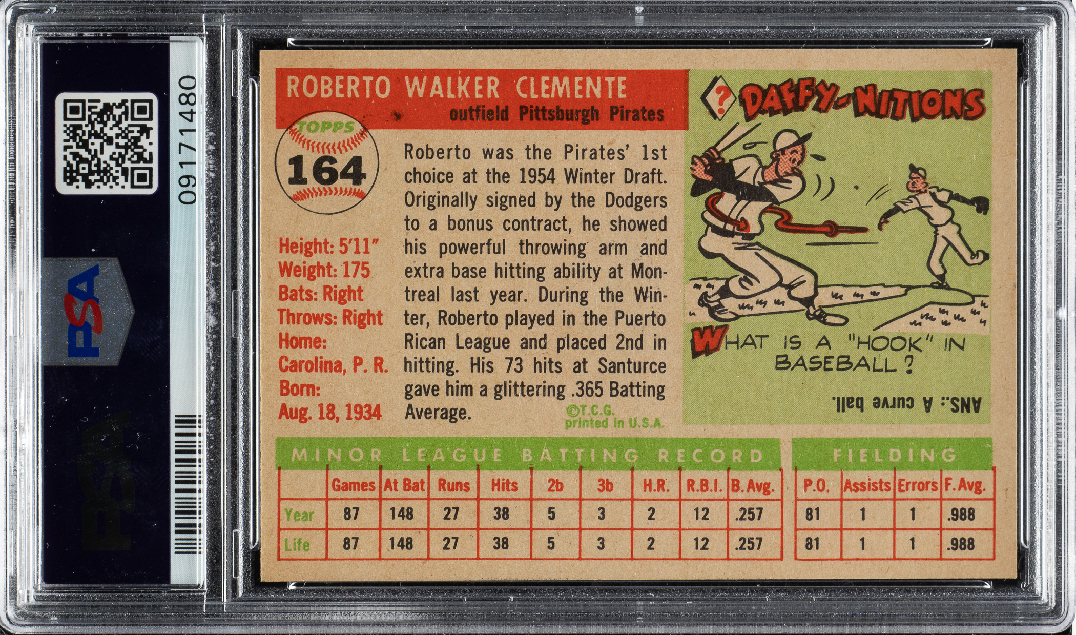 Graded NM-MT+ 8.5 by PSA. Presented is a stunning, ultra-high-grade rookie card of Hall of Famer Roberto Clemente, one of the keys to the 1955 Topps set and one of the most famous of all Topps cards. Only 12 examples grade higher out of 7,609 cards evaluated by PSA to date. This card is extraordinary in every way, bordering on MINT condition, with a flawless image, brilliant colors, outstanding centering, and four sharp corners. Particularly exceptional centering, which is so often a serious problem for Clemente rookies. Clean reverse. The market for ultra-high-grade 1955 Topps #164 Clemente rookies has soared to new levels, with a recent sale of $1,006,500 reported for a PSA MINT 9 example. This is one of the finest examples we have ever offered! This is a tremendous card of the key rookie from this popular 1950s Topps set, which would make an outstanding addition to any complete set, Hall of Fame rookie card, or Roberto Clemente collection.