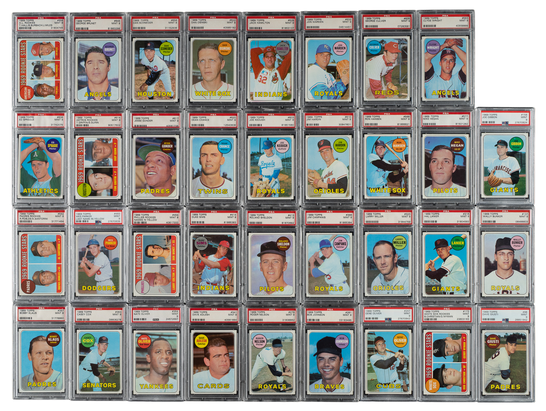 Presented is a collection of thirty-nine different 1969 Topps baseball cards, each professionally graded and encapsulated MINT 9 by PSA. This collection includes sixteen high-number cards (#589-664)! This collection consists of the following: #98, 137, 158, 173, 177, 247, 261, 279, 316, 323, 341, 354, 365, 383, 387, 396, 413, 414, 454, 493, 566, 577, 583, 592, 603, 610, 614, 617, 620, 622, 629, 632, 635, 636, 638, 645, 656, 658, and 661. Total: 39 cards. The size/weight of this item requires that there will be an additional shipping charge for this lot.