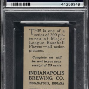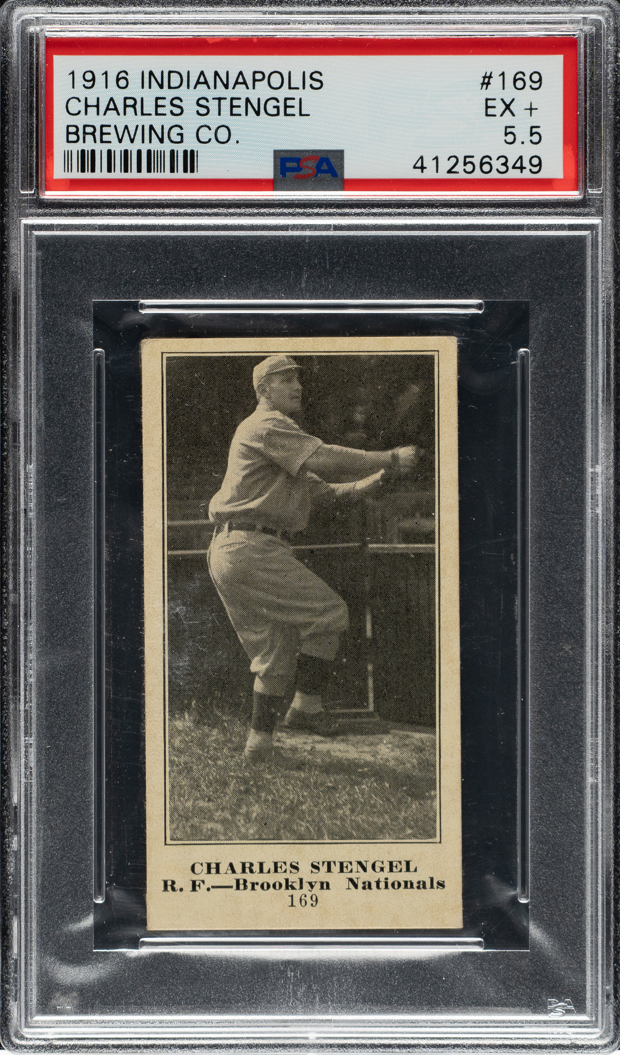 Graded EX+ 5.5 by PSA. This is the ONLY example graded at this level by PSA with none higher! Incredible rookie card of Hall of Famer Casey Stengel from the Indianapolis Brewing Co. set issued in 1916. One of the key cards to this classic prewar issue, the M101-4 (and other related issues) Casey Stengel is a fascinating and yet slightly overlooked card. Stengel appears in the 1910 T210 Old Mill Tobacco set as a minor leaguer, and his T210 card understandably generates a tremendous amount of attention. But Stengel's M101-4 card (and other related issues) is also of enormous significance as this is his first card as a Major Leaguer. The 1916 Indianapolis Brewing Co. set is identical in design to M101-4 and M101-5 Sporting News (as is the case with all the M101-4 and M101-5 sets issued by various local establishments), but with advertising on the reverse for the "Indianapolis Brewing Co. – Indianapolis, Indiana." This is a great card with any back, but the advertising reverse in this case certainly does deserve prominent mention and potentially adds a very special dimension of interest. This card has superb clarity and light corner wear. The reverse advertisement for Indianapolis Brewing Company is boldly printed in black. This is a very attractive example of Casey Stengel's true Major League rookie card featuring an ultra-rare back advertisement from one of the most important baseball-card issues of the era. We can't help but think this card is undervalued by price guides in light of both its rarity and significance.