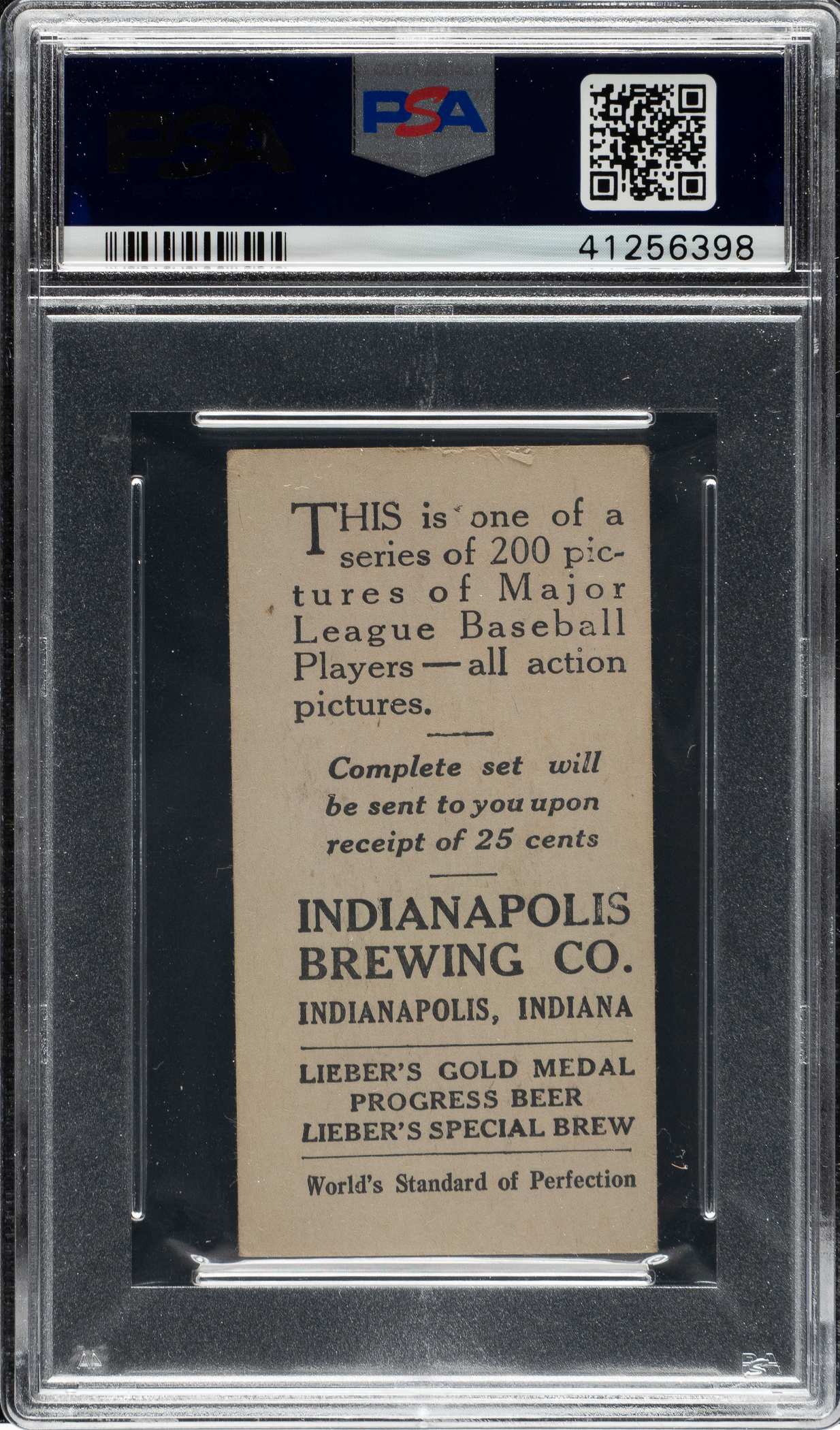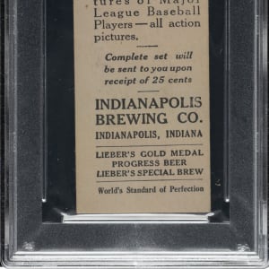 Graded VG 3 by PSA. This is the ONLY example graded at this level by PSA with none higher! Indianapolis Brewing is an exceedingly rare back for any M101-4, let alone for Chicago Cubs Hall of Famer Mordecai Brown. The 1916 Indianapolis Brewing Co. set is identical in design to M101-4 and M101-5 Sporting News (as is the case with all the M101-4 and M101-5 sets issued by various local establishments), but with advertising on the reverse for the "Indianapolis Brewing Co. – Indianapolis, Indiana." This is a great card with any back, but the advertising reverse in this case certainly does deserve prominent mention and potentially adds a very special dimension of interest. This card has superb clarity, even corner wear, and a horizontal wrinkle running through Brown's throwing arm. The reverse advertisement for Indianapolis Brewing Company is boldly printed in black. This is a very attractive example worthy of the finest Mordecai Brown or rare vintage baseball-card collection.