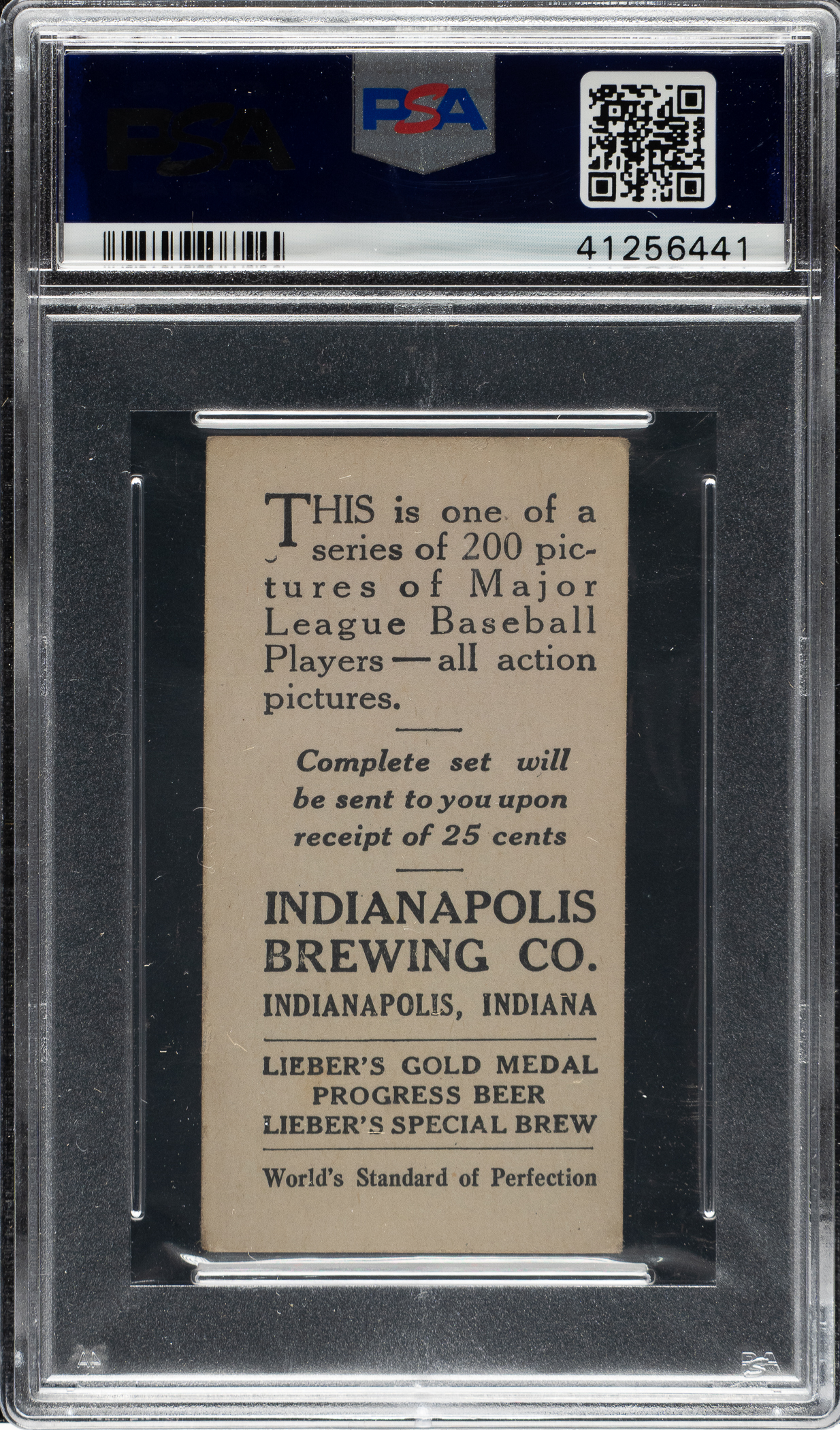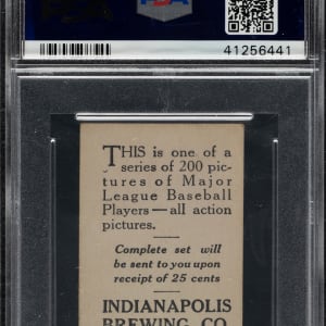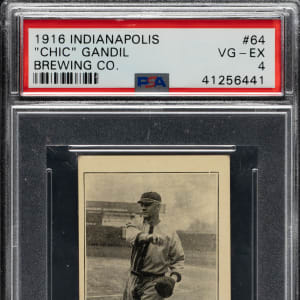 Graded VG-EX 4 by PSA. This is the ONLY example graded at this level by PSA with none higher! Indianapolis Brewing is an exceedingly rare back for any M101-4, let alone for future Black Sox member Chic Gandil. The 1916 Indianapolis Brewing Co. set is identical in design to M101-4 and M101-5 Sporting News (as is the case with all the M101-4 and M101-5 sets issued by various local establishments), but with advertising on the reverse for the "Indianapolis Brewing Co. – Indianapolis, Indiana." This is a great card with any back, but the advertising reverse in this case certainly does deserve prominent mention and potentially adds a very special dimension of interest. This card has superb clarity and honest corner wear. The reverse advertisement for Indianapolis Brewing Company is boldly printed in black. This is a very attractive example worthy of the finest Chic Gandil or rare vintage baseball-card collection.