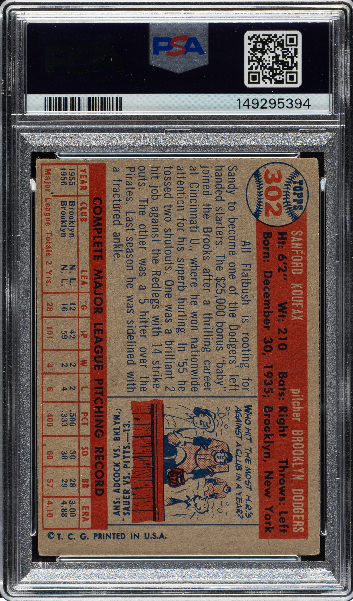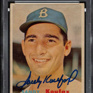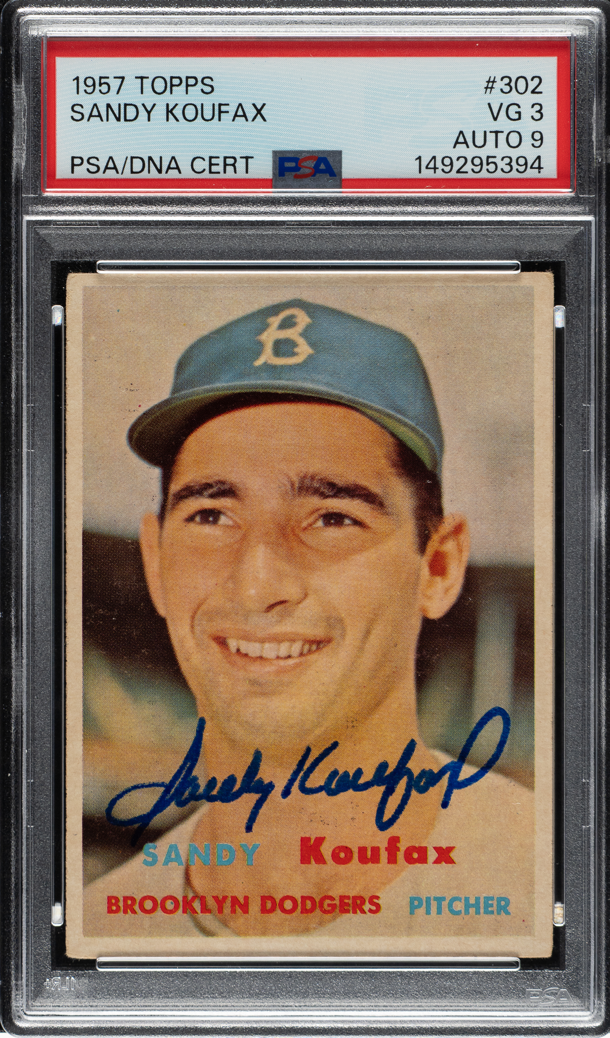 PSA/DNA has encapsulated the card, grading the signature MINT 9 and the card VG 3. Brooklyn Dodgers Hall of Famer Sandy Koufax. This is just the third signed example of this particular card we have offered. A very attractive signed example of one of Koufax's most popular cards and one of the keys from the 1957 Topps set.