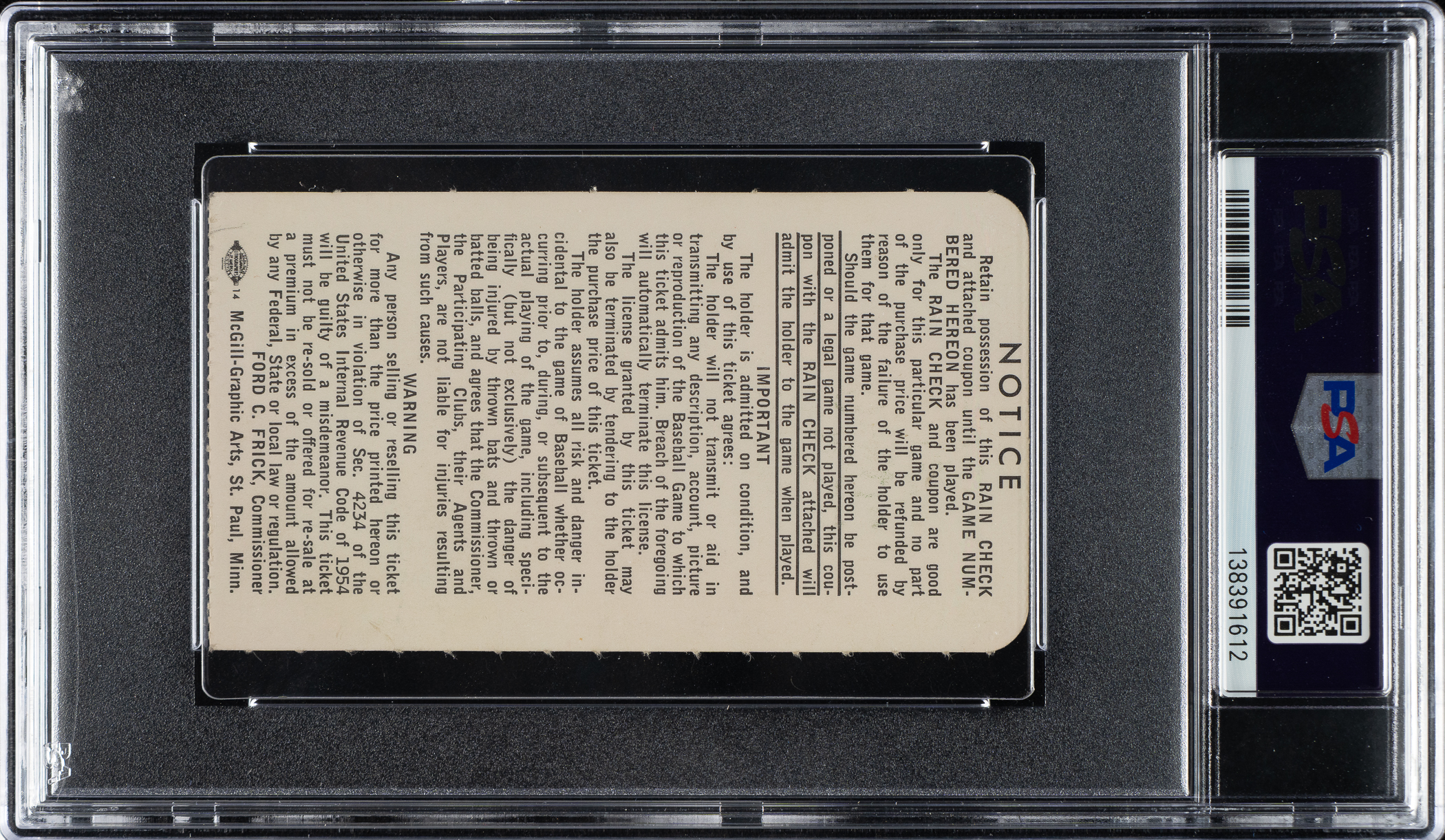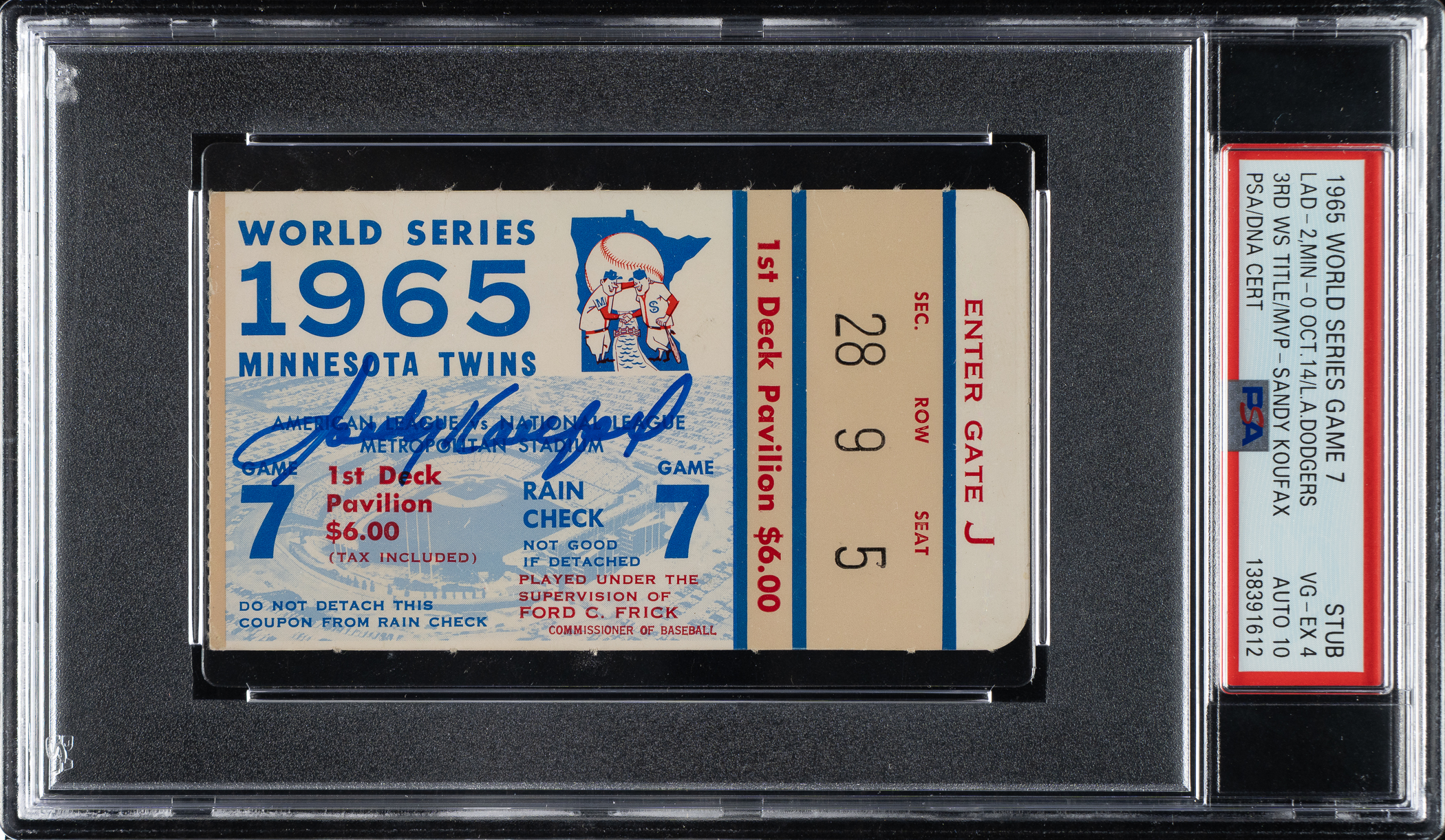 Ticket stub (4-1/8 x 2-1/4 inches) issued for Game 7 of the 1965 World Series between the Minnesota Twins and Los Angeles Dodgers, signed in blue-fine point marker by Hall of Famer Sandy Koufax on the front. PSA/DNA has graded the signature GEM MINT 10 and the ticket stub VG-EX 4. Pitching on just two days' rest, Koufax led a dominant 10-strikeout complete game shutout as the Dodgers defeated the Twins 2-0. The victory gave the franchise its second championship in three seasons and third since moving to Los Angeles in 1958. Koufax, named World Series MVP, went 2-1 with a 0.38 ERA and 29 strikeouts across 24 innings.