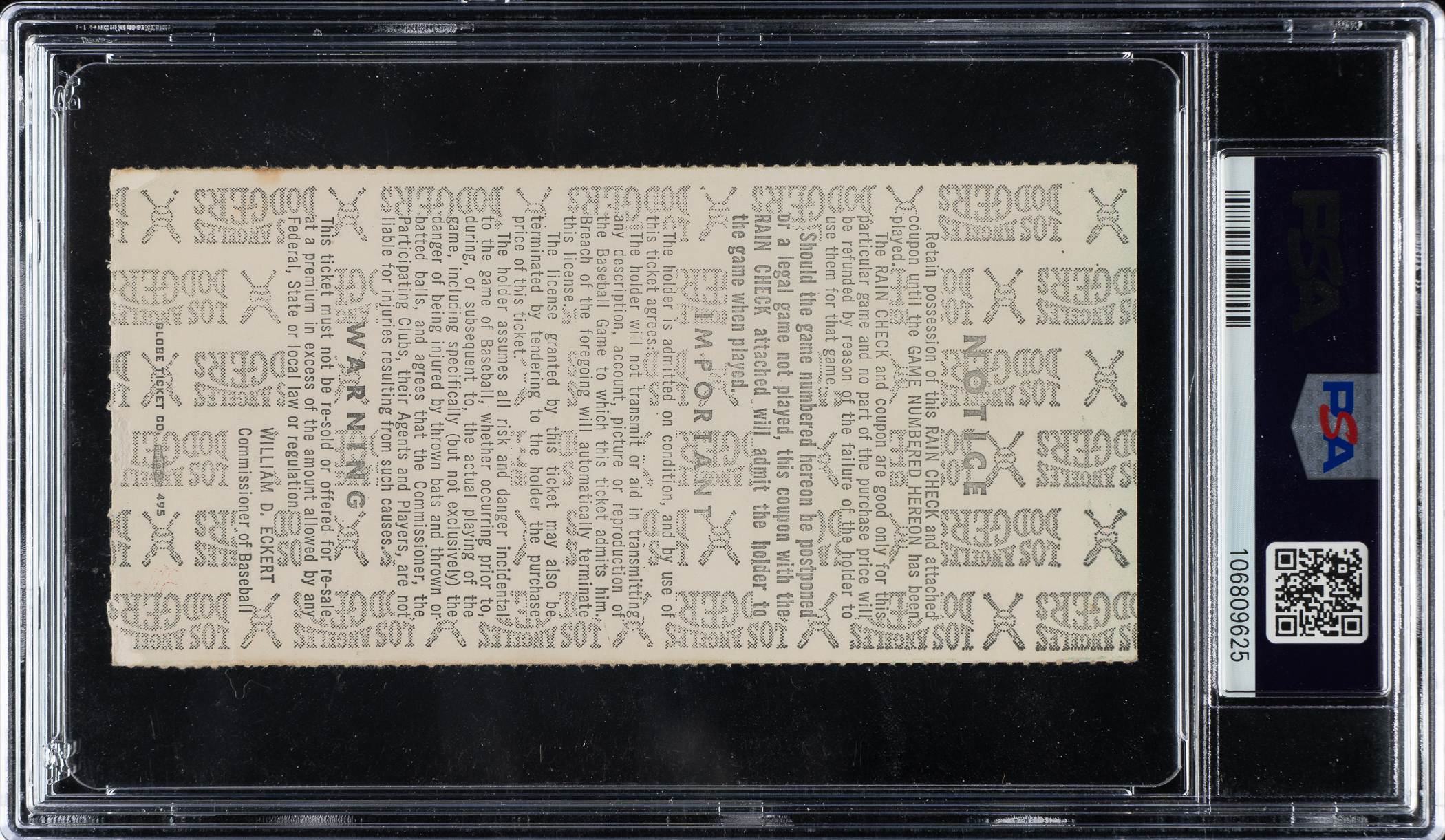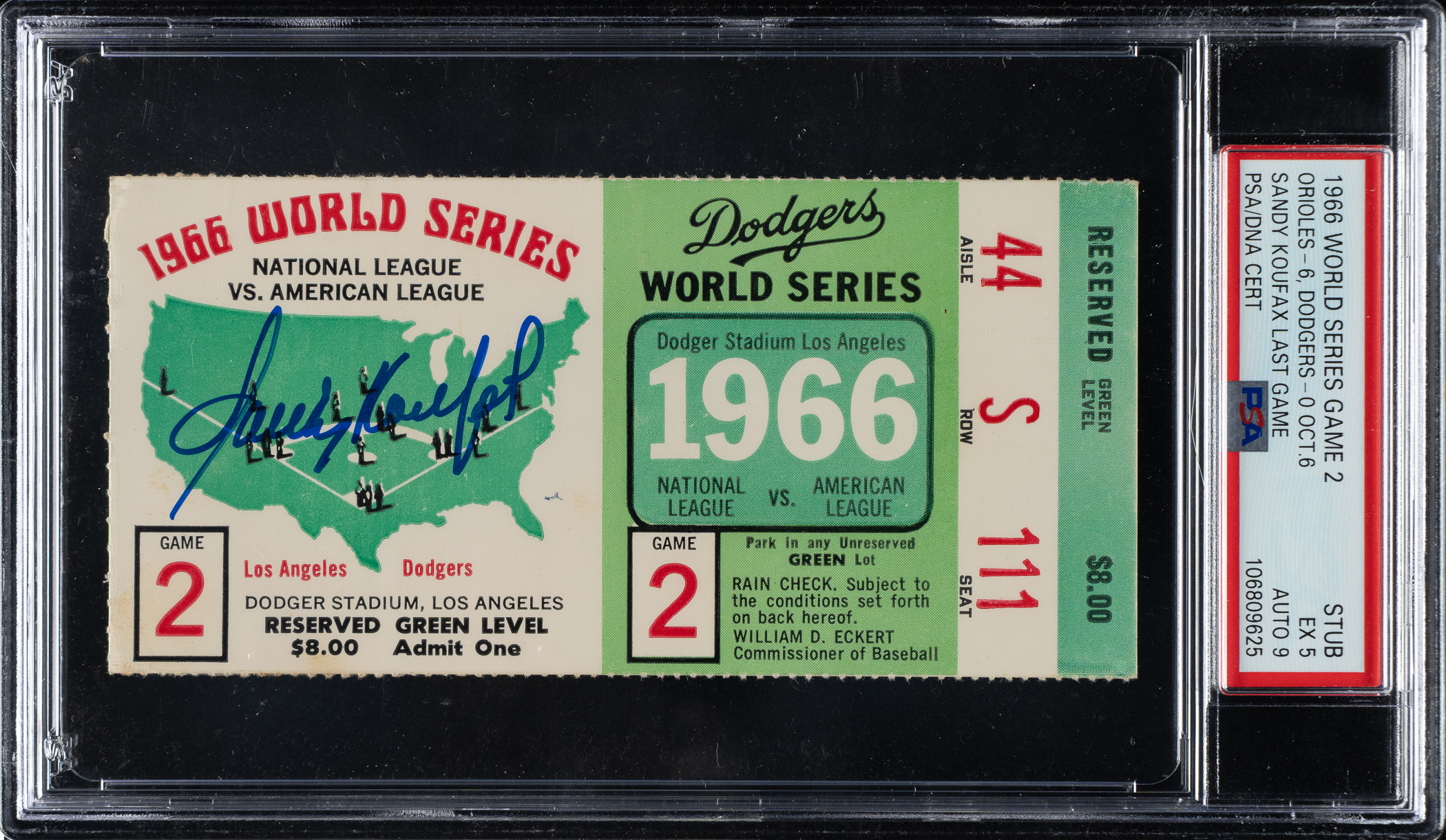 Ticket stub (5-1/8 x 2-3/8 inches) issued for Game 2 of the 1966 World Series between the Los Angeles Dodgers and Baltimore Orioles, signed by Sandy Koufax in blue fine-point marker on the front. PSA/DNA has graded the signature MINT 9 and the ticket stub EX 5. In what proved to be Koufax's final career games, his Dodgers fell 6-0, undone by poor fielding (six errors) and no run support.