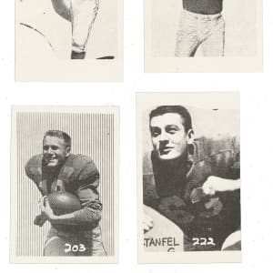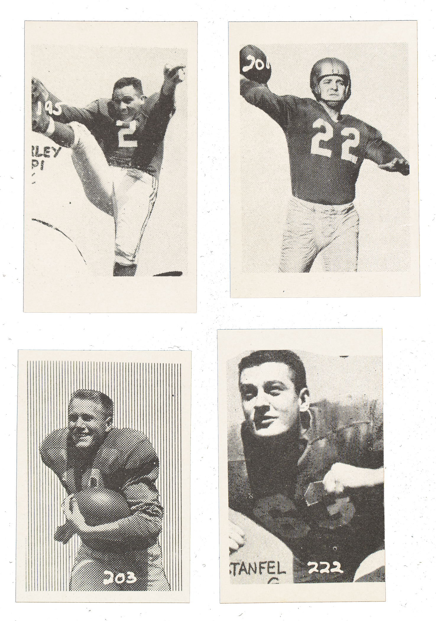 Presented is a collection of thirty-two 1955 All American Sports Club Football cards (one golf). This set was issued in 32-card sheets. This offering consists all thirty-two cards from the 7th sheet (#193-224). The last card from this run is a golfer Loddie Kempa (the other thirty-one cards are all football players). Neatly hand cut to varying heights and widths, the condition is Gd to Vg overall, with a couple slightly higher and lower. Keys: #195 Trippi (Vg-Ex, HOF), 201 Layne (Gd+, HOF), 203 Christiansen (Vg-Ex, HOF), and 222 Stanfel (Vg, HOF). Total: 32 cards.