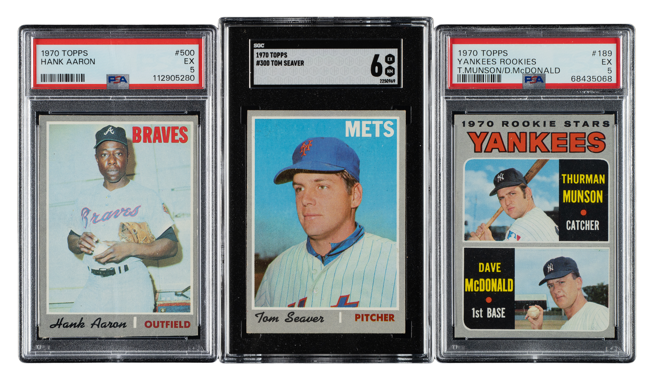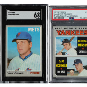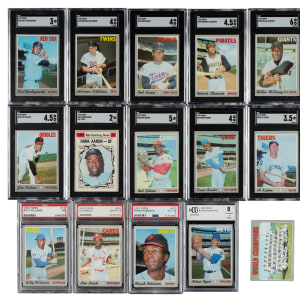 Very attractive near-complete 1970 Topps baseball set consisting of 715 different cards (out of 720 in the set). The 1970 Topps set was the largest set of Topps cards issued to that date. Missing the following five cards for completion: #140 Jackson, 580 Rose, 600 Mays, 621 Evans, and 660 Bench. Includes fourteen duplicates (#195, 196, 197, 198, 199, 200, 201, 202, 305, 306, 307, 308, 309, and 310). Ninety-one cards have been professionally graded and encapsulated by PSA (56) and SGC (35). PSA Grading Composite: NM-MT+ 8.5 (3 cards): #553, 624, and 633. NM-MT 8 (29 cards): #56, 206, 228, 267, 274, 278, 281, 292, 298, 330 Brock, 336 (OC), 347, 356, 371, 372, 374, 381, 420, 477, 492, 564, 591, 597, 607, 625, 626, 627, 708, and 709. NM 7 (10 cards): #143, 170 B. Williams, 174, 329, 348, 382, 425, 444, 531, and 560 G. Perry. EX-MT+ 6.5 (3 cards): #27, 121, and 610 (SGC). EX-MT 6 (11 cards): #23 (SGC), 70, 250 McCovey (SGC), 286, 300 Seaver (SGC), 459 Jackson AS, 461 Yastrzemski AS, 463 F. Robinson AS, 506, 585 (SGC), and 669. EX+ 5.5 (1 card): #50 (SGC). EX 5 (9 cards): #2 (SGC), 114 (SGC), 116 (SGC), 189 Munson RC, 225 (SGC), 500 Aaron, 530 Gibson (SGC), 622 Sutton, and 634 (SGC). VG-EX+ 4.5 (3 cards): #350 Clemente (SGC), 449 Palmer (SGC), and 595 (SGC). VG-EX 4 (8 cards): #150 Killebrew (SGC), 160 Niekro, 190 Torre (SGC), 230 B. Robinson (SGC), 290 Carew (SGC), 470 Stargell (SGC), 630 Banks (SGC), and 700 F. Robinson. VG+ 3.5 (2 cards): #453 Carew AS (SGC) and 640 Kaline (SGC). VG 3 (5 cards): #10 Yastrzemski (SGC), 30 (SGC), 60 (SGC), 137 (SGC), and 240 Jenkins (SGC). GOOD+ 2.5 (1 card): #620 (SGC). GOOD 2 (5 cards): #20 (SGC), 458 Rose AS (SGC), 462 Aaron AS (SGC), 464 Bench AS (SGC), and 537 Morgan (SGC). POOR 1 (1 card): #450 McCovey AS (SGC). The condition of the 638-card unencapsulated balance is 29% Ex to Ex-Mt (including 3% lesser), 65% Vg to Vg-Ex, and 6% lesser (including a few with a slight miscut). The condition of the 624-card unencapsulated balance is 29% Ex to Ex-Mt (including 3% better), 65% Vg to Vg-Ex, and 6% lesser (including a few with a slight miscut). Unencapsulated Keys: #1 Mets Team (Vg-Ex), two 197 NL Playoff Gm. 3 - Ryan (Ex and Vg), and 712 Ryan (Vg-Ex+, card resides in a BCCG holder). Dating from when sets could not be purchased all at once, and had to be assembled by series as they were released throughout the season, this 1970 Topps near-complete set includes a countless array of stars and Hall of Famers. Total: 729 cards (near set of 715 plus 14 duplicates). The size/weight of this item requires that there will be an additional shipping charge for this lot.