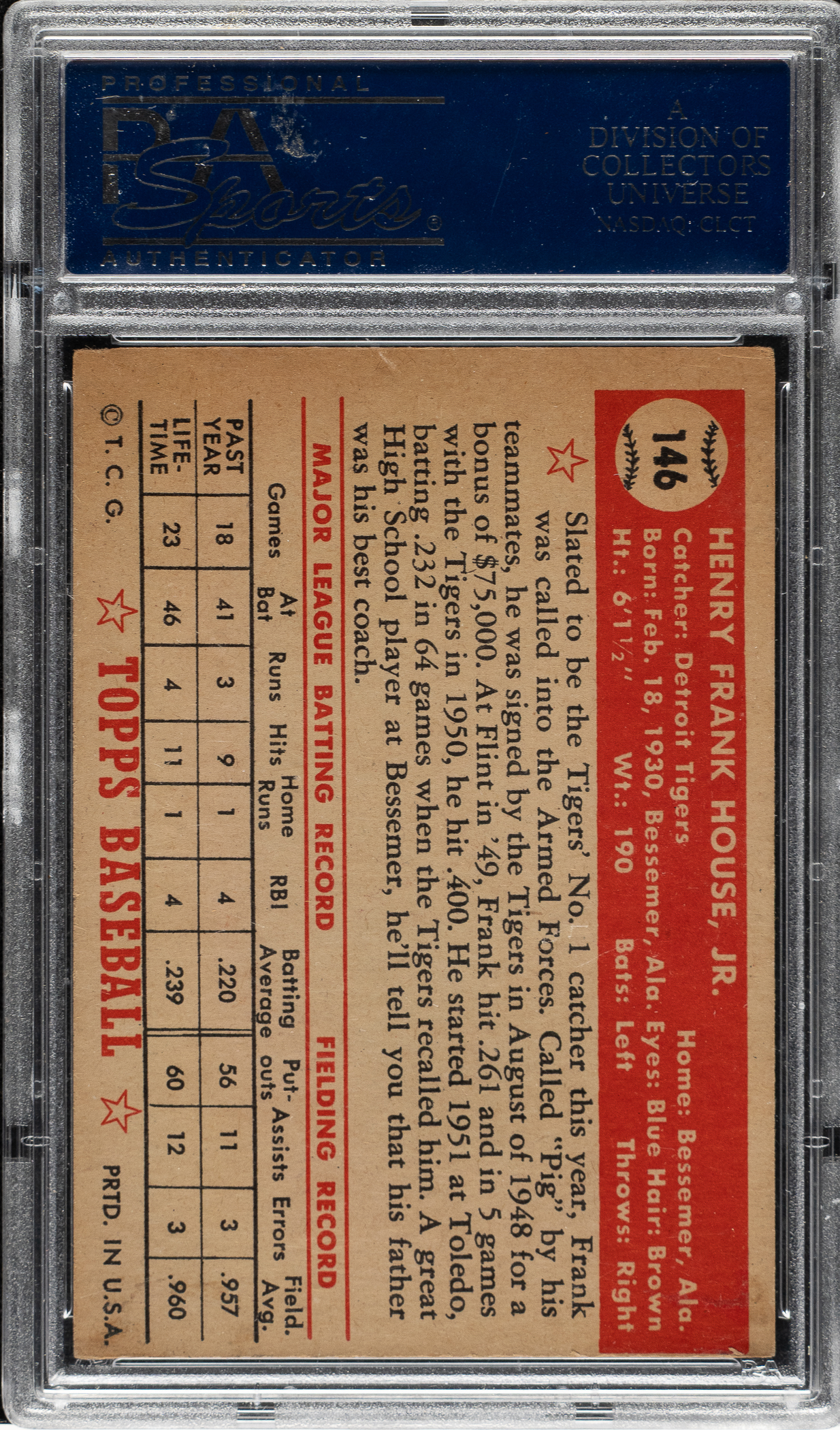 Graded VG-EX 4 by PSA. Extremely rare example of the 1952 Topps "Yellow Tigers Logo" printing variation of Frank House, Detroit. The color of the Tigers logo on this card is noticeably different than on other Houses. It has a distinct yellow coloring compared to the standard orange-colored logo. The card is bright and crisp, both front and back, with light wear on the corners (weaker top right) and centering toward the extreme bottom. Bold colors and virtually perfect registration. This is an extremely attractive example of this virtually impossible-to-find 1952 Topps variation, worthy of any master set.