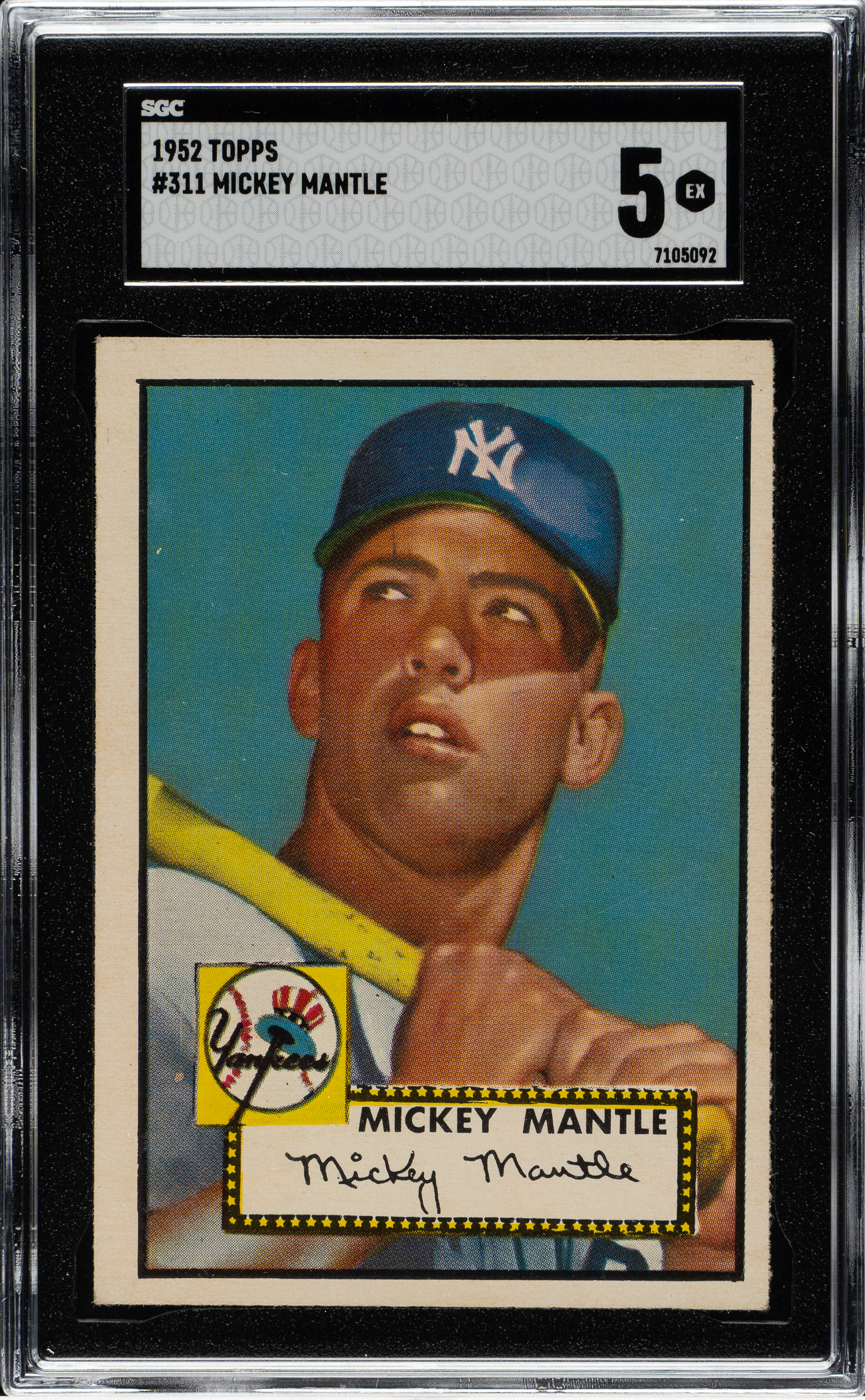 Graded EX 5 by SGC (submitted by REA). Outstanding mid-grade example of the 1952 Topps #311 Mickey Mantle. One of card collecting's classics, Mantle's Topps rookie card is the key to the 1952 Topps set, one of the most famous of all cards, and the single most popular and valuable postwar baseball card. The offered example has vibrant colors, a crisp image, and light corner wear. The reverse is clean with bold printing. The 1952 Topps Mantle has long been recognized as one of the most iconic "blue chips" of all vintage baseball cards, and even just a glance at sales records clearly shows that over the years it has consistently risen in value in all grades. This 1952 Topps Mantle presents a particularly significant collecting and investing opportunity as it is such a strong and attractive example in a particularly desirable grade! This is a beautiful example of Mickey Mantle's most celebrated card.