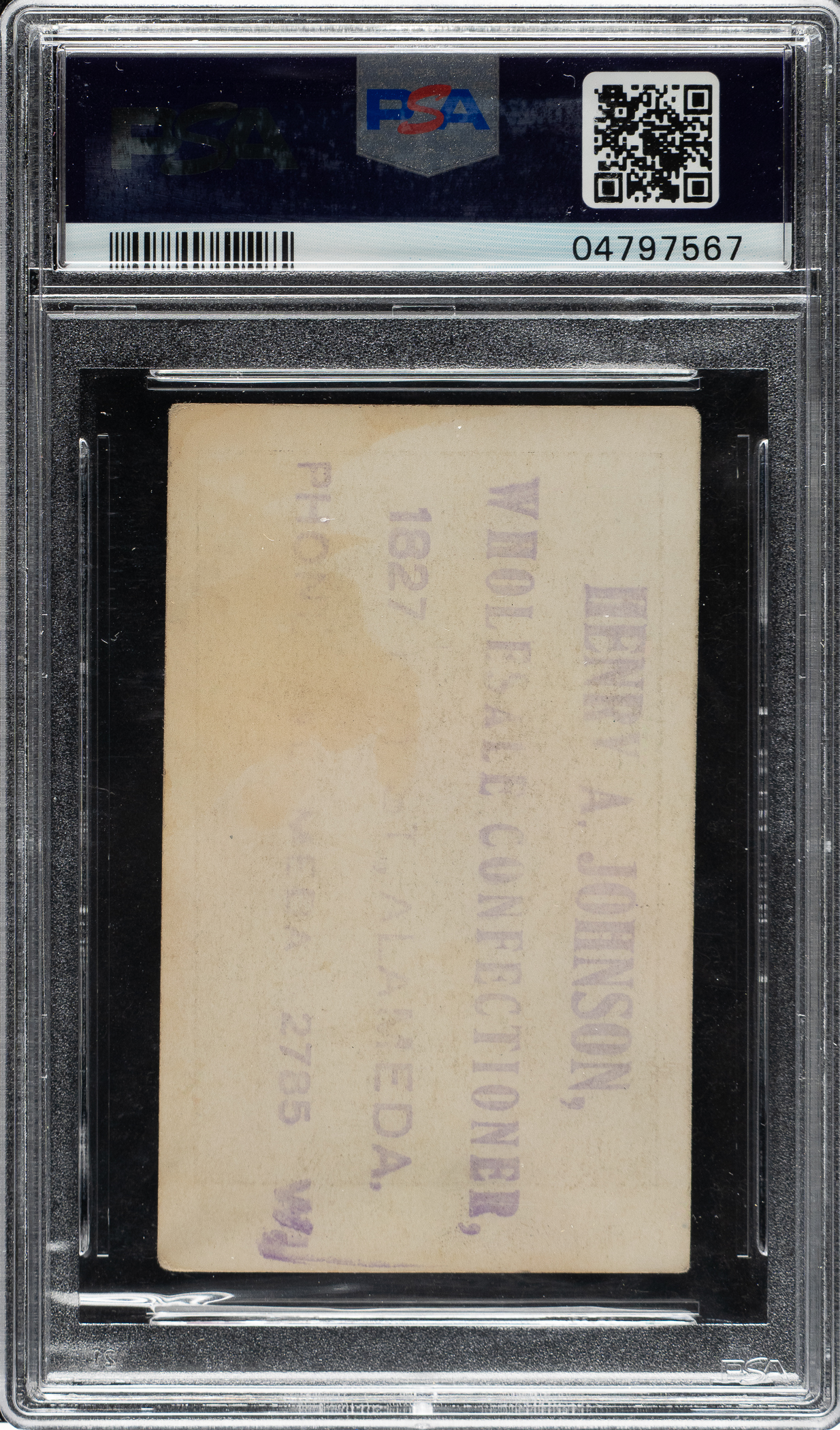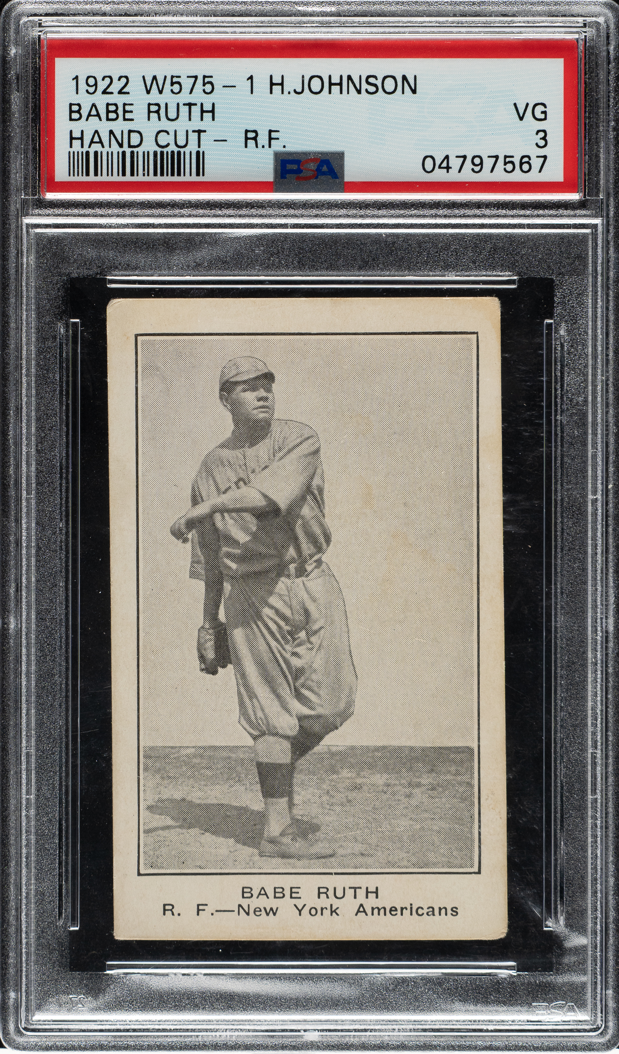 Graded VG 3 by PSA. Presented is a very rare example of New York Yankees Hall of Famer Babe Ruth from the enigmatic Henry Johnson Confectioner set. To date, PSA has encapsulated only five examples of this card and SGC has evaluated one example. This is one of two highest graded examples by PSA! It is rare to find even a common player sample card from this issue, let alone a major Hall of Famer. An example from the Henry Johnson Confectioner set is missing from almost every advanced sample-card collection, and this is the only example of Ruth we have offered in the last two decades! Cards from this set are closely related in design to the E121 American Caramel and W575-1 series. The blank reverse was available to a retailer like Henry Johnson to stamp as a promotional vehicle. The back stamping, which is faint in some areas on this example, displays the Henry A. Johnson Wholesalers name along with an Oakland, Calif. address and phone number. The front of the card displays a very strong image of Ruth in a throwing pose, even wear to the corners, and outstanding centering. The reverse has a light stain in the lower left. This is an outstanding example of one of Babe Ruth's rarest and most classic 1920s cards and one that would be a worthy addition to any high-quality Babe Ruth or prewar-card collection.