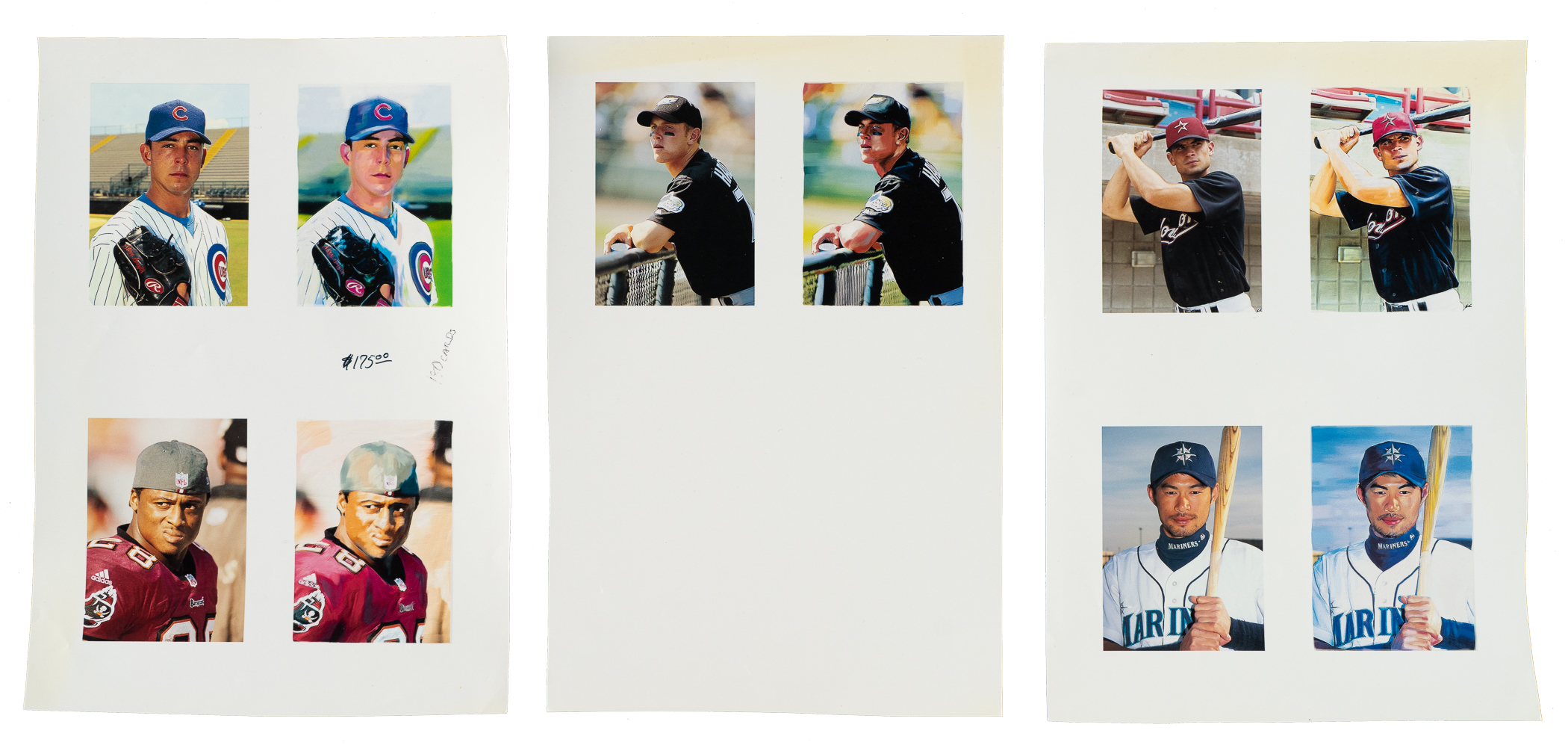 Collection of five 2001 Topps Gallery pre-production proofs. This collection consists of the following: Warrick Dunn (football),Scott Elarton, Josh Hamilton, Steve Smyth, andIchiro Suzuki. Measuring 8 x 10 inches, the proofs are in Near Mint condition overall. Total: 5 proofs.