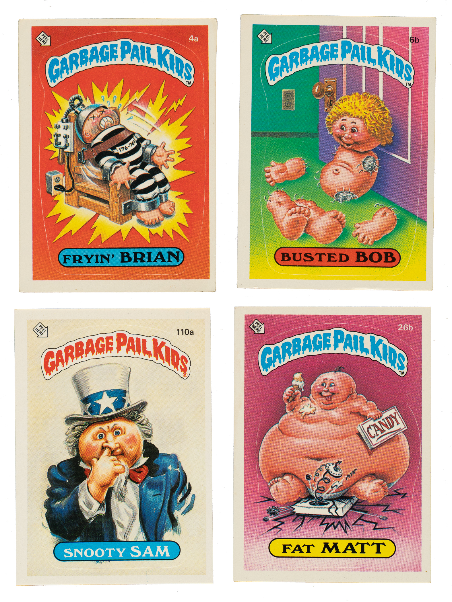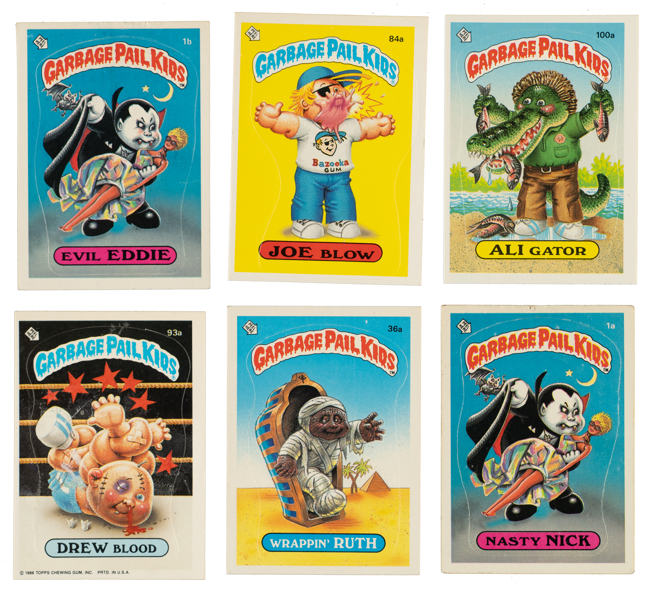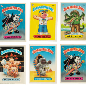 Presented are two near-complete sets of the 1985 Topps "Garbage Pail Kids" stickers, representing the first and third original series of this popular 1980s nonsport issue. Also included are two duplicates. Clearly a parody of Coleco's popular Cabbage Patch Kids dolls (which ultimately led to a trademark infringement lawsuit), Topps Garbage Pail Kids cards were the brainchild of Pulitzer Prize-winning cartoonist Art Spiegelman (of Maus graphic novel fame), who was also the main creator of Topps Wacky Packages. Each sticker features a humorously drawn cartoon kid with a rhyming, alliterative, or word-play nickname. Topps Garbage Pail Kids stickers were an instant hit with youngsters, with many schools banning them because of their edgy content and the distractions they caused. This collection consists of the following: 1) Series 1 Near-Complete Set (76/82): Condition is 30% Ex or slightly better and 70% Vg to Vg-Ex (including a few lesser and a few miscut). Missing the following six cards for completion: #8a Adam Bomb, 8b Blasted Billy, 9b, 22b, 27a, and 39a. Keys: #1a Nasty Nick (pencil on reverse, otherwise Gd+) and 1b Evil Eddie (Vg). 2) Series 3 Near-Complete Set (80/82) Plus Two Duplicates: Condition is 55% Nr/Mt to Nr/Mt-Mt, 35% Ex to Ex-Mt, and 10% Vg to Vg-Ex. Missing the following two cards for completion: #91b and 111a. Also included are two duplicates of #114a. This is a very attractive collection of mid-to high-grade stickers from these popular 1980s nonsport sets. Total: 158 stickers.
