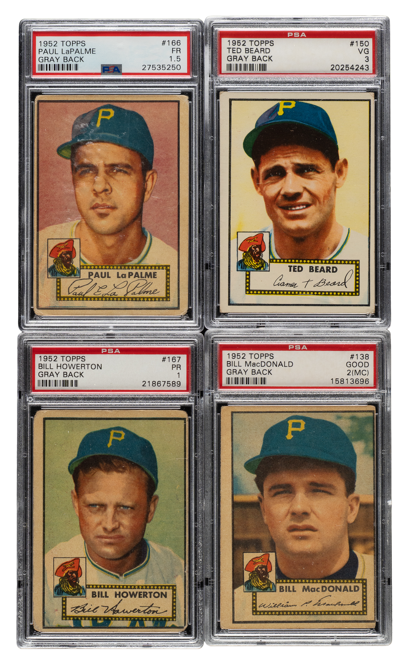 Complete team set of 1952 Topps "Canadian" Gray Back Pittsburgh Pirates, each graded and encapsulated by PSA. This set consists of the following: #138 (GOOD 2 [MC]), 150 (VG 3), 154 (POOR 1), 166 (FAIR 1.5), 167 (POOR 1), 170 (Authentic), and 183 (GOOD 2 [MK]). The Standard Catalog of Baseball Cards presents a theory that gray back cards from #131-190 (typically printed on cream-colored stock) within the 407-card 1952 Topps set have come to commonly be known as Canadian issued. The same phenomenon exists with 1954 Topps and an abbreviated set printed on gray stock designed for issue solely in Canada that year. Some collectors feel that this is a misnomer, instead theorizing that Topps produced a run of cards in this manner for one of two reasons. One theory is as simple as a temporary shortage of regular cream-colored stock in the factory during production. The other focuses on the slight differences in the card fronts which, as the Standard Catalog notes, are "subjectively darker or more muted than the 'U.S.A.' versions." Some collectors believe that these cards were designed as part of a distribution arrangement with Doeskin tissues in which cards were inserted with packages of tissues. While no concrete evidence of this relationship has been unearthed, it is known that the "Rails and Sails" nonsport issue produced by Topps in 1955 was issued along with Doeskin tissues at the time. Bob Lemke, former editor of the Standard Catalog, presents a detailed analysis of these variations on his blog (http://boblemke.blogspot.com/2011/05/1952-topps-not-canadian.html), which includes input from several longtime collectors and hobby researchers. Whatever the explanation for these cards, it is without dispute that they are extremely rare and even a single example can be hard to find. Total: 7 cards.