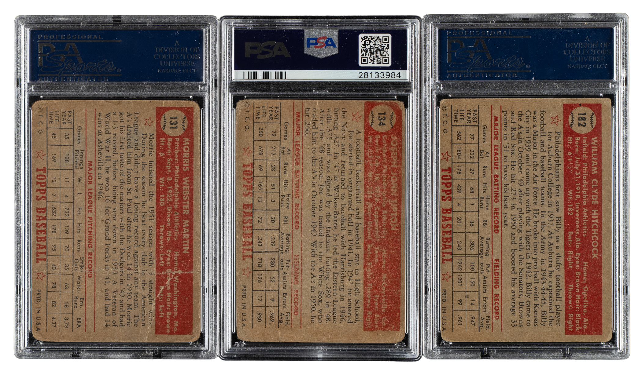 Complete team set of 1952 Topps "Canadian" Gray Back Philadelphia Athletics, each graded and encapsulated by PSA. This set consists of the following: #131 (POOR 1), 134 (POOR 1), and 182 (FAIR 1.5 [MK]). The Standard Catalog of Baseball Cards presents a theory that gray back cards from #131-190 (typically printed on cream-colored stock) within the 407-card 1952 Topps set have come to commonly be known as Canadian issued. The same phenomenon exists with 1954 Topps and an abbreviated set printed on gray stock designed for issue solely in Canada that year. Some collectors feel that this is a misnomer, instead theorizing that Topps produced a run of cards in this manner for one of two reasons. One theory is as simple as a temporary shortage of regular cream-colored stock in the factory during production. The other focuses on the slight differences in the card fronts which, as the Standard Catalog notes, are "subjectively darker or more muted than the 'U.S.A.' versions." Some collectors believe that these cards were designed as part of a distribution arrangement with Doeskin tissues in which cards were inserted with packages of tissues. While no concrete evidence of this relationship has been unearthed, it is known that the "Rails and Sails" nonsport issue produced by Topps in 1955 was issued along with Doeskin tissues at the time. Bob Lemke, former editor of the Standard Catalog, presents a detailed analysis of these variations on his blog (http://boblemke.blogspot.com/2011/05/1952-topps-not-canadian.html), which includes input from several longtime collectors and hobby researchers. Whatever the explanation for these cards, it is without dispute that they are extremely rare and even a single example can be hard to find. Total: 3 cards.
