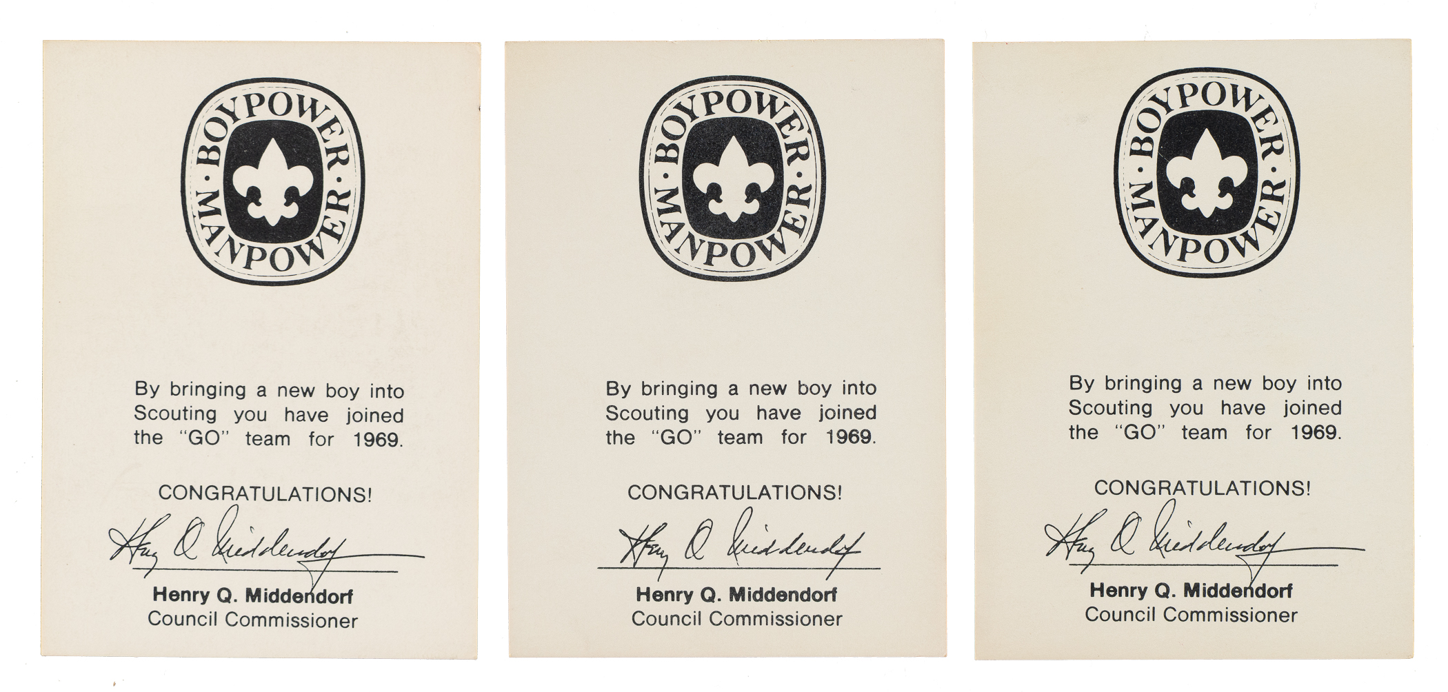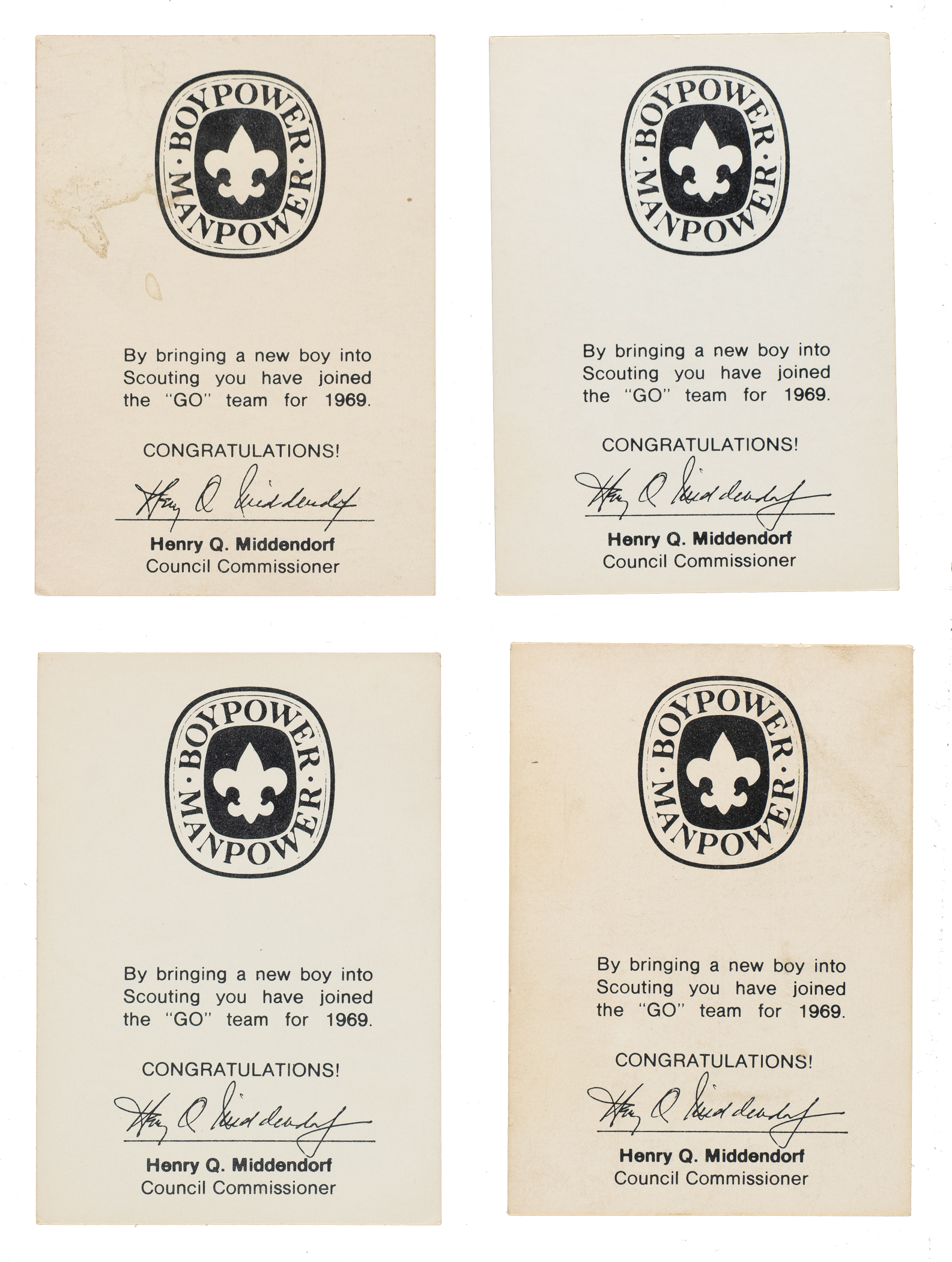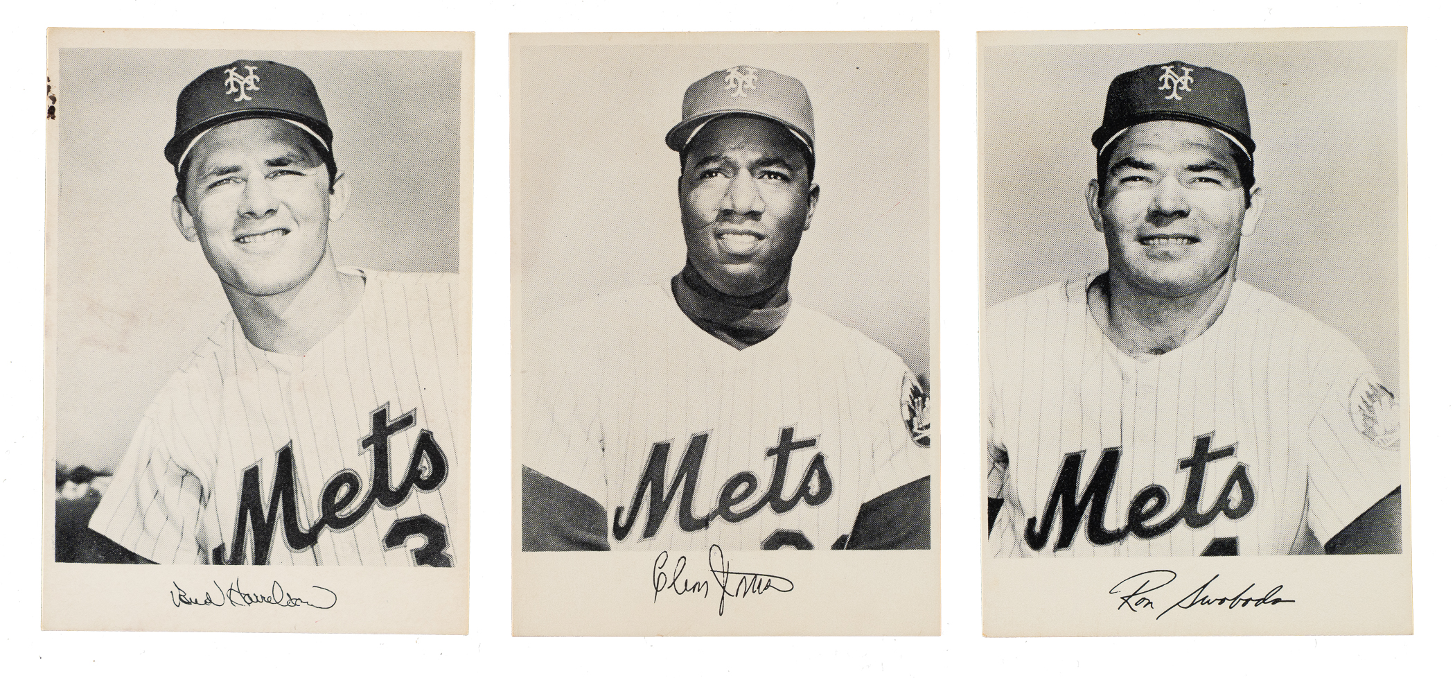 Exceptional near-complete set of seven cards from the scarce 1969 N.Y. Boy Scouts issue, missing only Tommy Agee and Art Shamsky for completion. This set, which was produced by the Boy Scouts as a recruitment tool, rewarded members who encouraged their friends to join the Boy Scouts. The reverse reads "By bringing a new boy into Scouting, you have joined the GO team for 1969. Congratulations!" The facsimile signature of the Council Commissioner is underneath. These cards, which feature hometown New York Mets and Yankees heroes, were regionally issued and are extremely rare. Only sixty-one examples in total have been graded from this set by PSA and SGC combined. According to the Standard Catalog, nine different players in the set are known to date (though others may be discovered). The near-complete set consists of the following: Harrelson (small marks on left border, otherwise Ex+), C. Jones (Vg-Ex+), Murcer (Vg-Ex), Pepitone (Vg), Seaver (Gd due to stain, HOF), Stottlemyre (Vg-Ex), and Swoboda (Vg-Ex). This is an outstanding near-complete set of this rarely-encountered regional issue. Total: 7 cards.