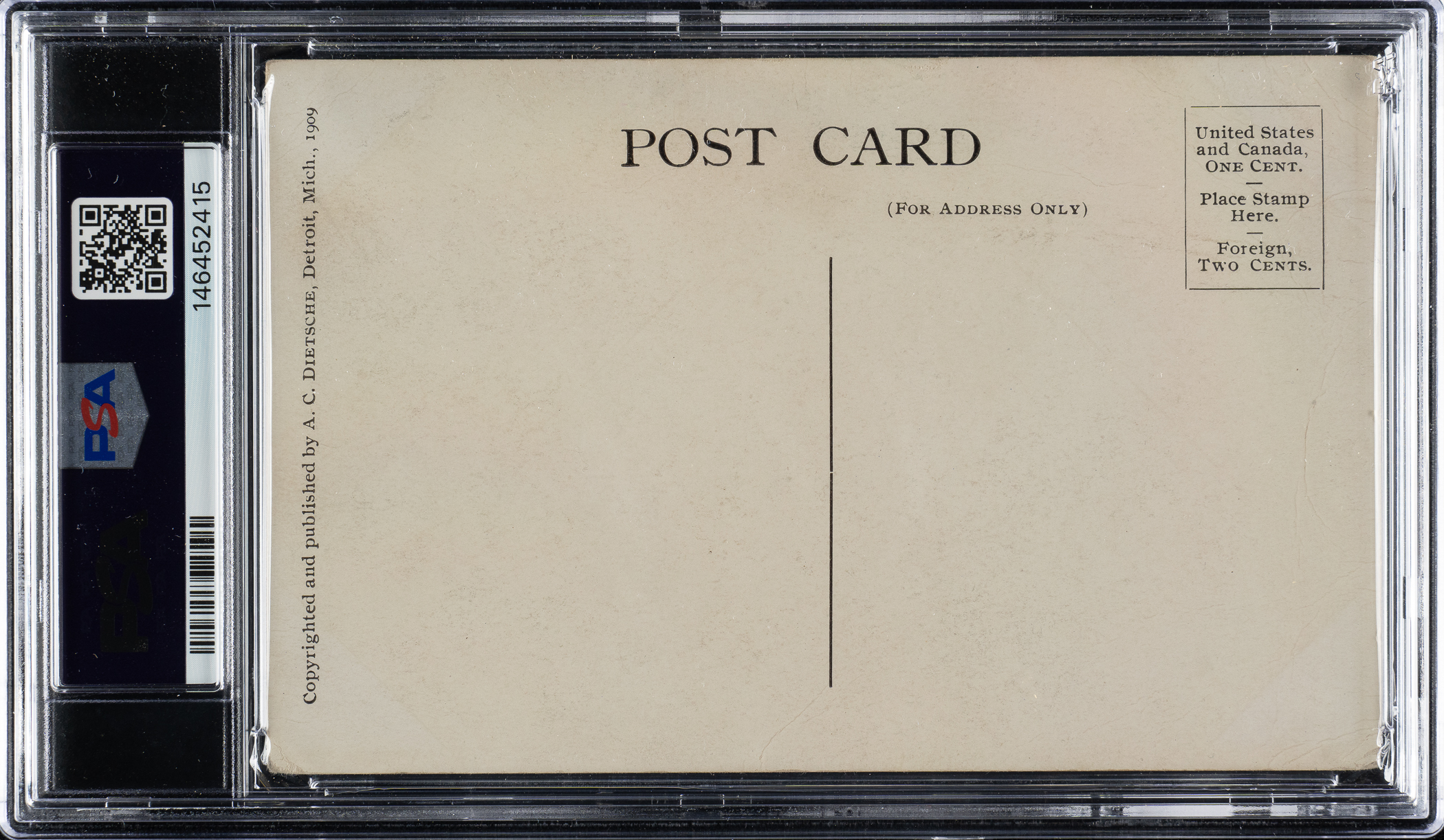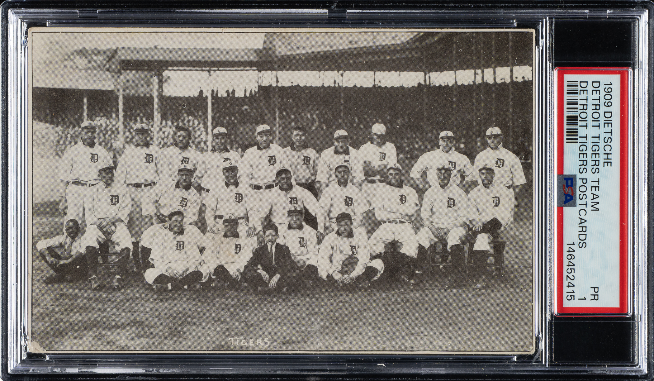 Scarce real-photo postcard capturing the Detroit Tigers in a classic team pose issued in 1909 by A. C. Dietsche. Twenty-two team members are pictured posing on the field in front of the grandstand, including Ty Cobb, manager Hughie Jennings, Sam Crawford, and George Mullin. The Dietsche Detroit Tigers postcard set, which consists of 32 cards, was issued in three series from 1907 to 1909. The team card offered here is one of the four cards issued in the final series in 1909. The postcard (5.5 x 3.5 inches) has a number of moderate creases throughout and even corner wear. There is no writing on the reverse. Graded POOR 1 by PSA (submitted by REA).