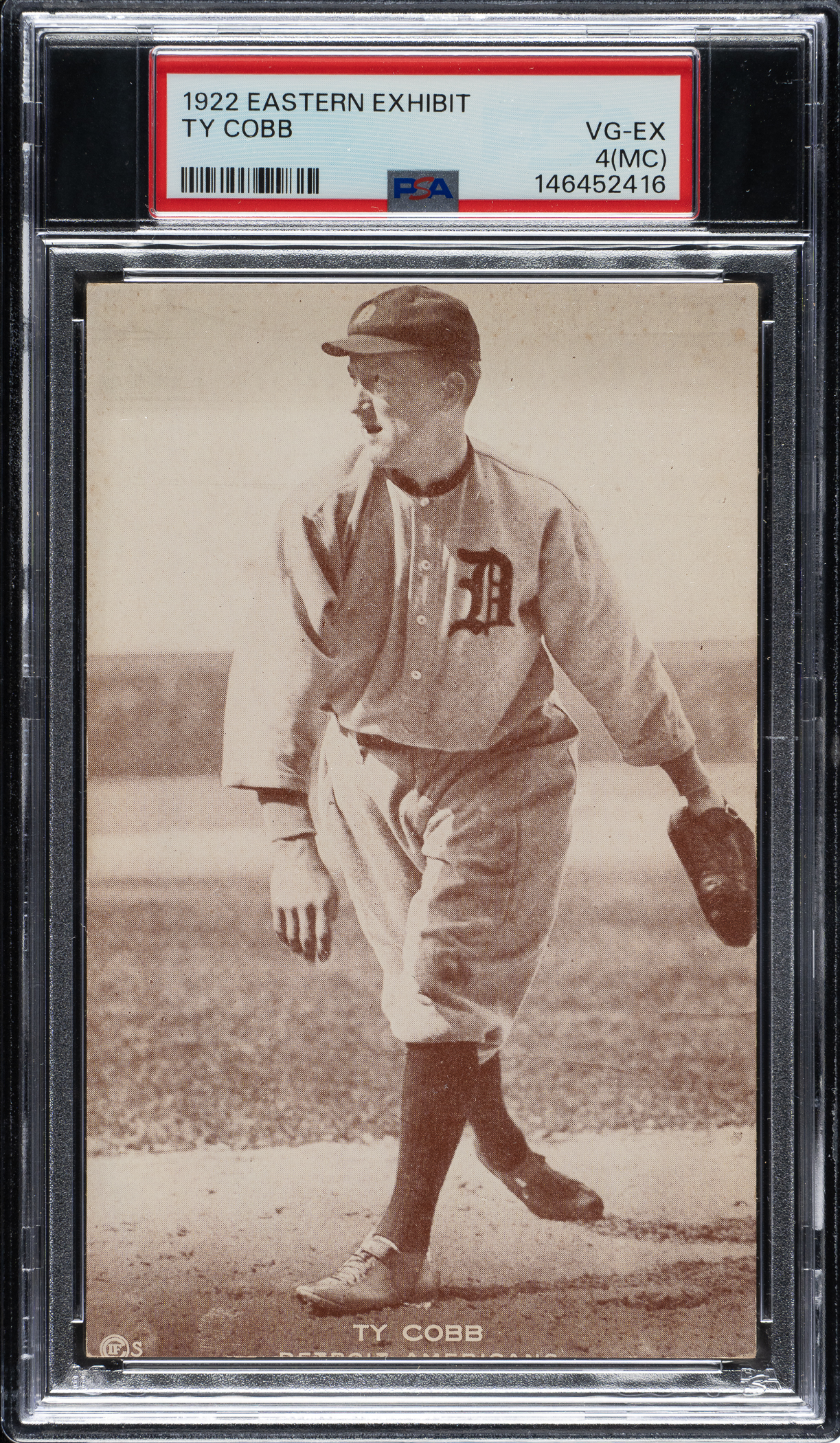 Graded VG-EX 4 (MC) by PSA (submitted by REA). Outstanding mid-grade example of Detroit Tigers Hall of Famer Ty Cobb from the sepia-toned 1922 Eastern Exhibit Supply Co. series. Cards from this unusual and distinctive Exhibit-style set are considerably rarer than the black-and-white Exhibit cards of the same era. The card is bright and crisp with outstanding picture quality and light corner wear. The team name along the base has been partially cut off, hence the "MC" qualifier by PSA. The card has never been mailed and has no writing on its traditional postcard-style reverse. It is interesting to note that the printed copyright line on the back with the company's Philadelphia address has been blacked out and the new Chicago address is printed below it.
