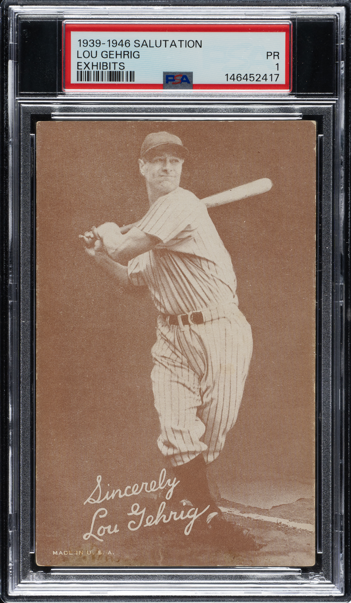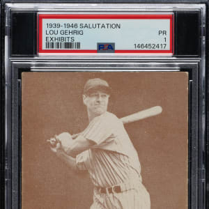 Classic example of New York Yankees Hall of Famer Lou Gehrig from the Salutation Exhibits set. These unnumbered cards are not dated and were issued over a series of years, and they are generally collected as a single set. Some cards in this Exhibit-card series were issued for numerous years, while other players were issued for only a short period of time, creating many rarities. Gehrig is one of the players who fall into the latter category, unfortunately, as his debilitating disease ended his prolific baseball career in April 1939, right as this set was issued (Gehrig succumbed to his disease in 1941 at the age of 37). This makes the offered card the final card ever issued of Lou Gehrig as a player. The card has a crisp image with a clean facsimile signature ("Sincerely, Lou Gehrig"). Graded POOR 1 by PSA (submitted by REA) largely due to evidence of album removal on the blank reverse.