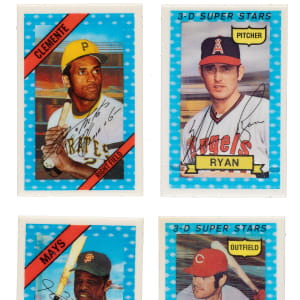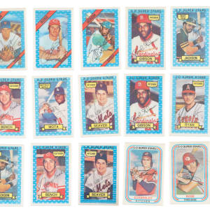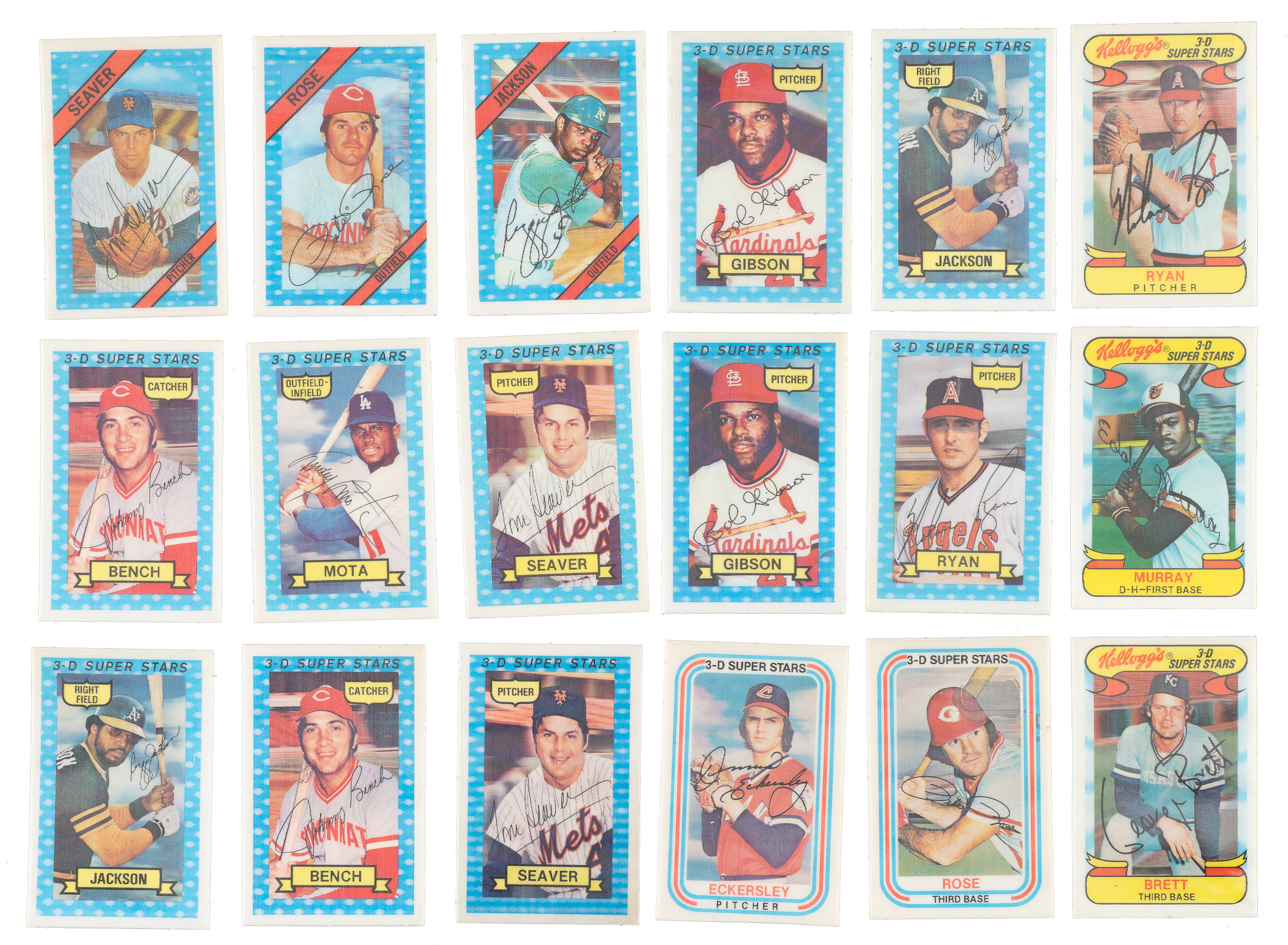 Outstanding collection of nine complete sets of Kellogg's baseball cards, spanning the years 1972 to 1979, for a total of 462 cards. Throughout the 1970s and early 1980s, the Kellogg's cereal company was the only true competition for Topps in the baseball-card market. These sets include cards of Willie Mays, Roberto Clemente, Nolan Ryan, Tom Seaver, Reggie Jackson, and Pete Rose. All the other stars of the day are also included. Of course, instead of having to buy only a stick of gum to get a stack of cards, you had to buy an entire box of cereal just to get one card (unless you sent in for a set by mail). This collection consists of the following: 1) 1972 Kellogg's Complete Set (54): Condition is Nr/Mt to Nr/Mt-Mt overall, with a few Ex-Mt and two lesser due to cracking. Keys: #1 Seaver (Ex-Mt), 6 Rose (Ex-Mt), 20 Jackson (35/65 T/B, otherwise Nr/Mt-Mt), 49 Clemente (Nr/Mt-Mt), and 54 Mays (Fr due to cracking). 2) 1972 Kellogg's All-Time Greats Complete Set (15): Condition is Nr/Mt-Mt to Mint overall, with a couple Nr/Mt and one lesser due to a very small surface crack. 3) 1973 Kellogg's Complete Set (54): Condition is 57% Nr/Mt to Nr/Mt-Mt, 28% Ex to Ex-Mt, and 15% Vg-Ex or slightly lesser. Keys: #6 Rose (Ex) and 16 Ryan (Vg-Ex+). 4) 1974 Kellogg's Complete Set (54): Condition ranges from Nr/Mt to Mint (averaging Nr/Mt-Mt), with a couple lesser. Keys: #8 Ryan (Gd due to cracking), 28 Bench (Mint), and 38 Rose (Mint). 5) 1974 Kellogg's Complete Set (54): Condition is 77% ranging from Nr/Mt to Mint (averaging Nr/Mt-Mt) and 23% lesser due to cracking Keys: #8 Ryan (Gd due to cracking), 28 Bench (Ex-Mt), and 38 Rose (Nr/Mt-Mt). 6) 1976 Kellogg's Complete Set (57): Condition is 60% ranging from Ex-Mt to Nr/Mt-Mt (averaging Nr/Mt) and 40% lesser due to cracking. Keys: #19 Eckersley (Nr/Mt) and 55 Rose (Fr due to cracking). 7) 1977 Kellogg's Complete Set (57): Condition ranges from Nr/Mt to Mint (averaging Nr/Mt-Mt). Keys: #6 Brett (Nr/Mt) and 20 Rose (Nr/Mt+). 8) 1978 Kellogg's Complete Set (57): Condition ranges from Nr/Mt to Mint (averaging Nr/Mt-Mt). Keys: #6 Brett (Nr/Mt-Mt), 25 Murray (Nr/Mt-Mt), and 51 Ryan (Mint). 9) 1979 Kellogg's Complete Set (60): Condition ranges from Ex to Nr/Mt-Mt (averaging Ex-Mt), with a couple lesser. Keys: #22 Rose (Ex-Mt) and 50 Brett (Ex-Mt). This is a very impressive collection of cards from this classic food issue. Total: 9 sets, 462 cards.