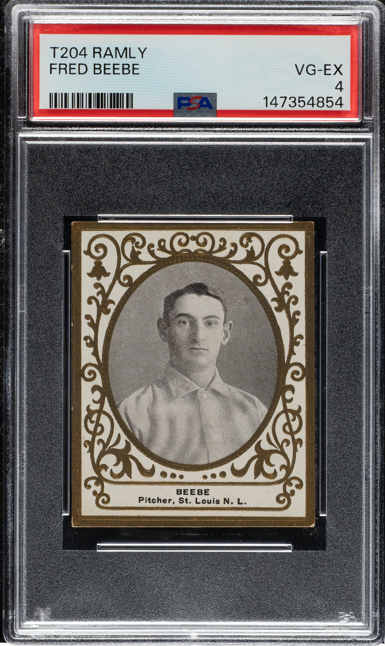 Graded VG-EX 4 by PSA (submitted by REA). St. Louis Cardinals. This card is part of an exciting, fresh-to-the-hobby find of T204 Ramly cards that were saved by the family of the original owner who lived in the New England area, all consigned to REA's Spring 2026 and future auctions.
