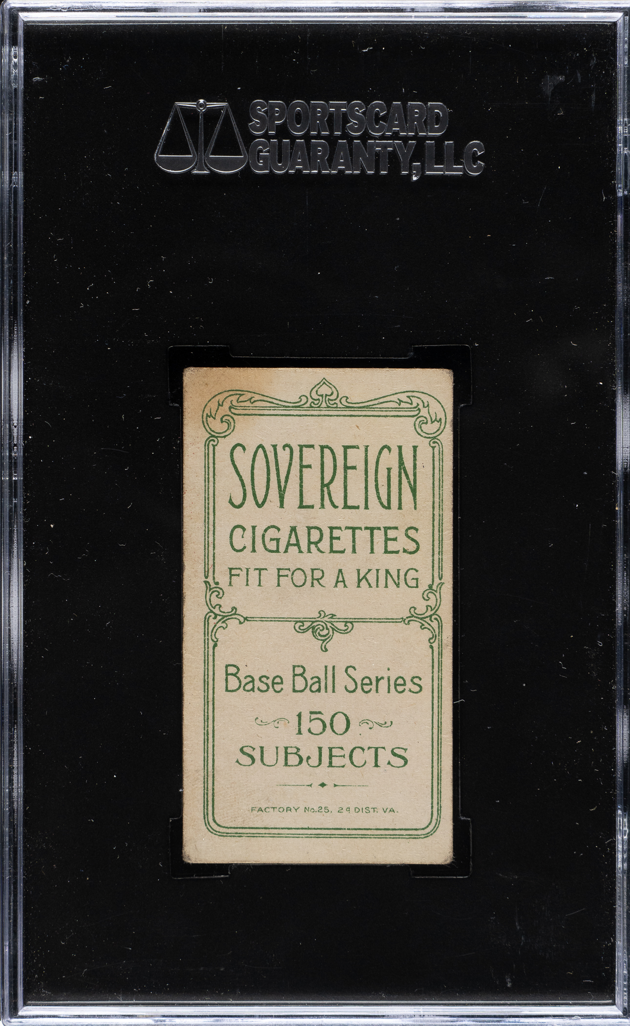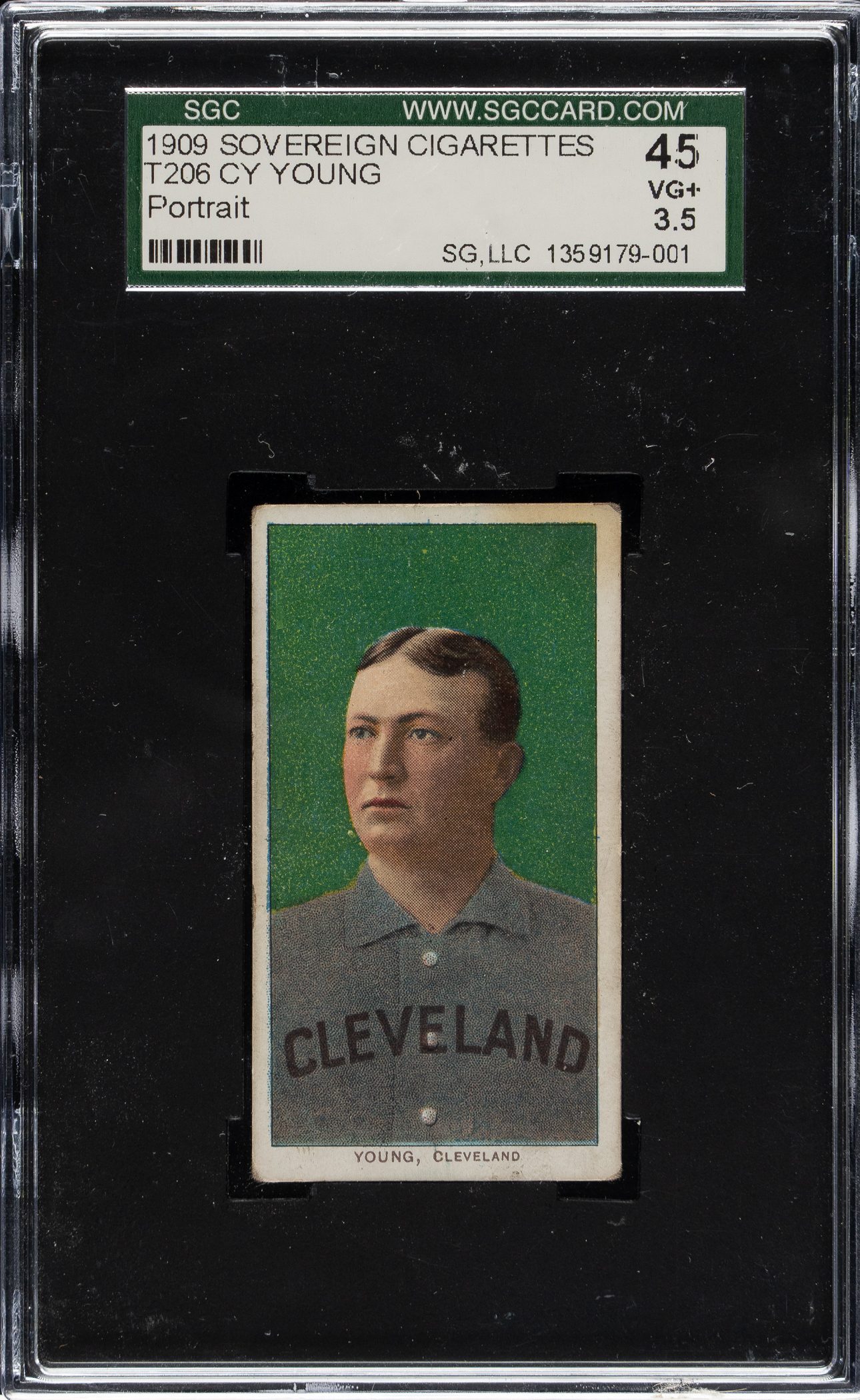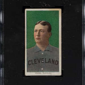 Graded VG+ 45 by SGC. Every player has his classic card, and for Cleveland Naps Hall of Famer Cy Young (to many), it is his T206 portrait set against a stunning green background. It is one of the most recognizable of all vintage cards and one of the most popular cards in the entire T206 set. The offered example is all the more noteworthy as the reverse has an advertisement for Sovereign 150 Cigarettes. The offered card has bold colors, a focused image, and honest corner wear. The important advertising reverse is boldly printed and mostly clean.