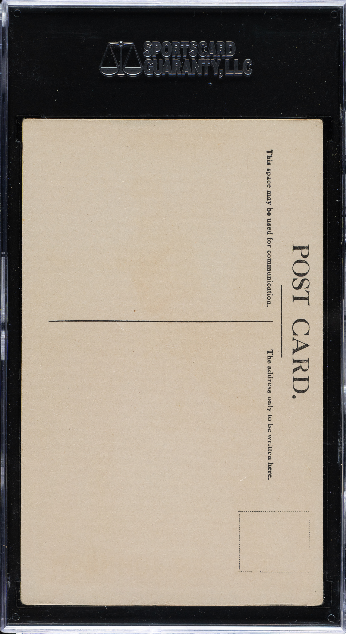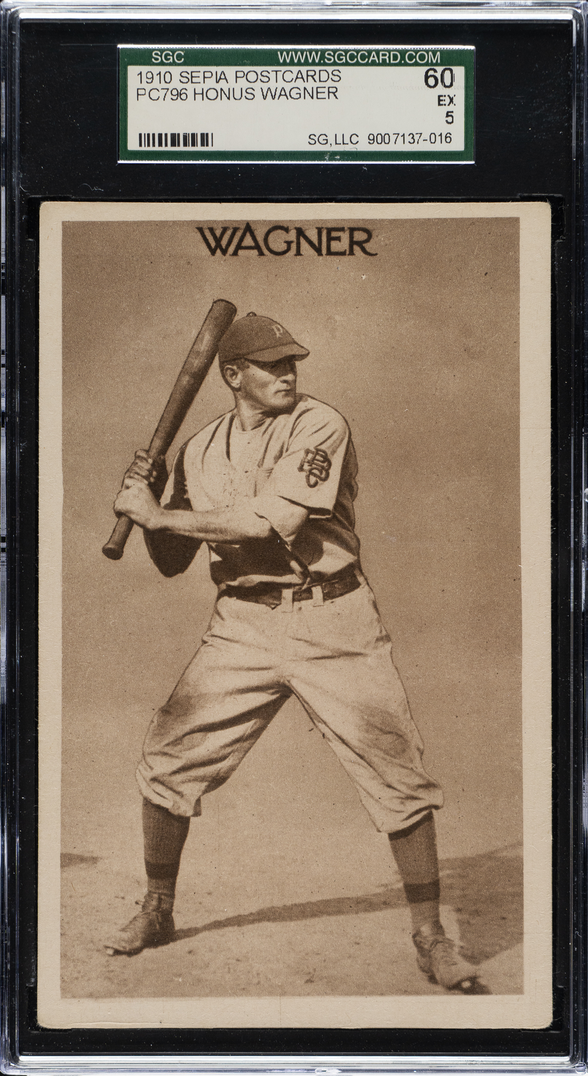 Graded EX 60 by SGC. One of only three examples graded at this level with one higher. Outstanding example of one of the key cards from this rare and extremely popular 25-card sepia-toned postcard set, featuring legendary Pittsburgh Pirates Hall of Famer Honus Wagner. The manufacturer of this sepia-toned postcard series is unknown. The PC796 set is one of the most striking sets of the era. This is a particularly magnificent example of one of the most impressive of all Wagner cards. Bright and crisp, both front and back, with light, even wear to the corners. The card has never been mailed and has no writing on its traditional postcard reverse. This is an exceptionally stunning card of Honus Wagner from one of the most distinctive and popular of all postcard issues, which would be a significant addition to any world-class Hall of Fame or prewar-card collection. Dimensions: 3.5 x 5.5 inches.