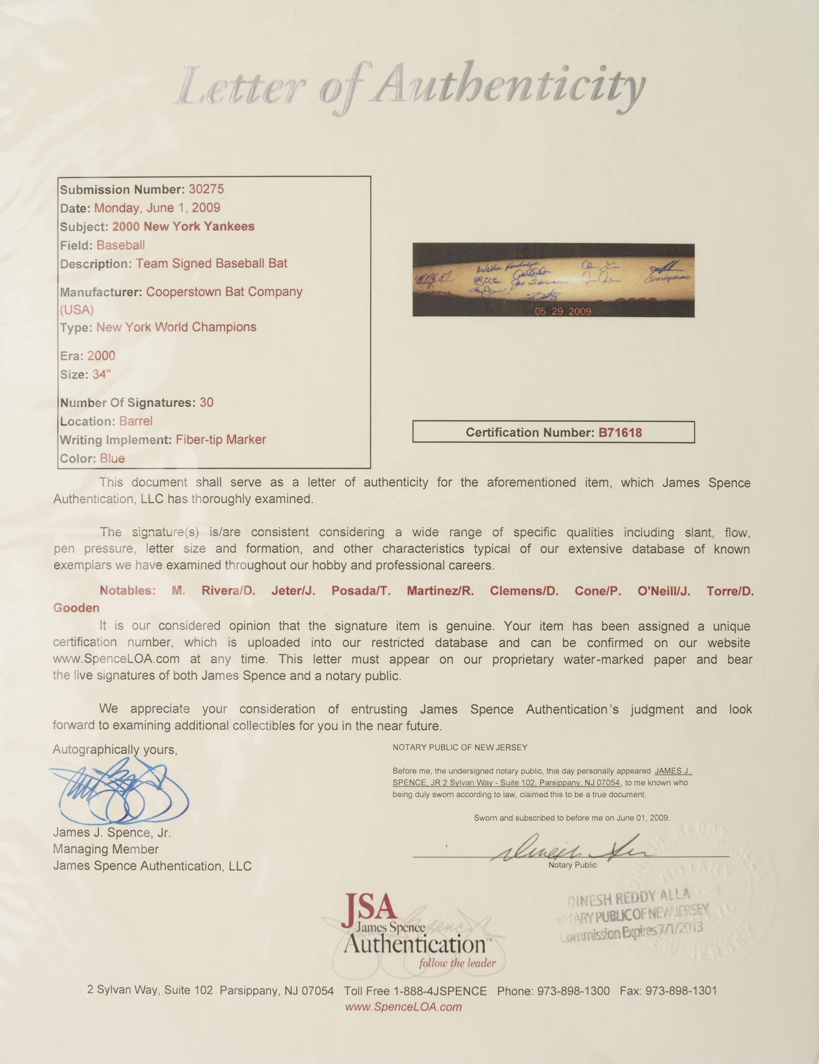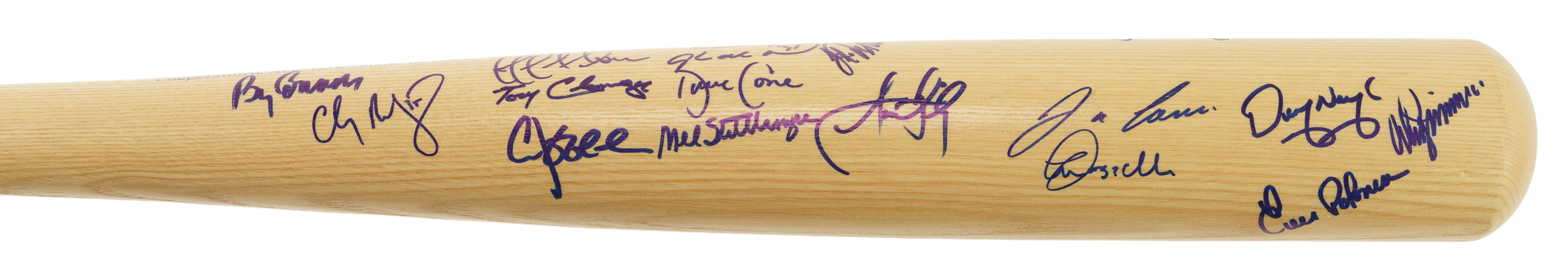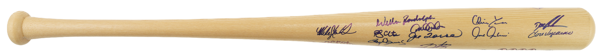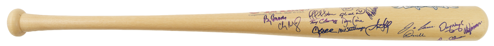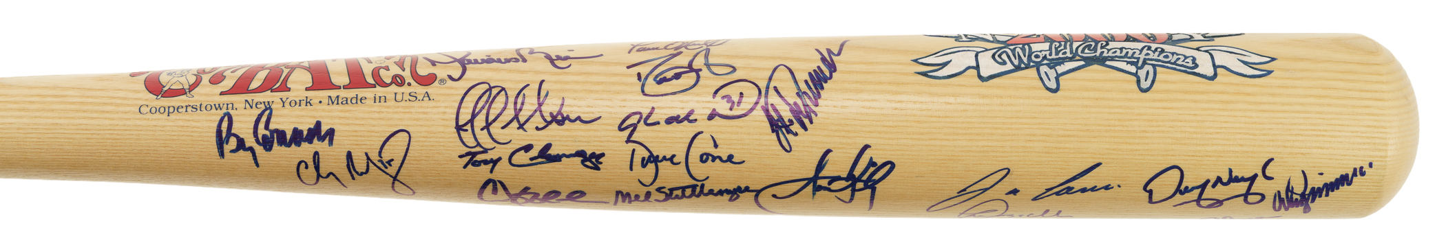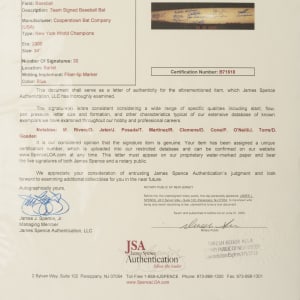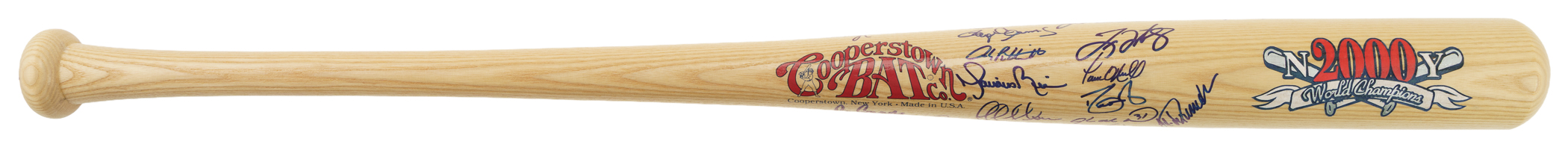 Cooperstown Bat company commemorative bat signed in blue Sharpie by 30 members of the 2000 New York Yankees World Championship team. Notable signatures include Torre (Mgr.), Jeter, Clemens, Cone, Pettitte, O'Neill, Rivera, Gooden, Zimmer (coach), Randolph (coach), and Stottlemyre (coach). The bat measures 34 inches in length and is in Near Mint condition. Full LOA from James Spence/JSA (a corresponding sticker affixed to the knob). The size/weight of this item requires that there will be an additional shipping charge for this lot.