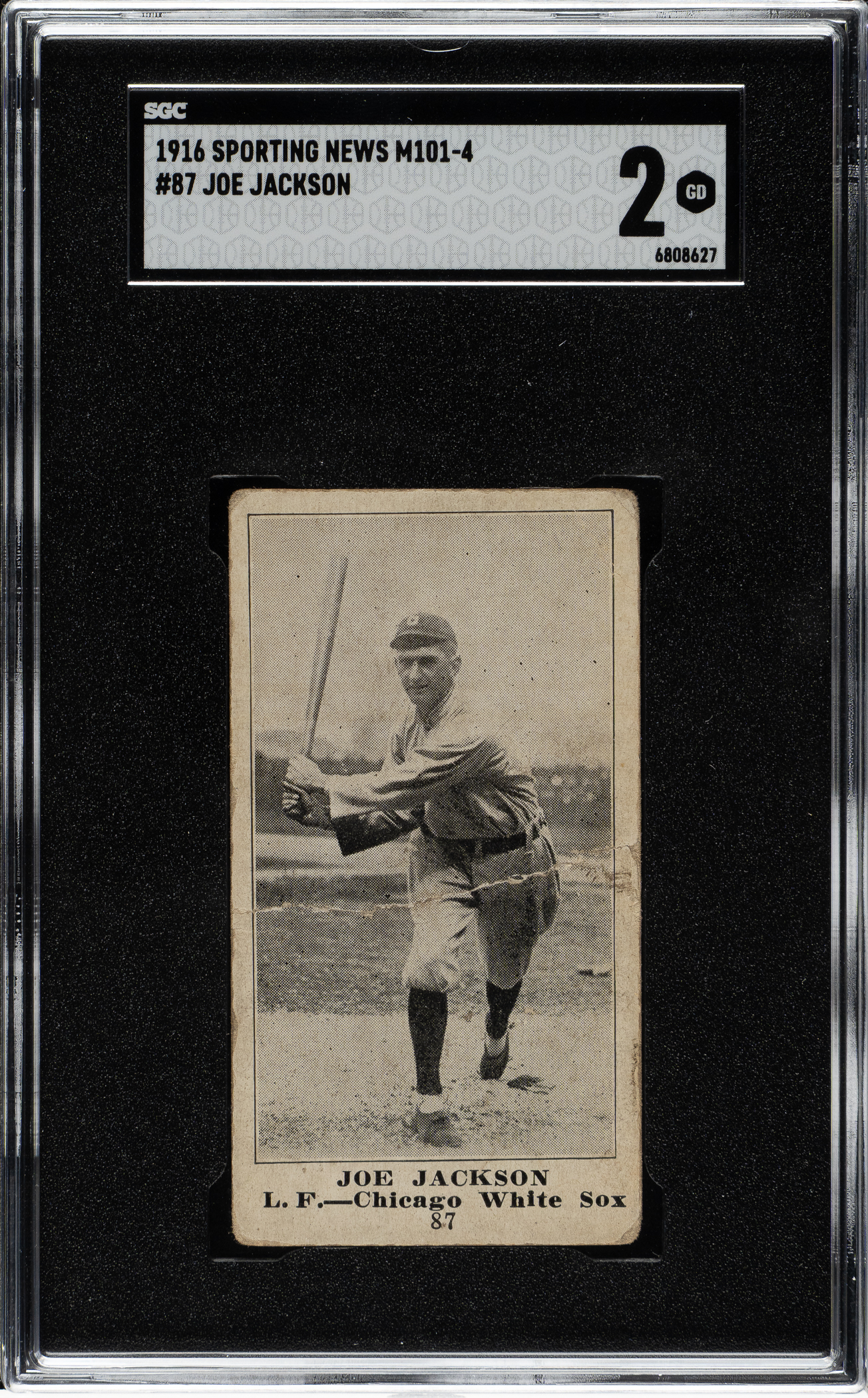 Graded GOOD 2 by SGC. Presented is a modestly graded example of Joe Jackson's classic 1916 M101-4 Sporting News card. This is one of Jackson's most desirable cards and it is very rarely offered! The Sporting News advertisement appears on the reverse. Though this card was issued with a blank reverse or with one of many different regional advertisements, the M101-4 set has always been referred to as issued by The Sporting News in honor of its most prominent sponsor. This example boasts outstanding image clarity, honest corner wear, and a heavy crease extending across the center. The important advertising reverse is boldly printed. Despite playing for 13 years before his banishment, very few cards of Joe Jackson were issued during his playing days. He was not a regular in 1910 and was not included in the tobacco issues of that time. He was banned from baseball following the 1920 season, so he did not make it into the popular American Caramel and related issues of 1921. Besides a few strip-card issues, there are just not many cards that feature Jackson with his infamous team, the White Sox. The Sporting News and associated sets are by far the most popular of all his White Sox cards as they picture him in a classic Conlon batting pose. This is, in fact, the same picture that is used for his Cracker Jack card. Despite the obvious condition flaws, this is a striking example of one of the most significant and highly prized of all Joe Jackson baseball cards.